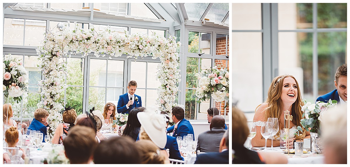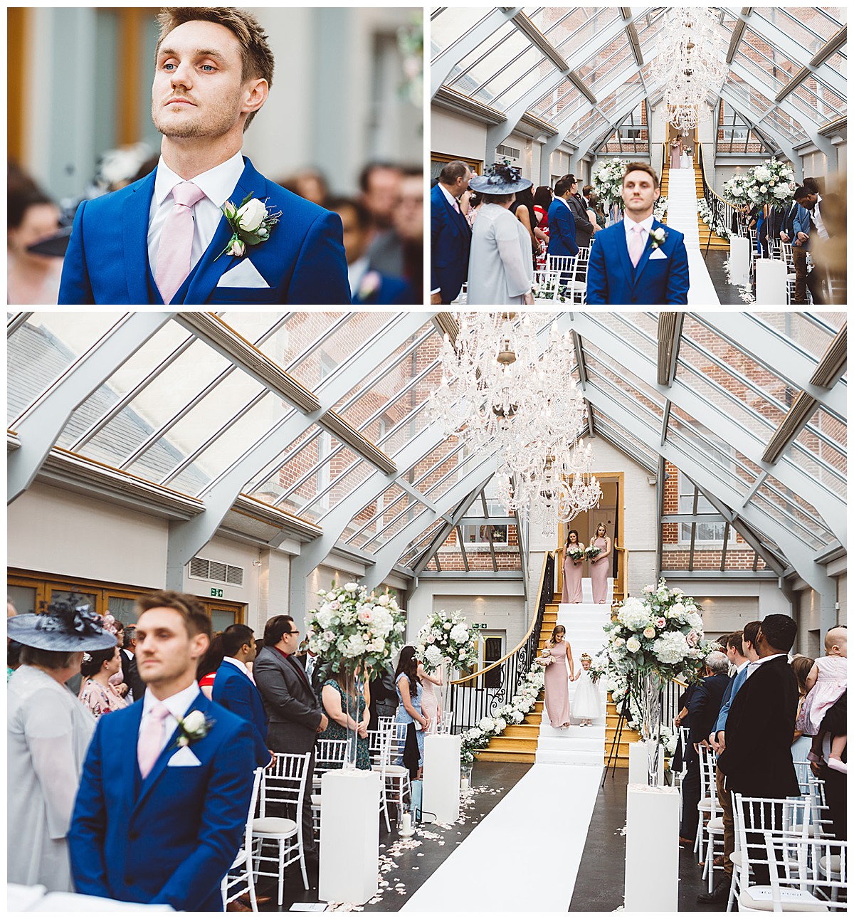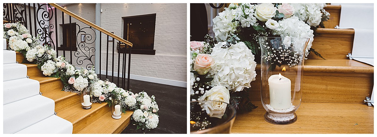 Becky & Pete were the ultimate laid back couple and above all they wanted to achieve a natural and more laid back effect, and create a sense of a floral aisle, to walk down.  Ideally with a more rustic touch to it all, and a sense of bringing the outside in.   Becky had approached a few other florists and her search for the perfect Botleys Mansion suppliers was quite lengthy by all accounts, but we were privileged to win her over.  She loved the blossom arch that we showed her and our moodboard of pretty florals with a natural vibe and rustic touches, but liked that it was nicely tuned to be equally at home in the elegant and rather modern atrium space, which has a contemporary glasshouse feel.
