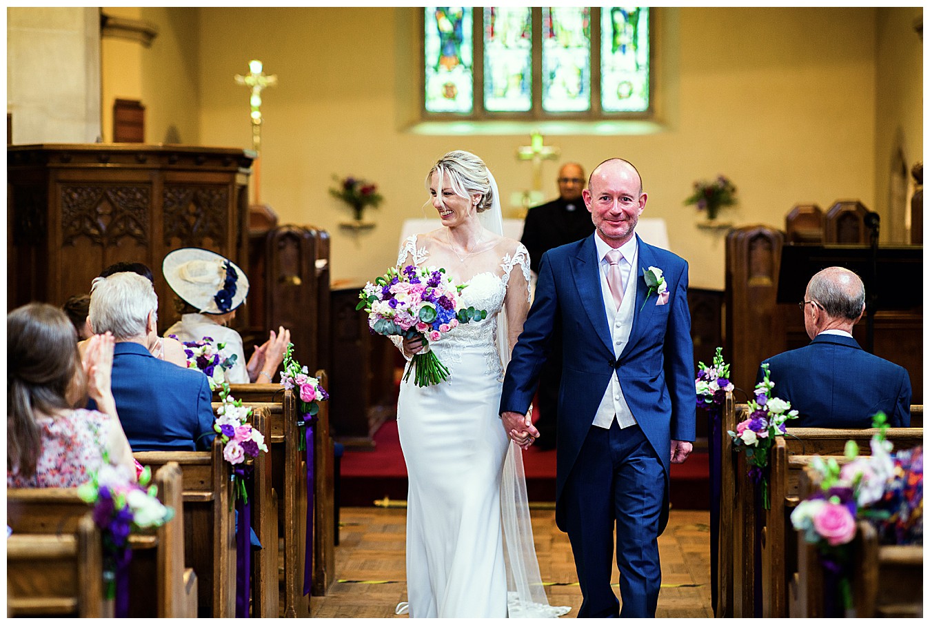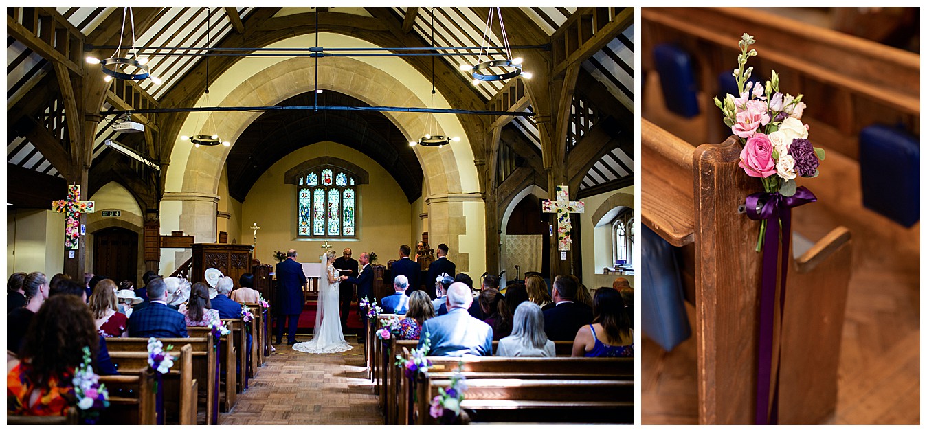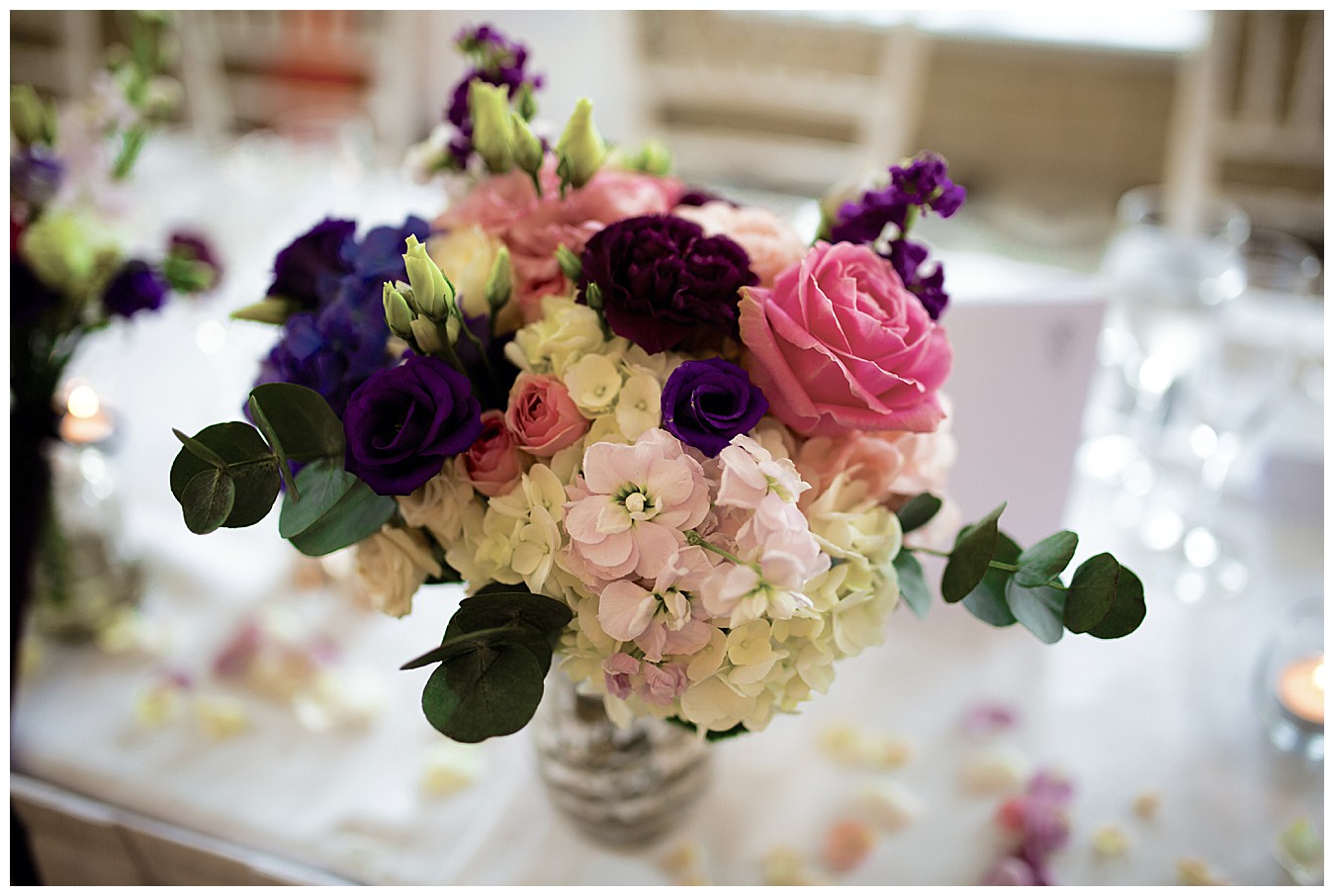 For the colourful wedding flowers centrepieces we used a mix of blousy hydrangeas, roses, scented stocks, lisiathus and spray roses in bold shades of jewel toned purple and pinks, with sage green eucalyptus for contrast. Elegant silver glassware added the finishing touches and to complete the look, the pretty church posies were brought back and repurposed, along with the bouquets, to dress the long top table.