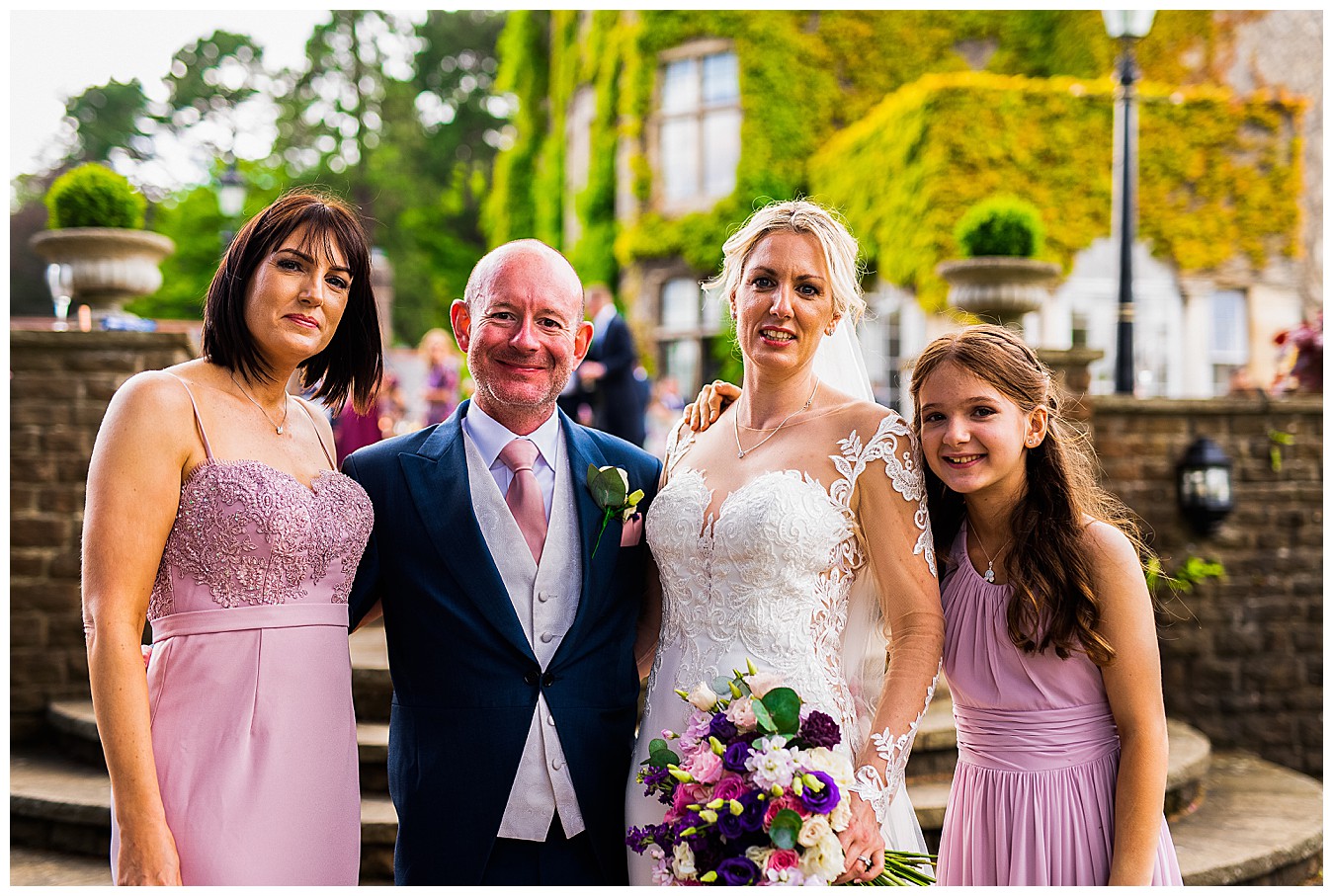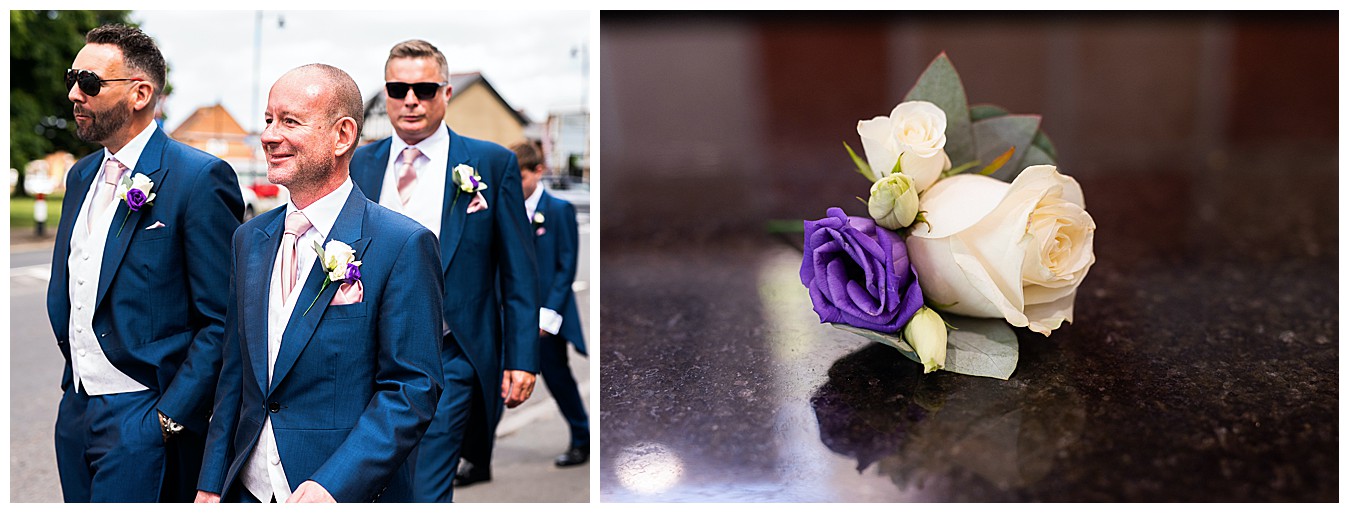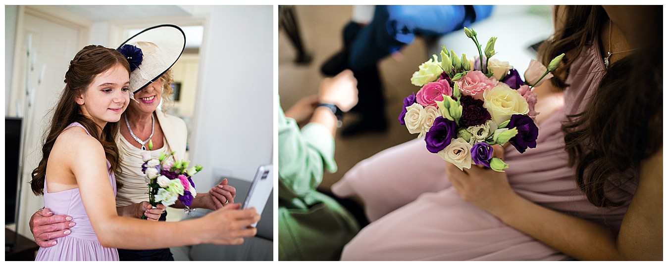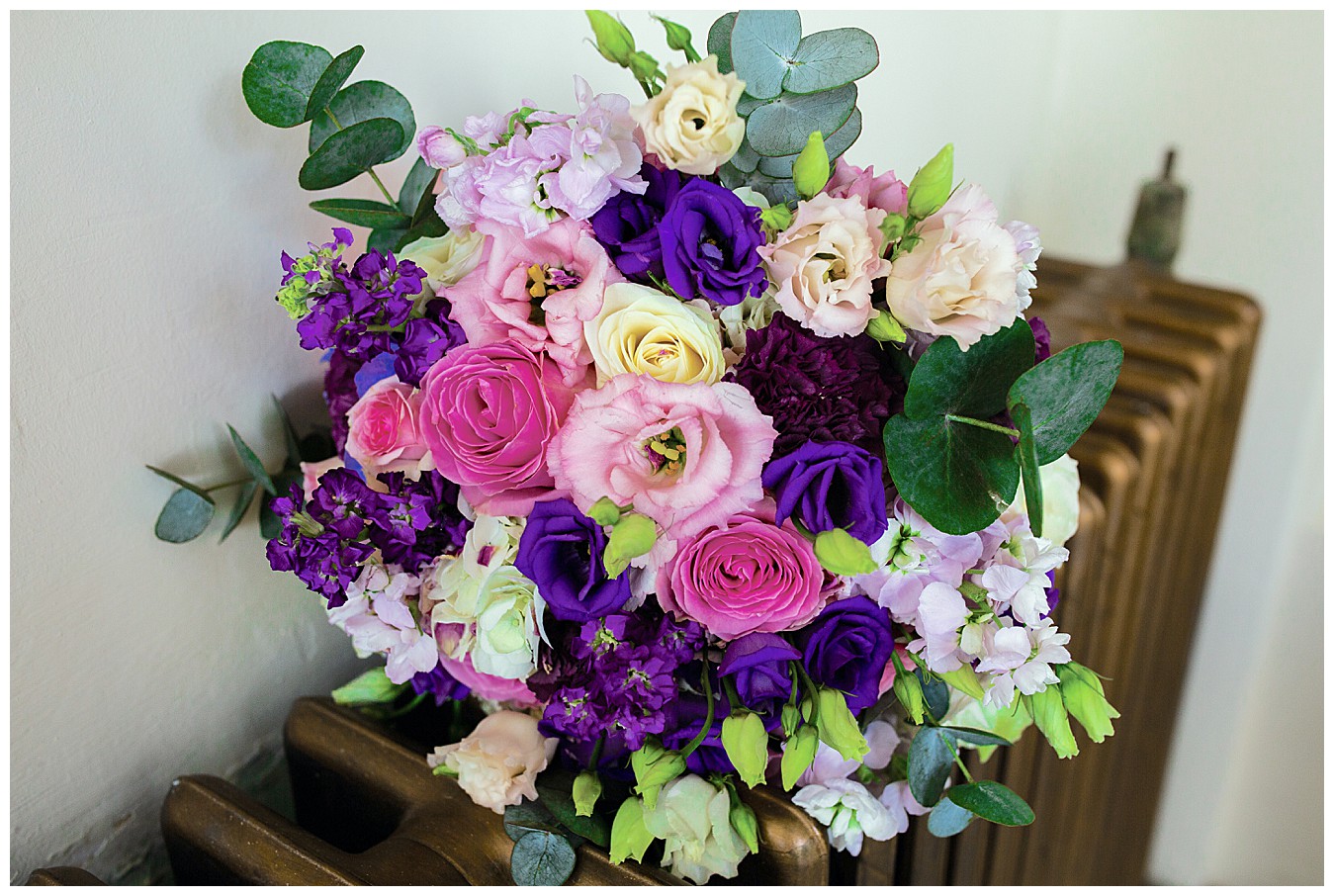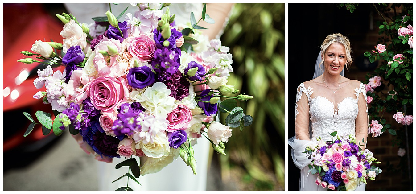 For Laura’s colourful flowers we created beautiful colourful bouquets with a happy mix of deep Cadbury purple and bright pinks, with accents of dusty pink, blush and plum. Tim and his groomsmen wore buttonholes of Avalanche roses and deep purple lisianthus, and the bridesmaid and flower girl matched with Laura’s bouquet and looked lovely in pale dusty pink dresses giving the flowers the neutral backdrop to shine.