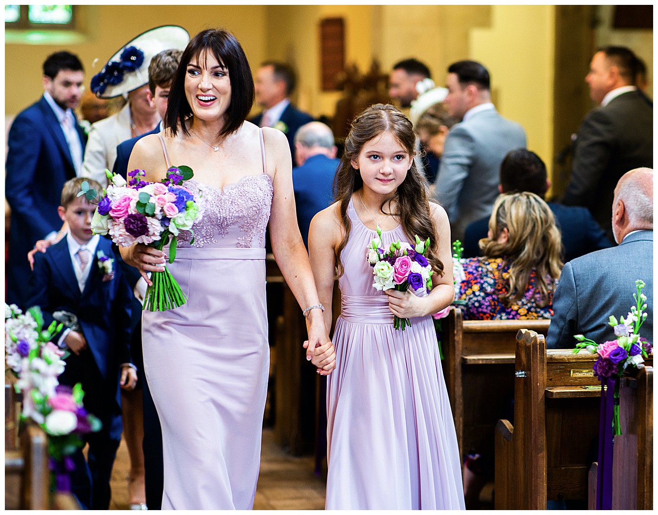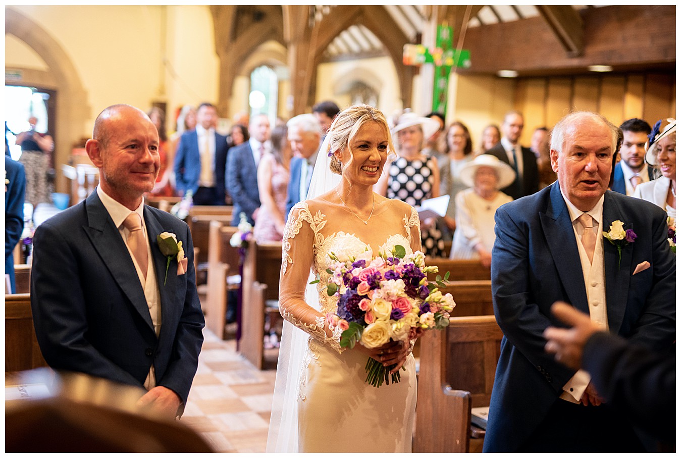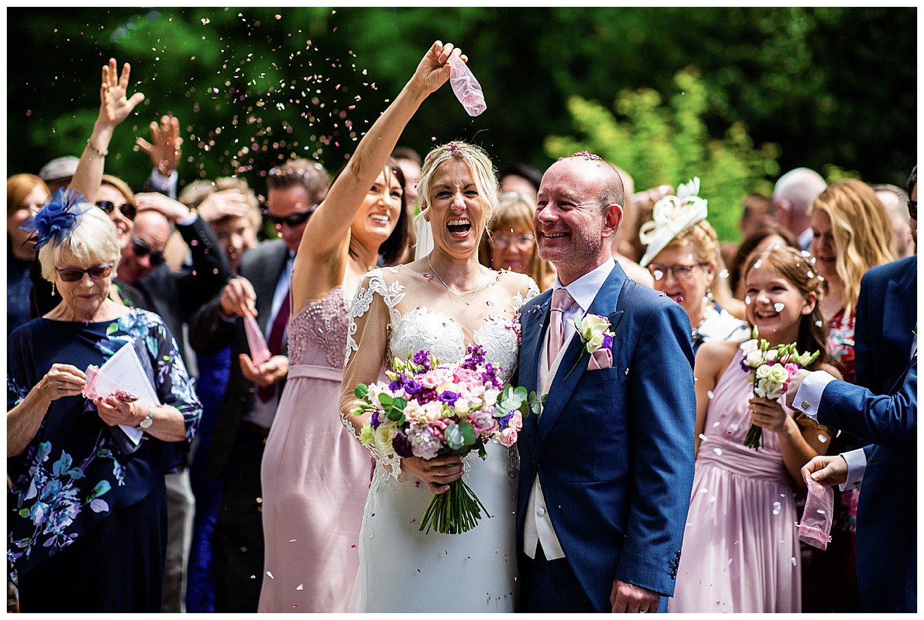 For Laura’s colourful flowers we created beautiful colourful bouquets with a happy mix of deep Cadbury purple and bright pinks, with accents of dusty pink, blush and plum. Tim and his groomsmen wore buttonholes of Avalanche roses and deep purple lisianthus, and the bridesmaid and flower girl matched with Laura’s bouquet and looked lovely in pale dusty pink dresses giving the flowers the neutral backdrop to shine.