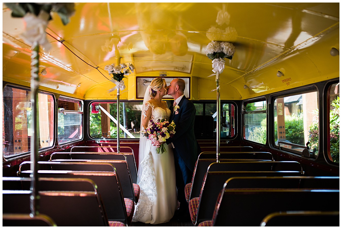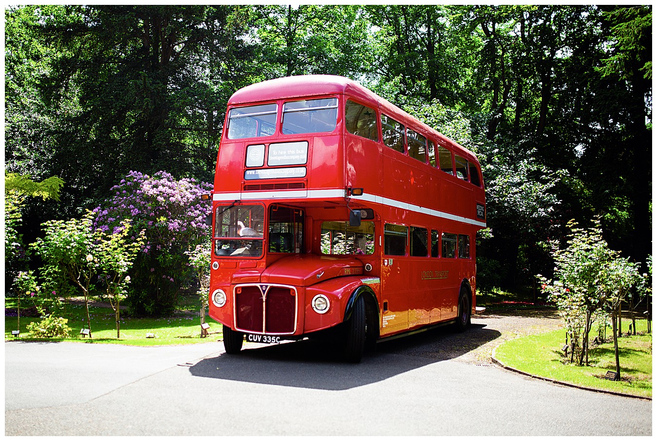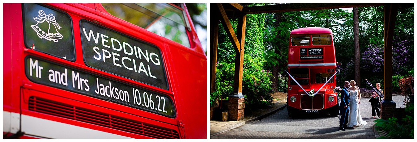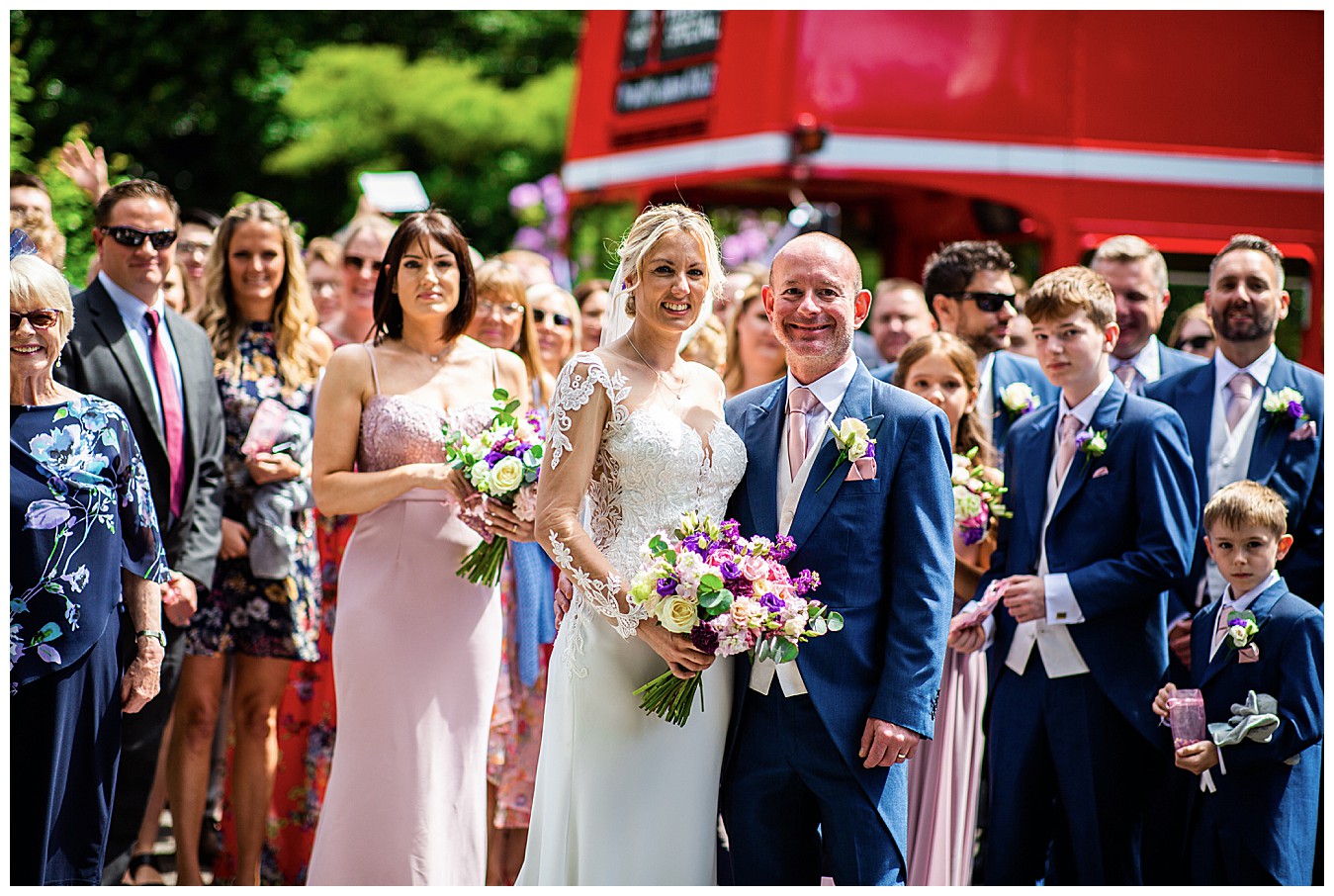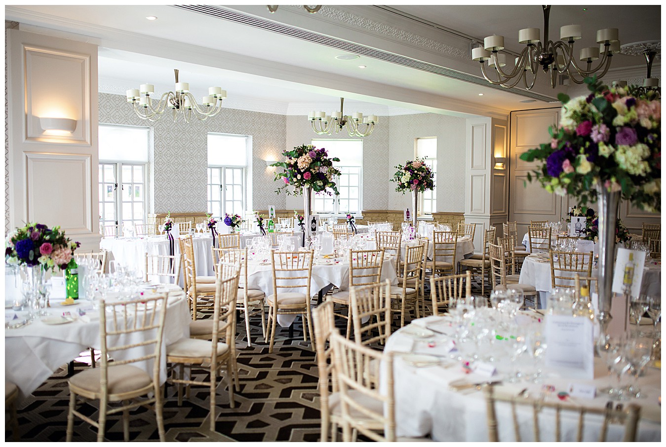 Laura & Tim were married at St. Andrew’s Church in Frimley and we decorated the lovely old church simply with pops of colour from pew end posies down he aisle. The lucky wedding guests, blessed with beautiful June sunshine, then boarded the fabulous red London wedding bus and arrived at Pennyhill Park for the wedding reception, ready to have a fantastic day and evening. Photos and canapés and drinks were served outside in the beautifully landscaped terrace gardens and the the wedding breakfast was held in the lofty Balmoral Suite at Penyhill Park. Laura and Tim’s faces full of joy as they entered the Balmoral and saw how fabulous the room looked, was a real joy to see in photos.