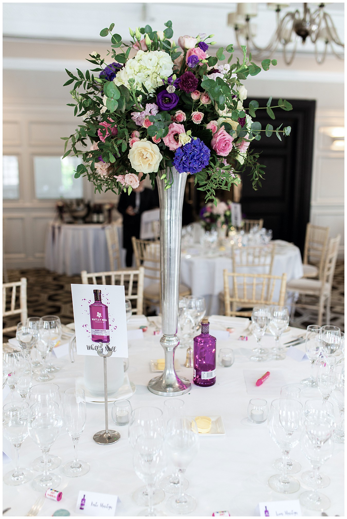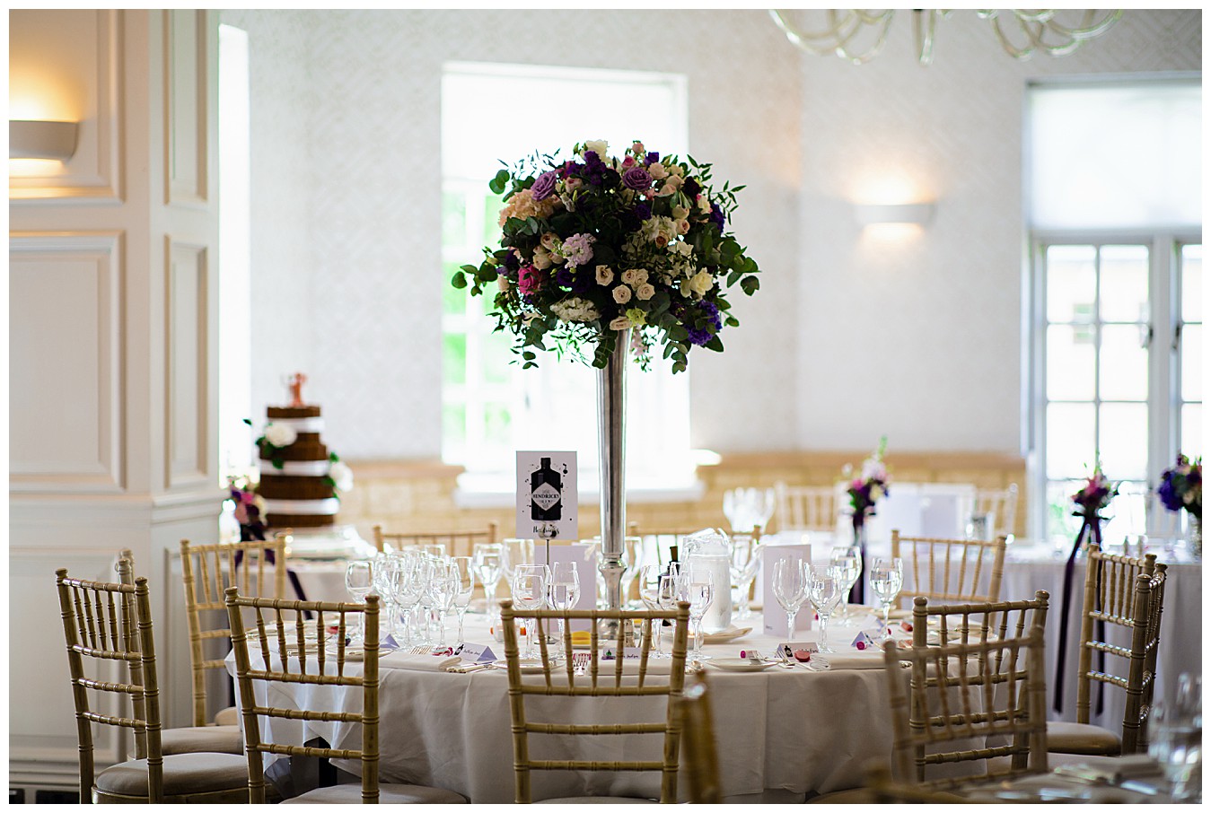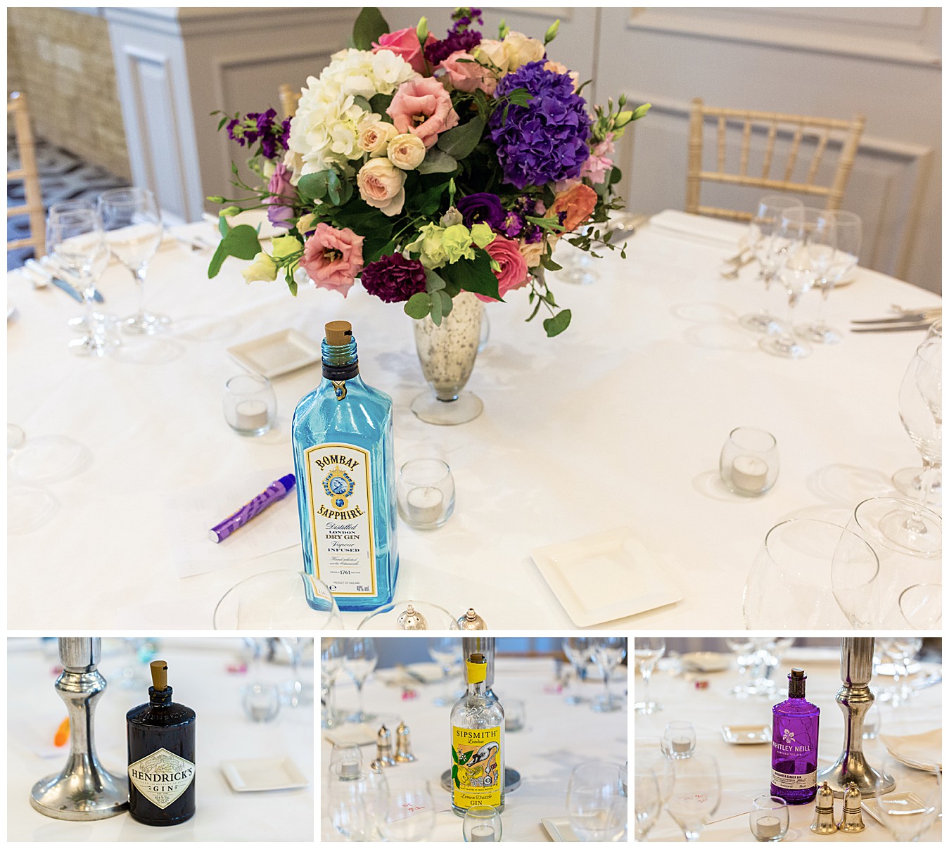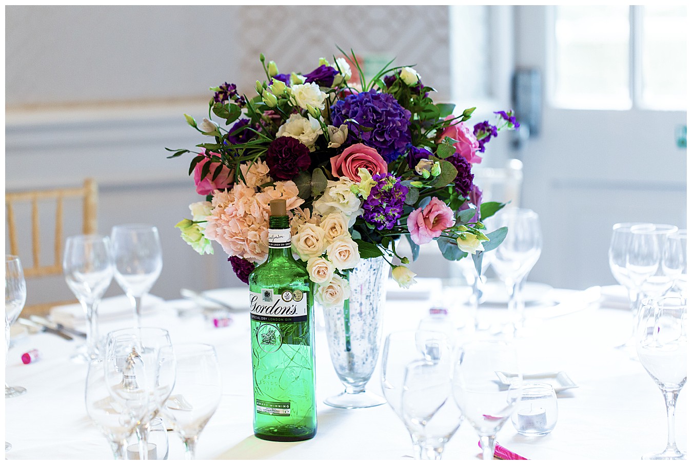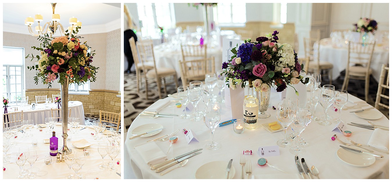 The room was boldly dressed with a mix of tall and low floral centrepieces full of colourful wedding flowers in hues of deep purple, plum, pink and dashes of ivory and cute mini Gin bottles were there to remind us of the inspiration for this fun theme. Each table had names and favours of well known gins – Tanqueray, Sipsmith, Bombay Saphire, Silent Pool, Hendricks, Gordon’s , Edinburgh and Whitley Neill, and the top table was names after their favourite – Tanqueray.