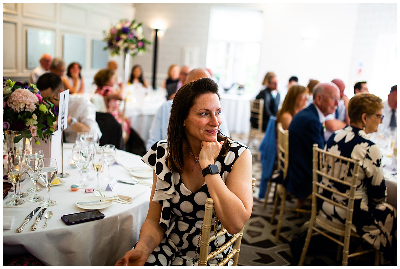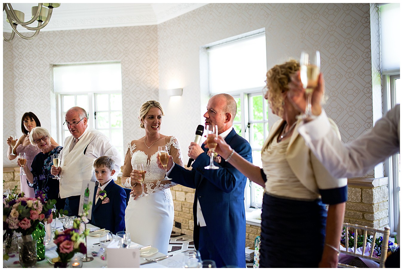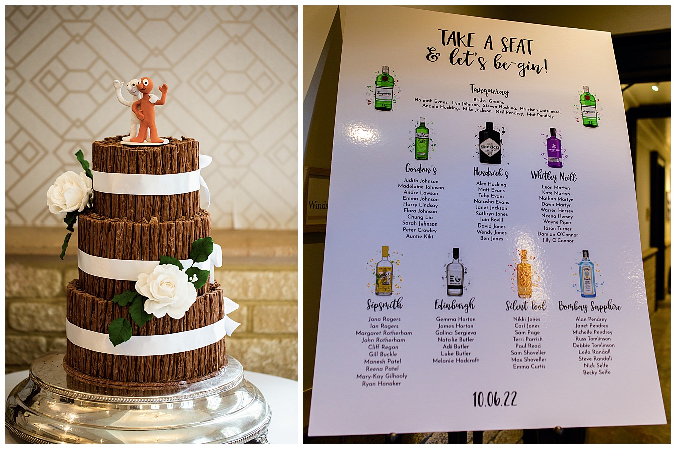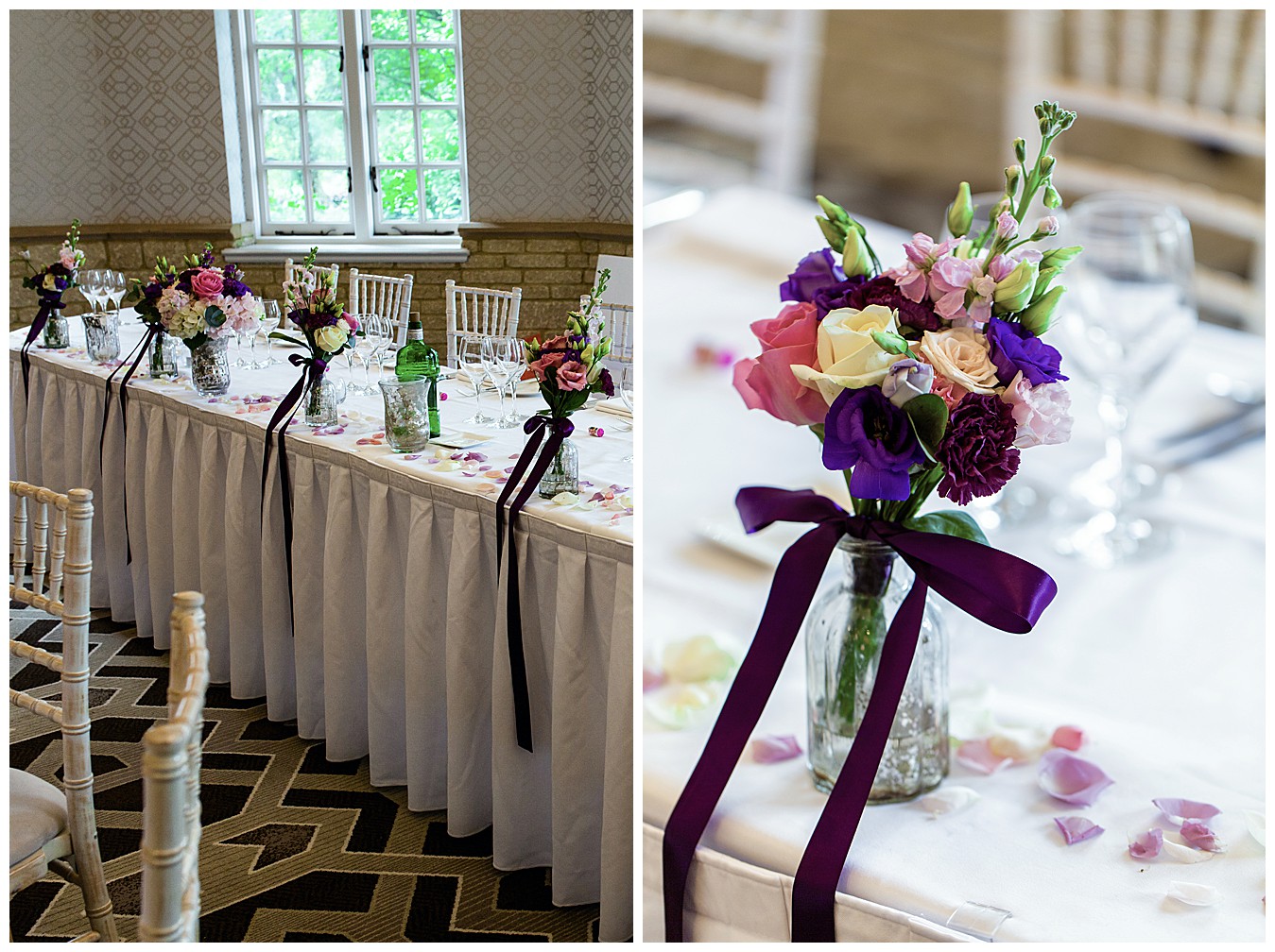 The room was boldly dressed with a mix of tall and low floral centrepieces full of colourful wedding flowers in hues of deep purple, plum, pink and dashes of ivory and cute mini Gin bottles were there to remind us of the inspiration for this fun theme. Each table had names and favours of well known gins – Tanqueray, Sipsmith, Bombay Saphire, Silent Pool, Hendricks, Gordon’s , Edinburgh and Whitley Neill, and the top table was names after their favourite – Tanqueray.