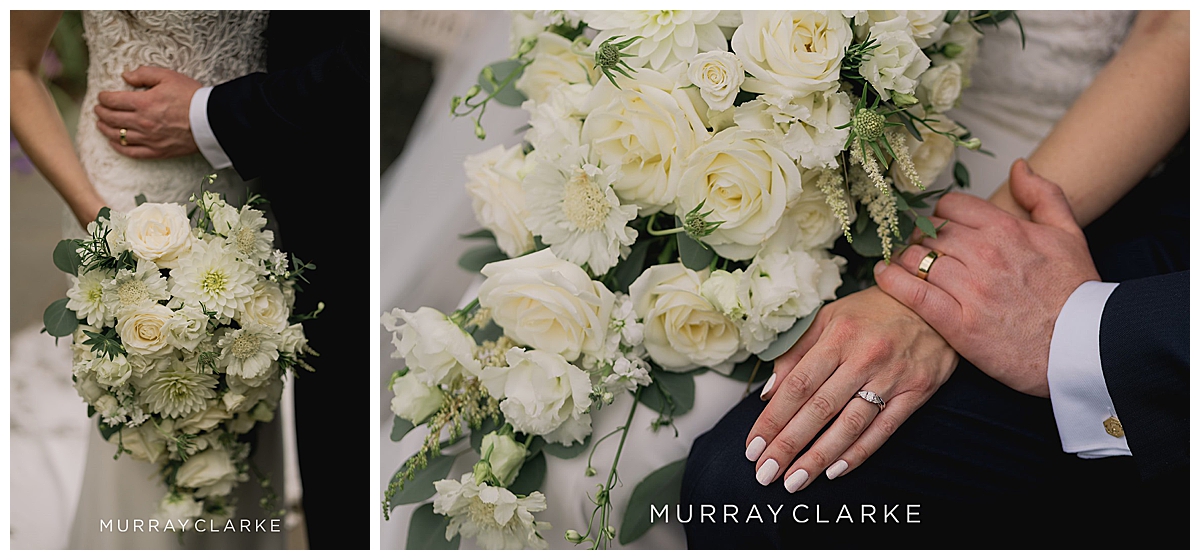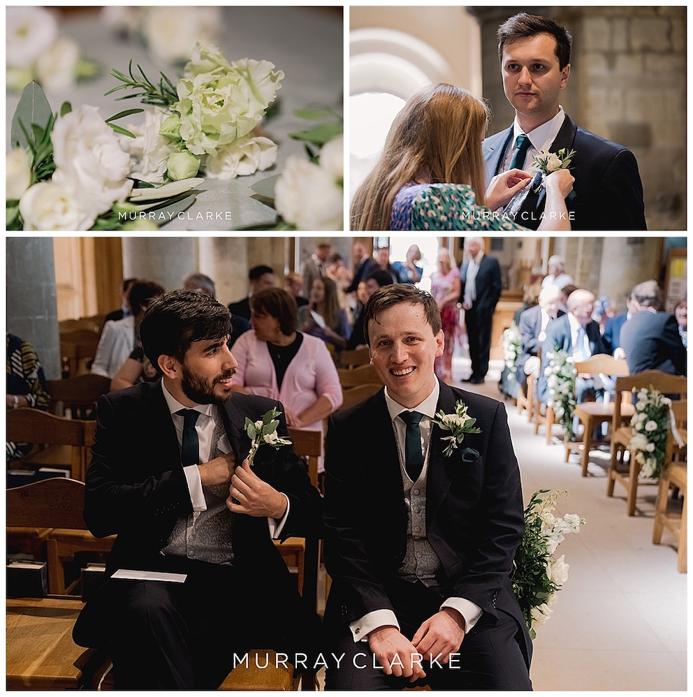 For Vicky’s tear drop bouquet I used a gorgeous blend of ivory roses, lisianthus, dahlias and astilbe, and matched this for the bridesmaids, with smaller more rounded hand-tied bouquets. The men wore rustic buttonholes of spray roses, lisianthus, eucalyptus and olive sprigs. When I delivered the bouquets to Vicky’s parent’s house, I was greeted by much excitement and words of praise, but fearful of make up getting ruined, Vicky’s mum managed to hold back the tears luckily.