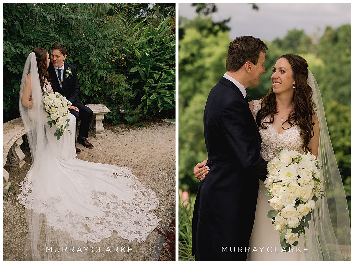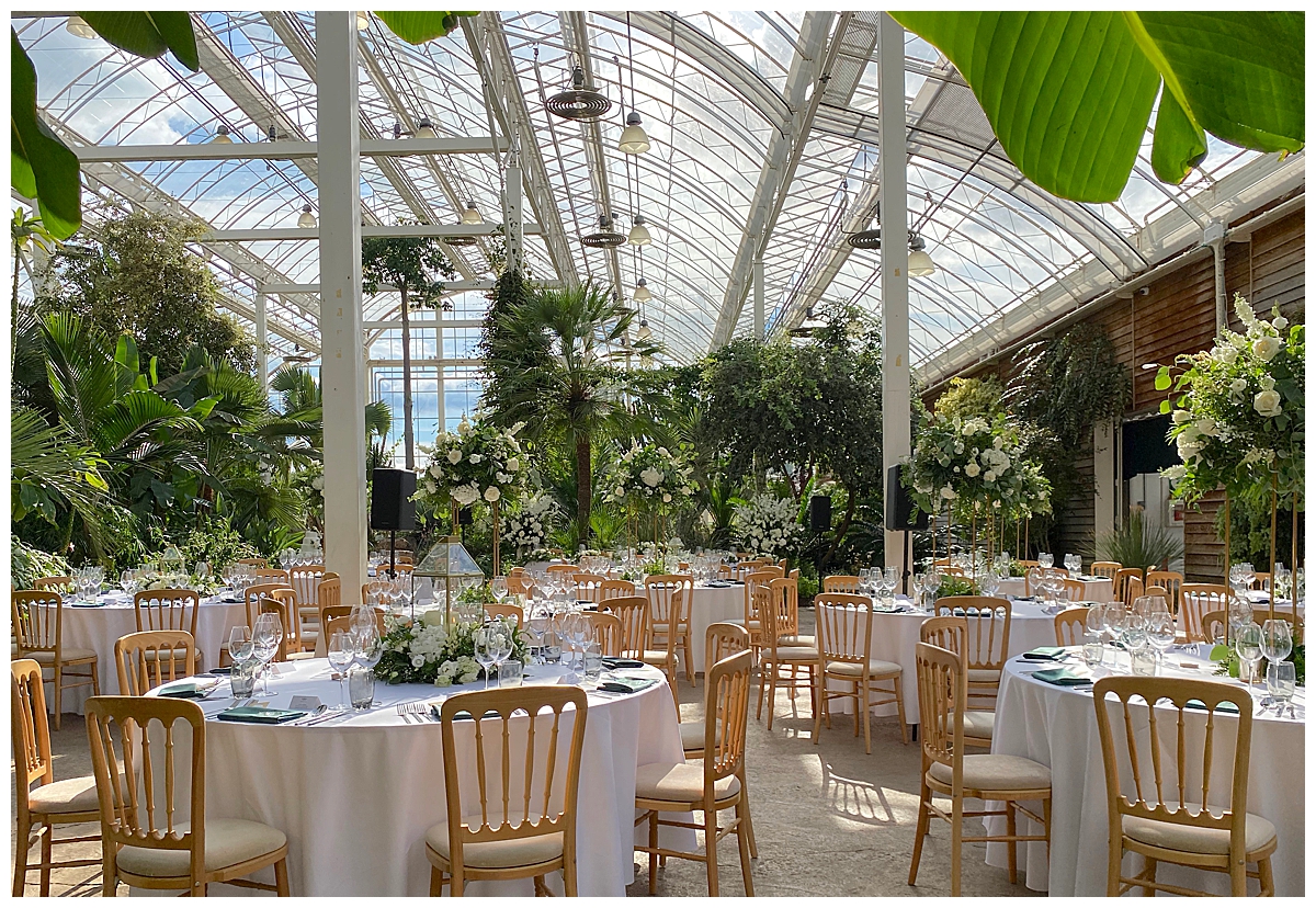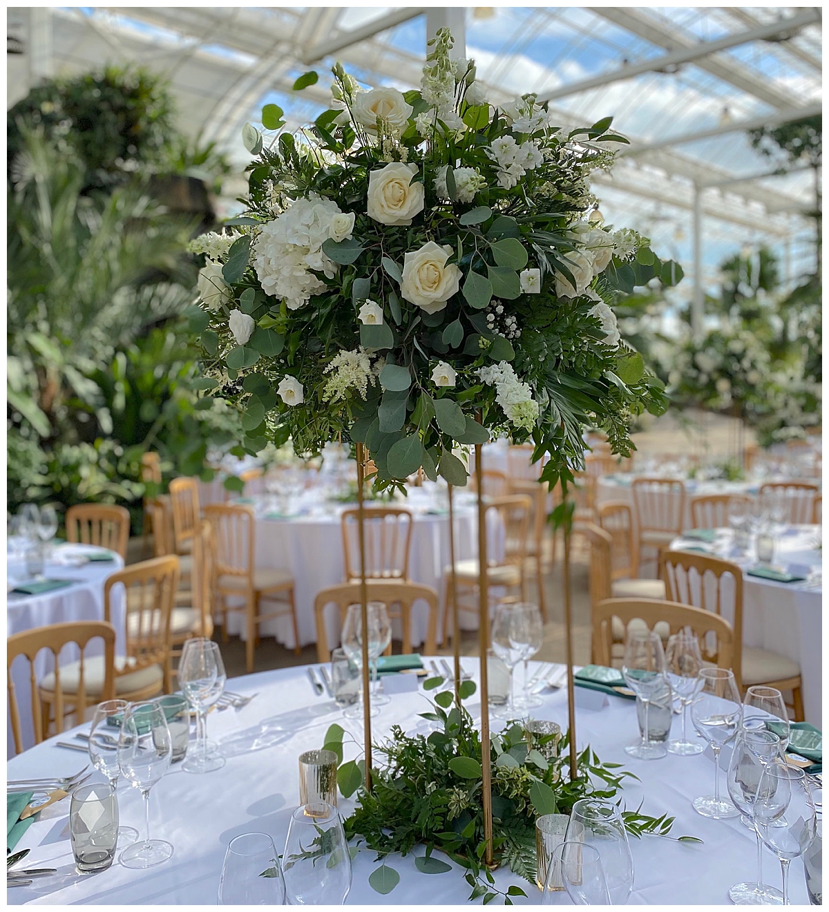 6 months out or so before the wedding, as this was to be my first time at the venue in a professional capacity as a Wisley wedding florist, I had a quick orientation visit and discovered that within the amazing grounds at Wisley Gardens, there are in fact several places which can host a wedding or event. If you’d like to find out more please take a peak here. There is a choice between the aptly named Hilltop Garden Room, the Waterlily Pavilion which overlooks the landscaped pond, the Butterly Lovers Chinese-style Pavilion by the lake, and last but most definitely not the least – the stunning Glasshouse full of tropical plants and trees which is available for weddings June through August only. What a truly magical venue! I really loved going round with the wedding & events team on one of their handy little golf buggies, and being shown the behind the scenes access and unloading. Most of all, on Vicky & Pete’s actual wedding day, I was so happy to be back and entering the temperature controlled plant area of the Glasshouse.