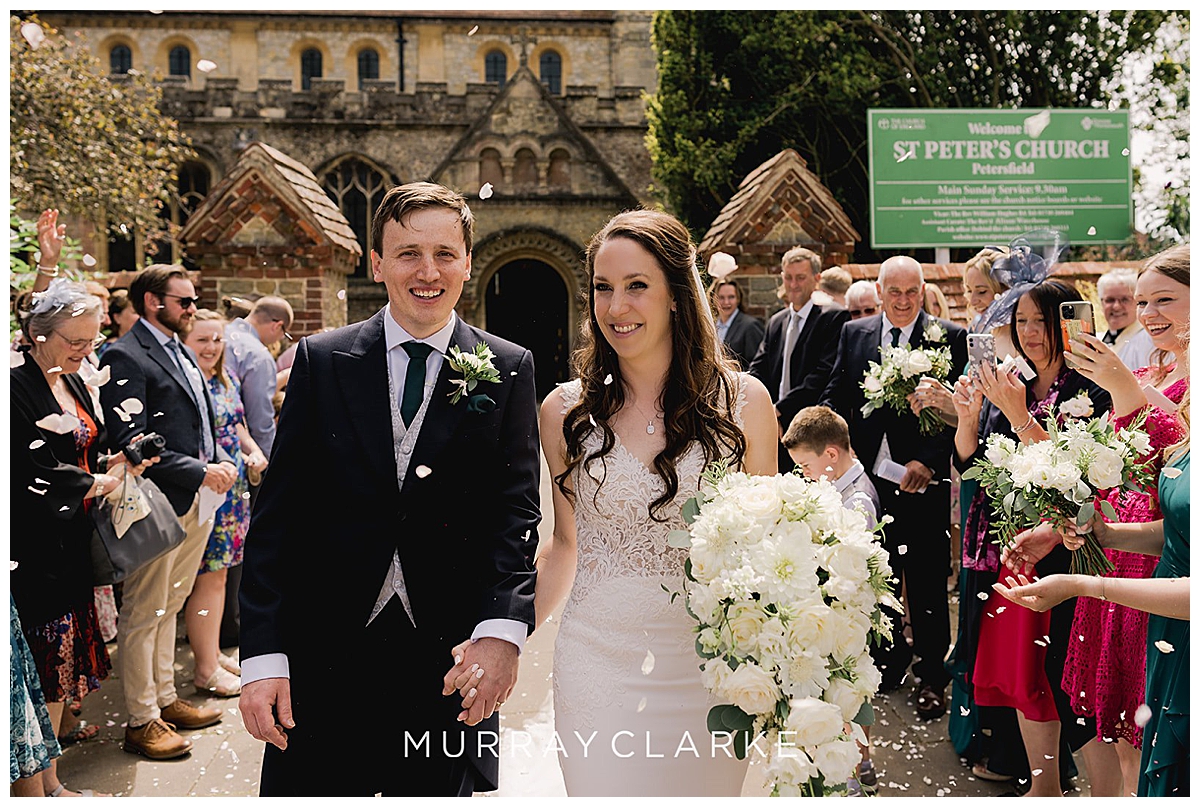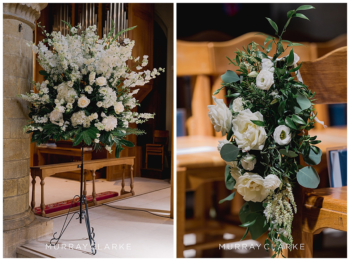 Vicky & Pete got married at St Peter’s Church in Petersfield, a gorgeous old stone church in the heart of the town. Vicky & Pete went full out with the church flowers, with two amazing pedestal displays with tonnes and tones and tonnes of delphiniums, and gorgeous pew end flowers, all of which we brought back with us to reuse during the wedding breakfast.