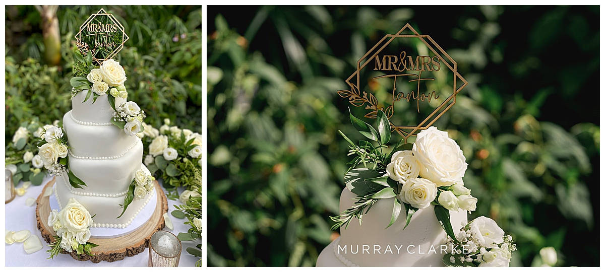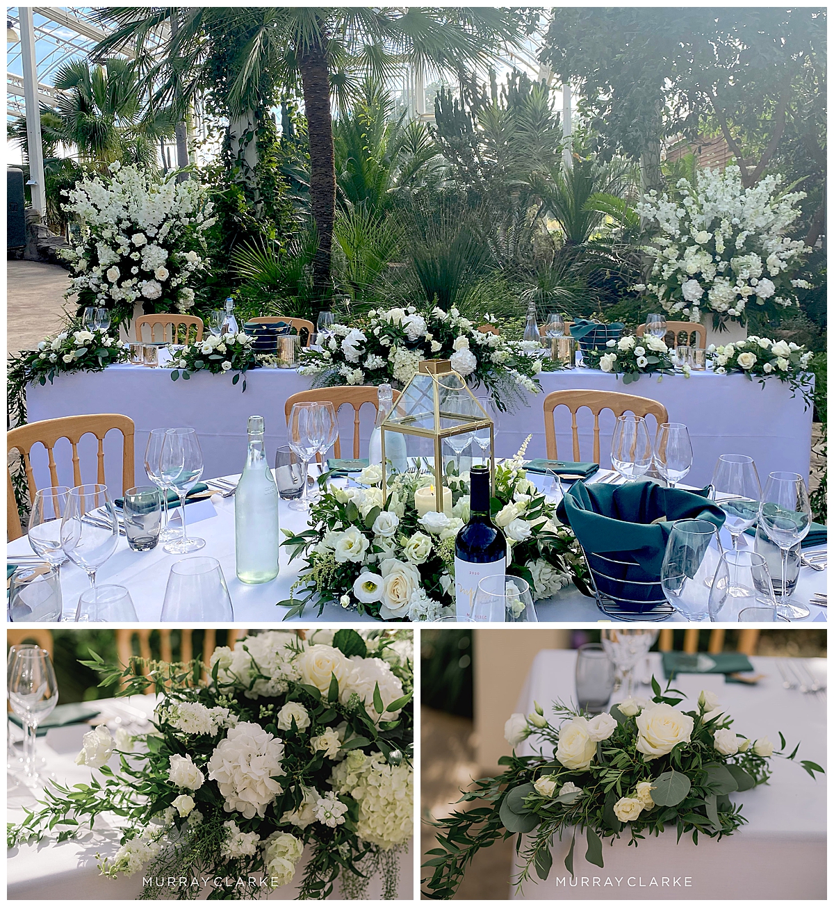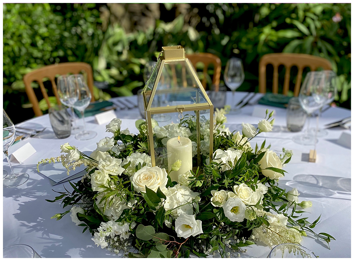 While Vicky, Pete and their lucky guests were having photos and drinks in the terrace outside the Glasshouse, we quickly got busy inside and set up the gorgeous table flowers amongst the lush typical plants and tress, to the beautiful sound of the amazing waterfall. We created gorgeous displays for the guest tables – some were styled with tall dramatic and rather large gold geometric stands centrepieces, while the other half of the tables were dressed with floral wreaths with matching gold geometric lanterns. What they had in common was a pretty mix of roses, hydrangeas, lisianthus, scented stocks and larkspur, with contrasting lush foliage to set them at hime amongst the green surrounding us.