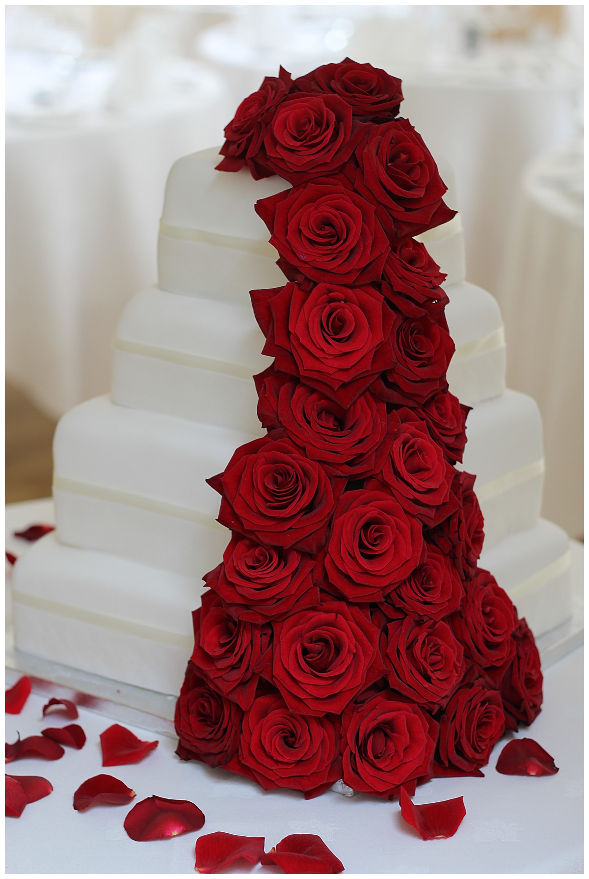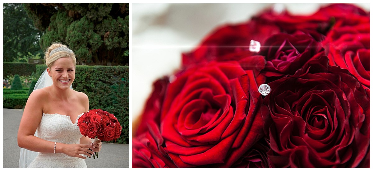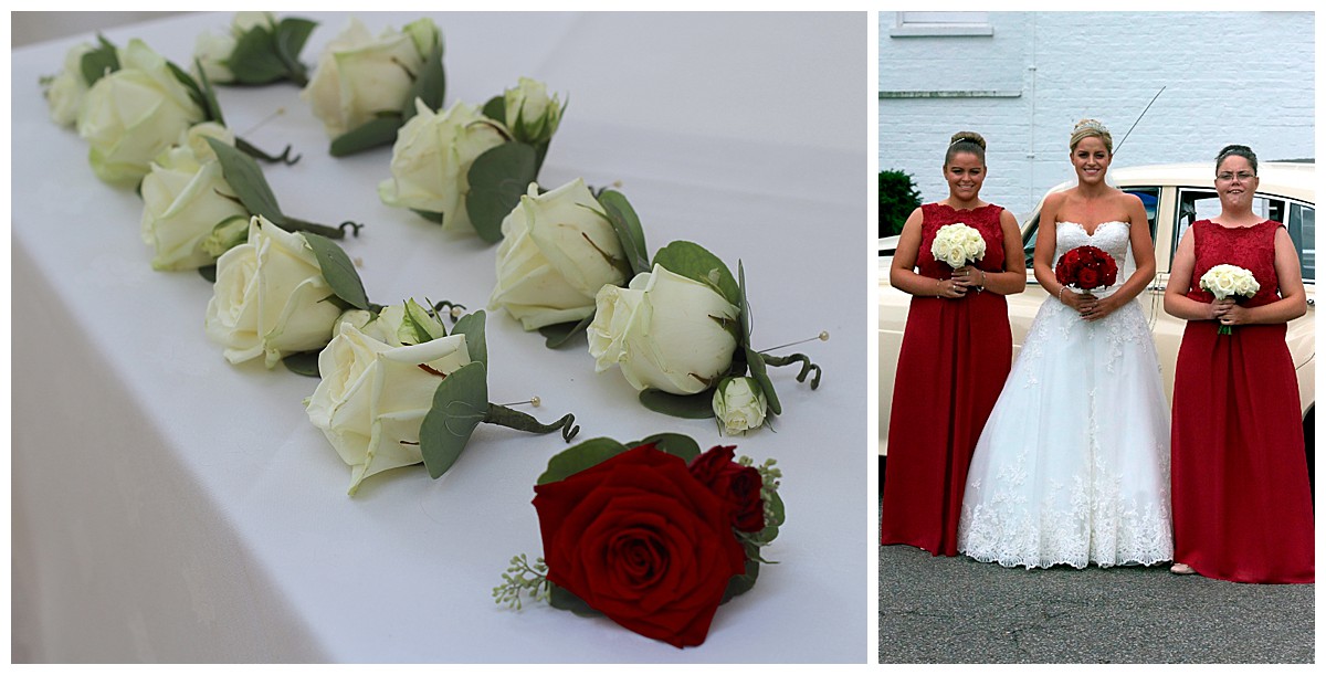 For this dramatic winter wedding at Pembroke Lodge, Katie opted for all red wedding flowers, as a nod to the red roses bouquet that Katie gets every year from Mark, without fail, on the anniversary of their proposal. Katie opted for a neat modern bouquet of red roses with a sparkling of sparkly Swarovski crystals and the bridesmaids carried matching bouquets of ivory roses, while the young flower girl held a small red roses star wand posy. The mens buttonholes echoed this with Mark having a red rose buttonhole, while all other men wore ivory rose buttonholes. This really bold, romantic and powerful look truly transformed the Belvedere Suite. The room is such a lovely and neutral blank canvas that the strong colour scheme, coupled with a long list of softer dreamy touches, made it all come together beautifully. A gorgeous ceiling tulle drape decorated the ceiling and the windows were draped with sheer fabrics and looked amazing, all thanks to Host With Style.