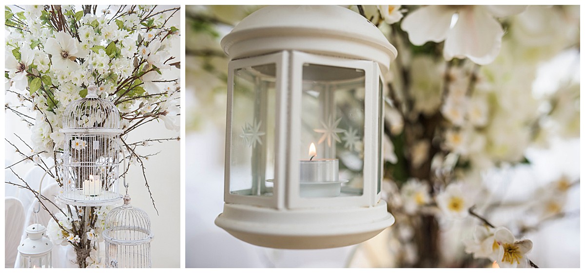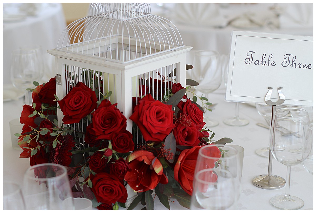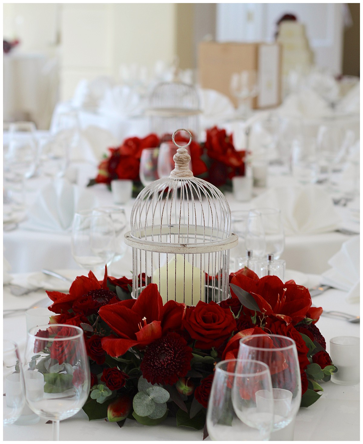 For the wedding breakfast, the guest tables were dressed with the square bird cage centrepieces from the aisle, and additional round bird cage wreath centrepieces to match. Again, the bold choice of colour looked really fantastic against the white table linen.