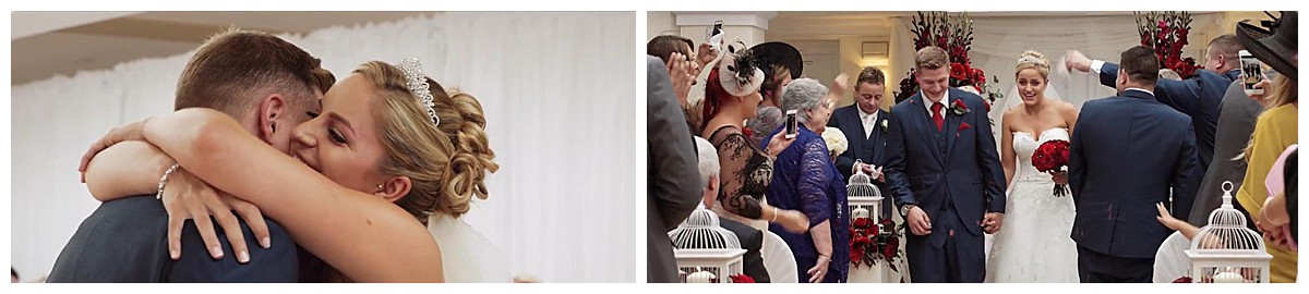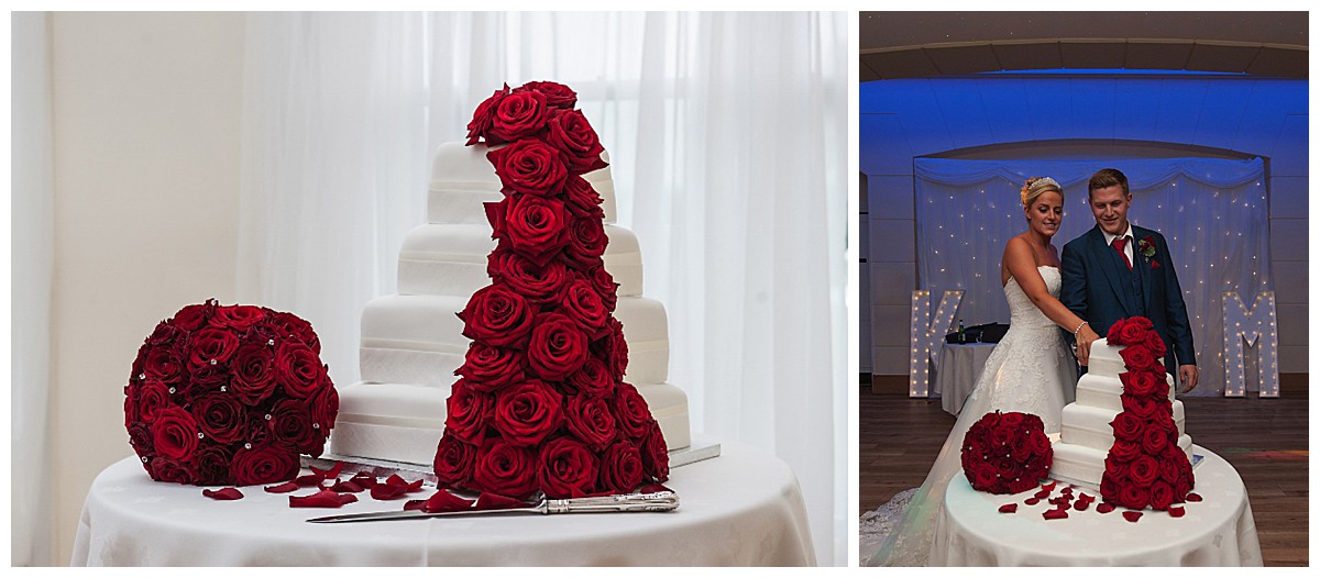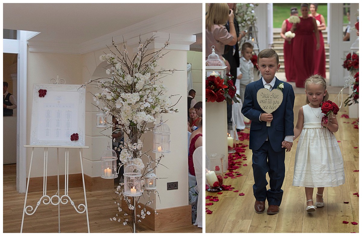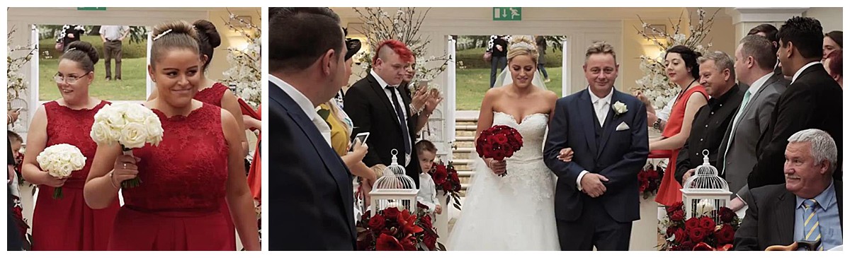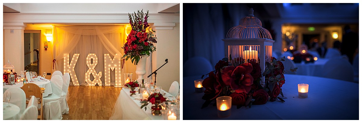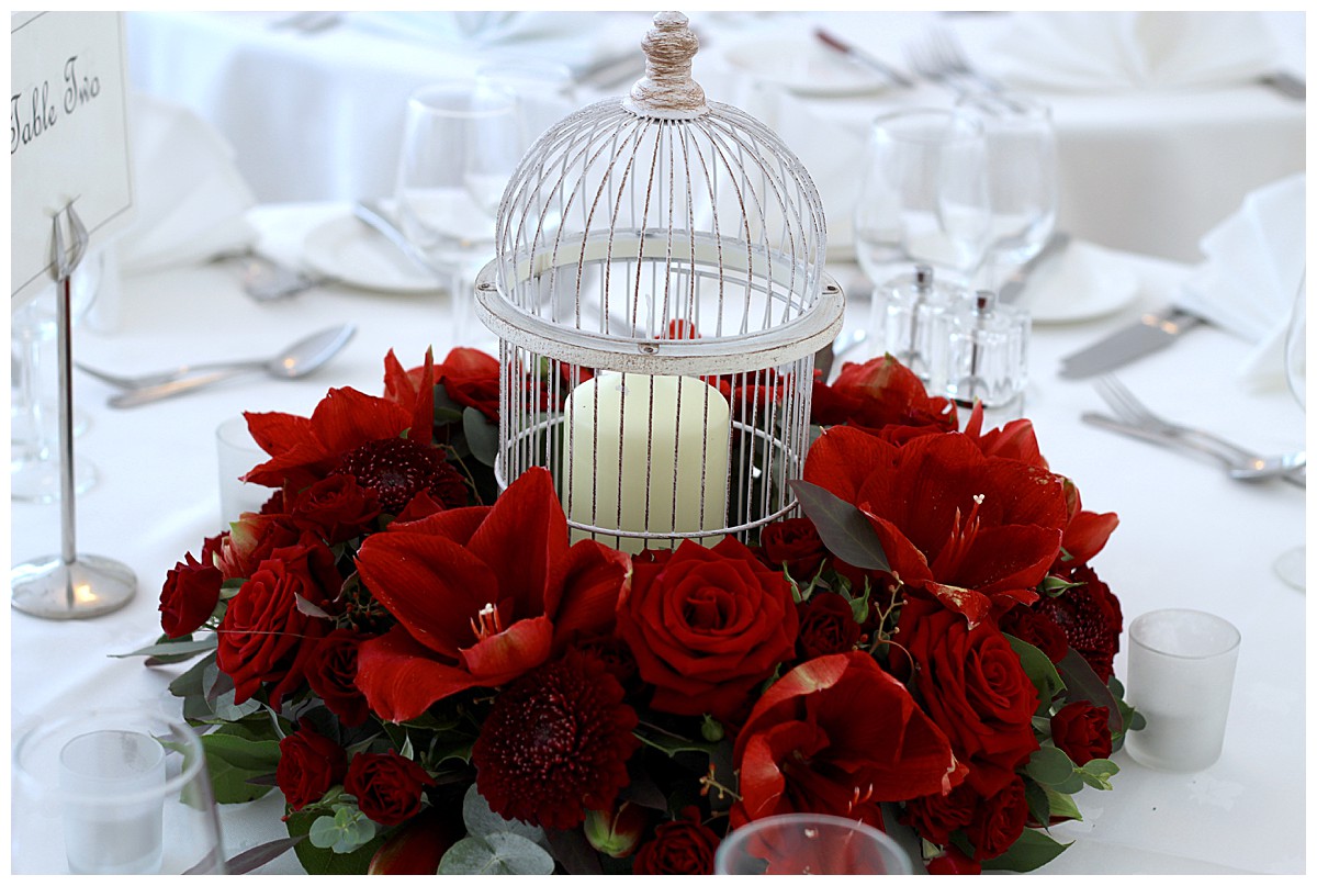 Flowers wise, the ceremony room was styled with bird cage centrepieces of red roses and opulent red amaryllis lilies lining the wedding aisle, casting a lovely candlelight glow as Katie made her way down the aisle.