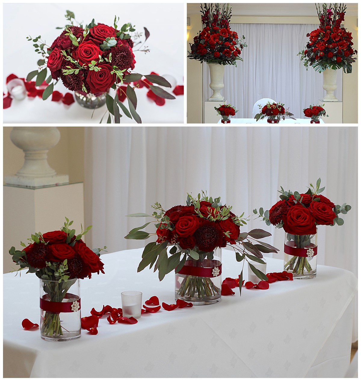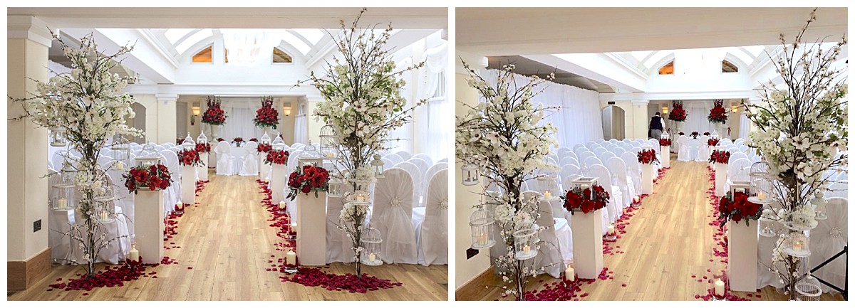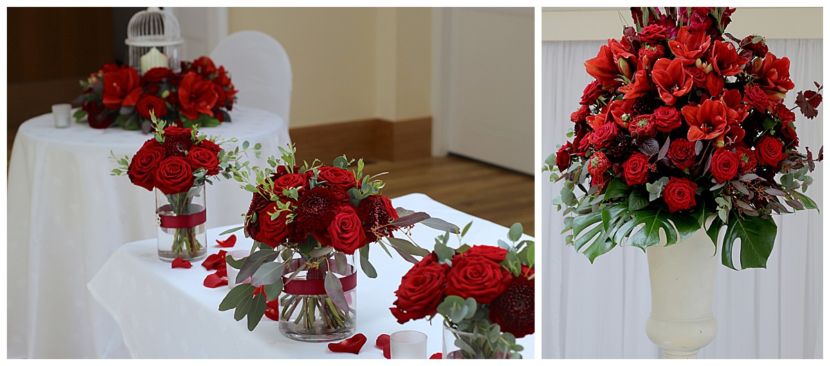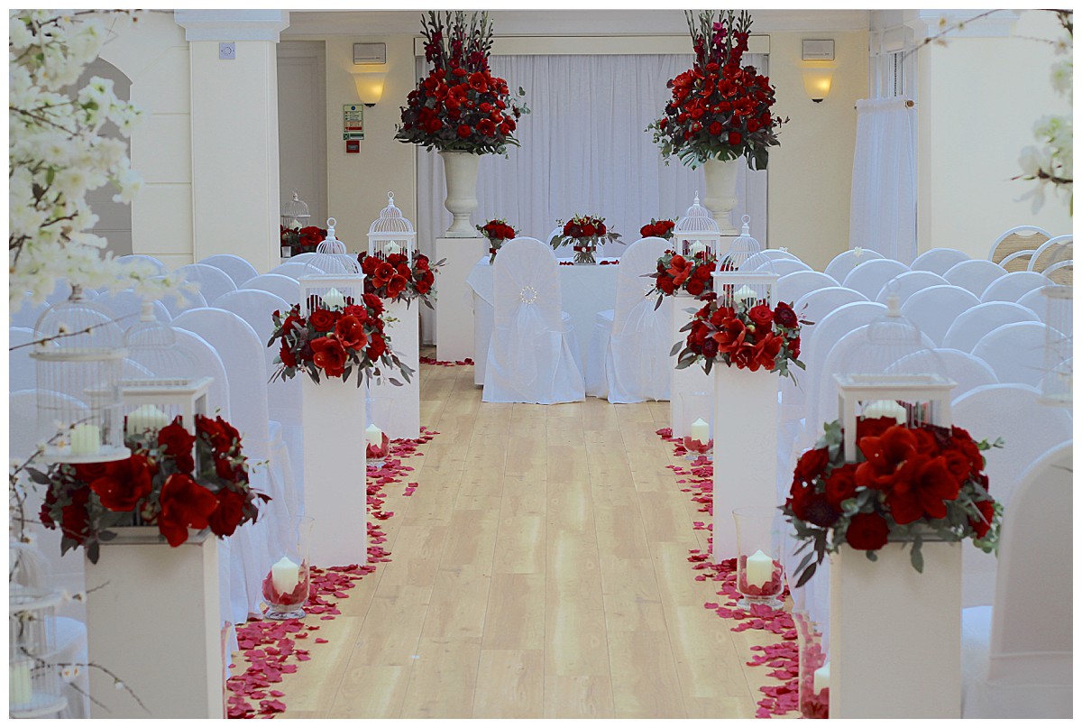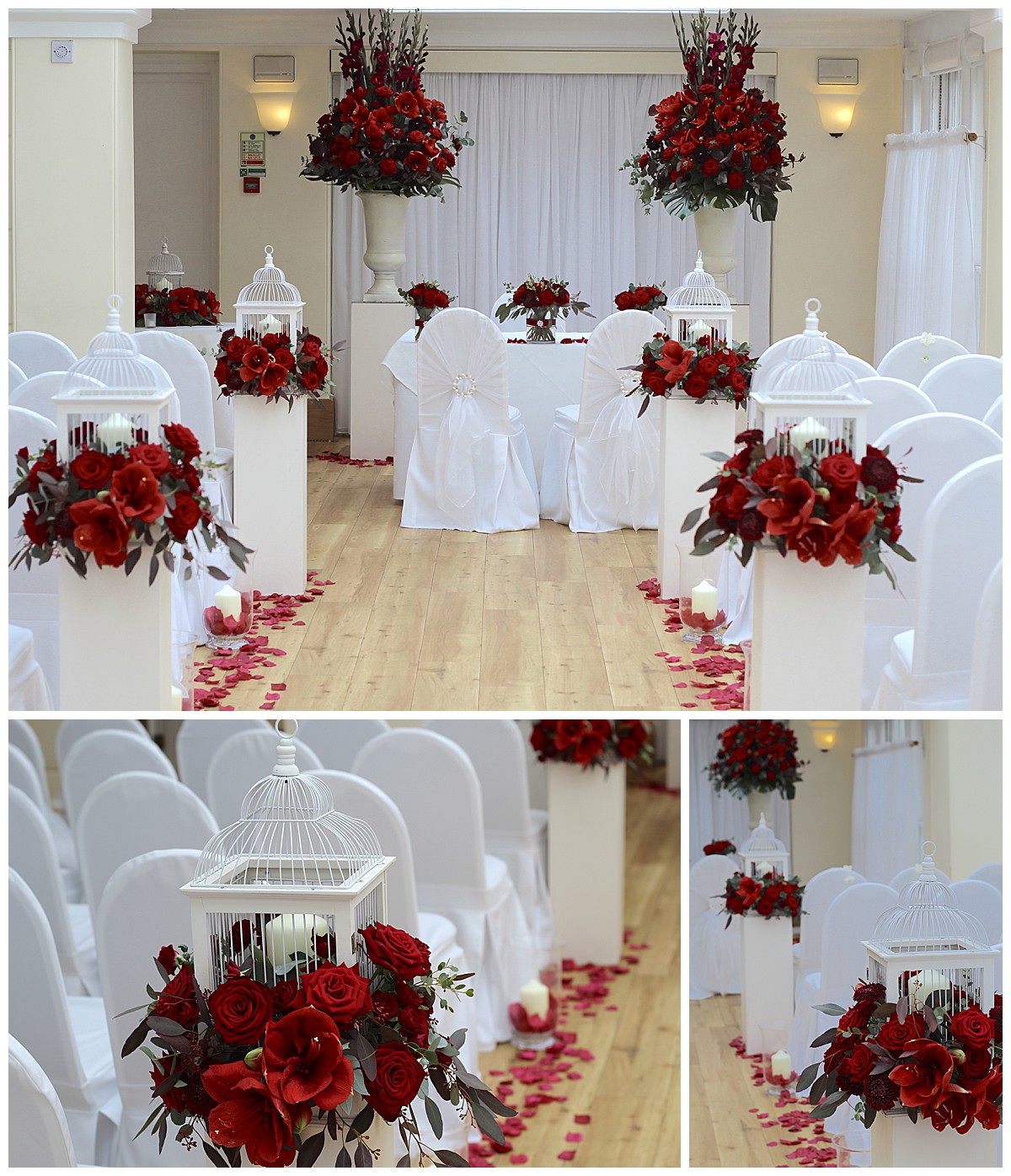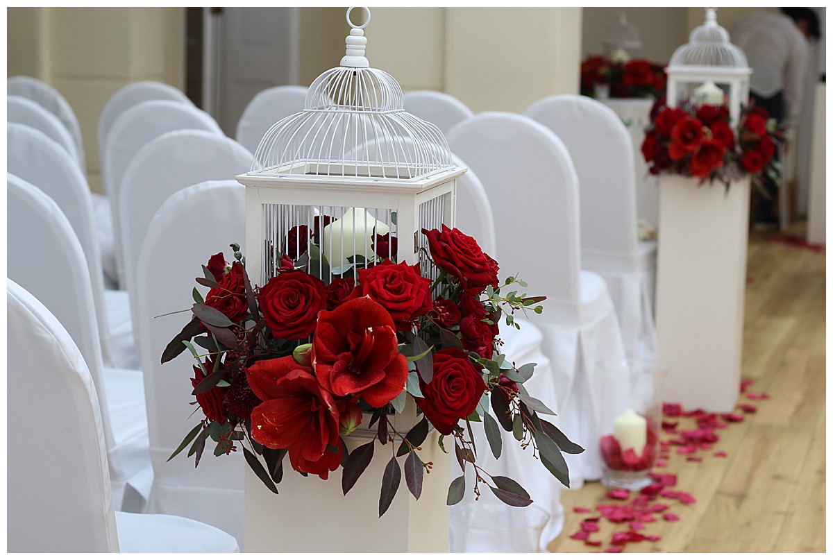 At the entrance end of the aisle, we placed two of our stunning ceiling-height white blossom flower trees, available for hire at Pembroke Lodge weddings, and we added hanging lanterns and bird cage lanterns, all candlelit to add a lot of warmth and ambiance. At the ceremony end, we placed two grand floral urns of elegant red gladiola, red roses and bloomy opulent amaryllis, to create a bold and beautiful backdrop to the wedding ceremony. The ceremony table was styled with pretty vases of deep red roses which were later on used on the top table.