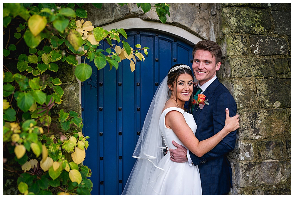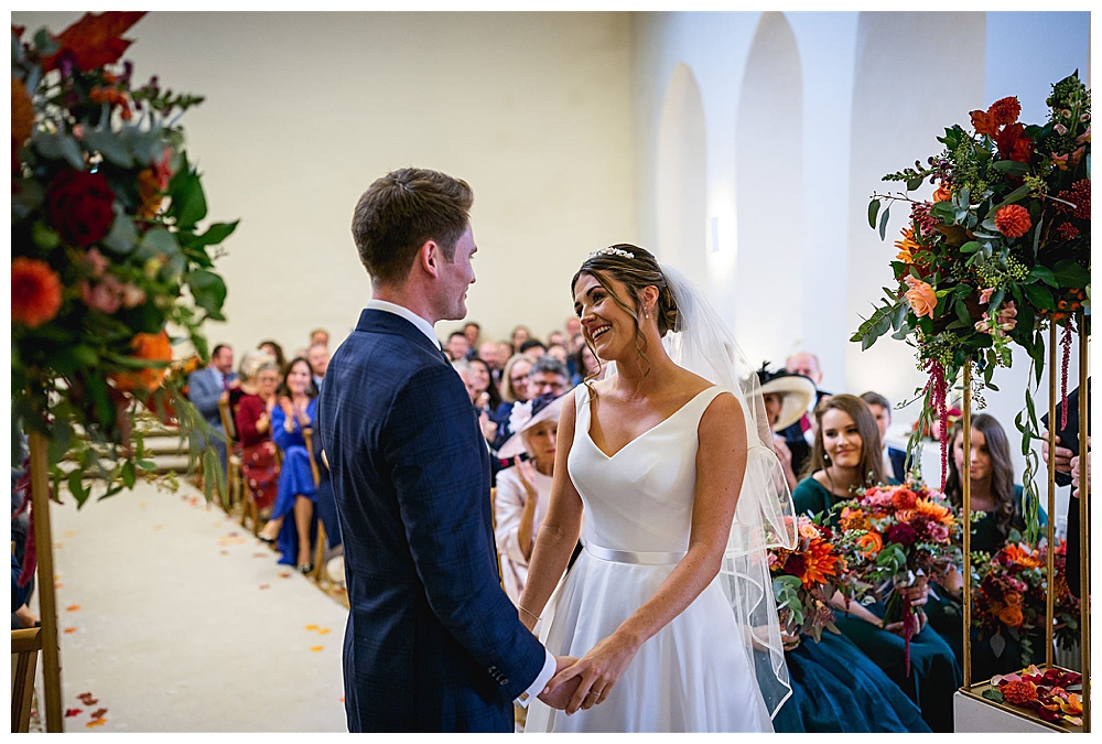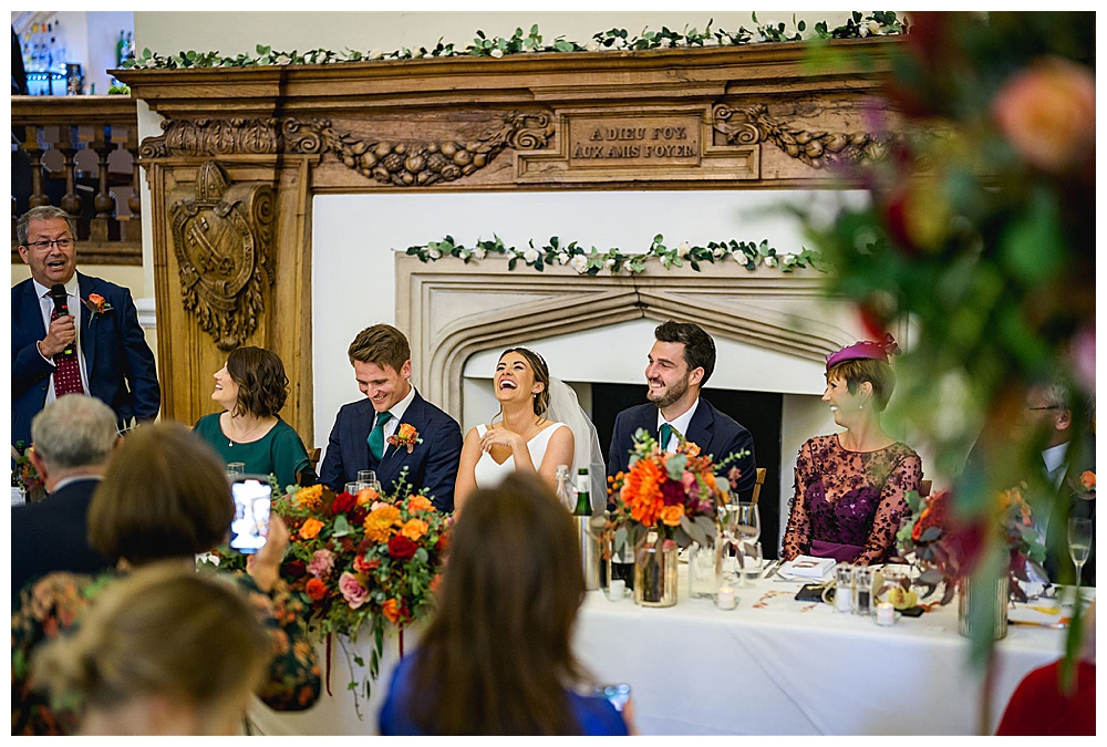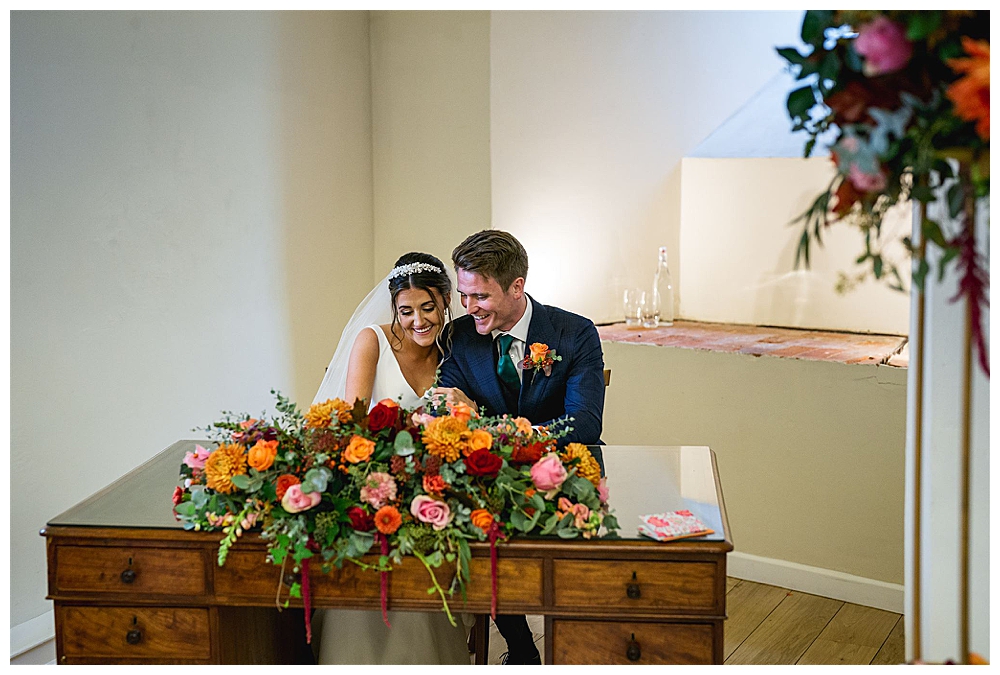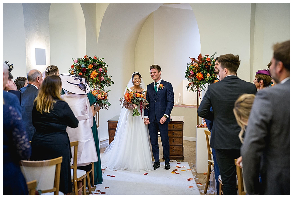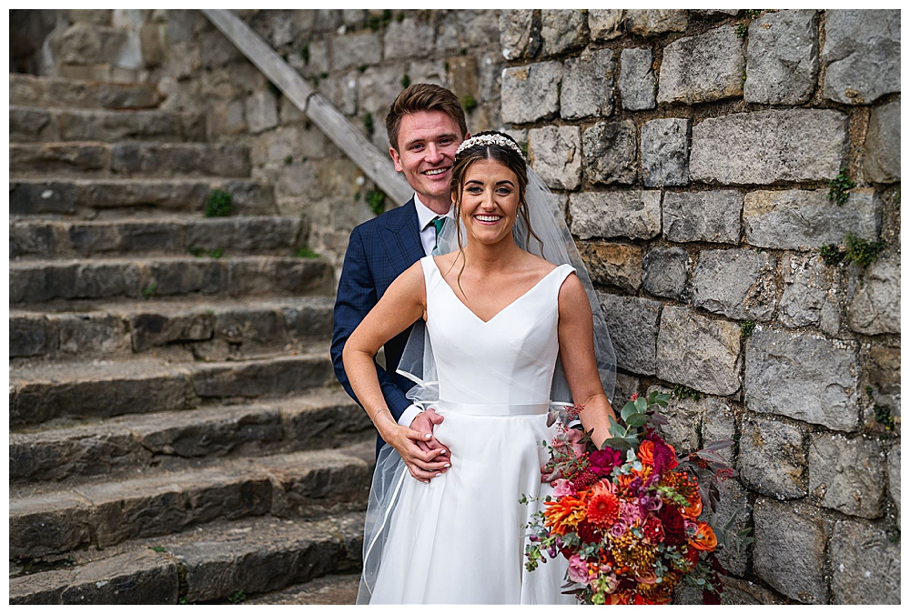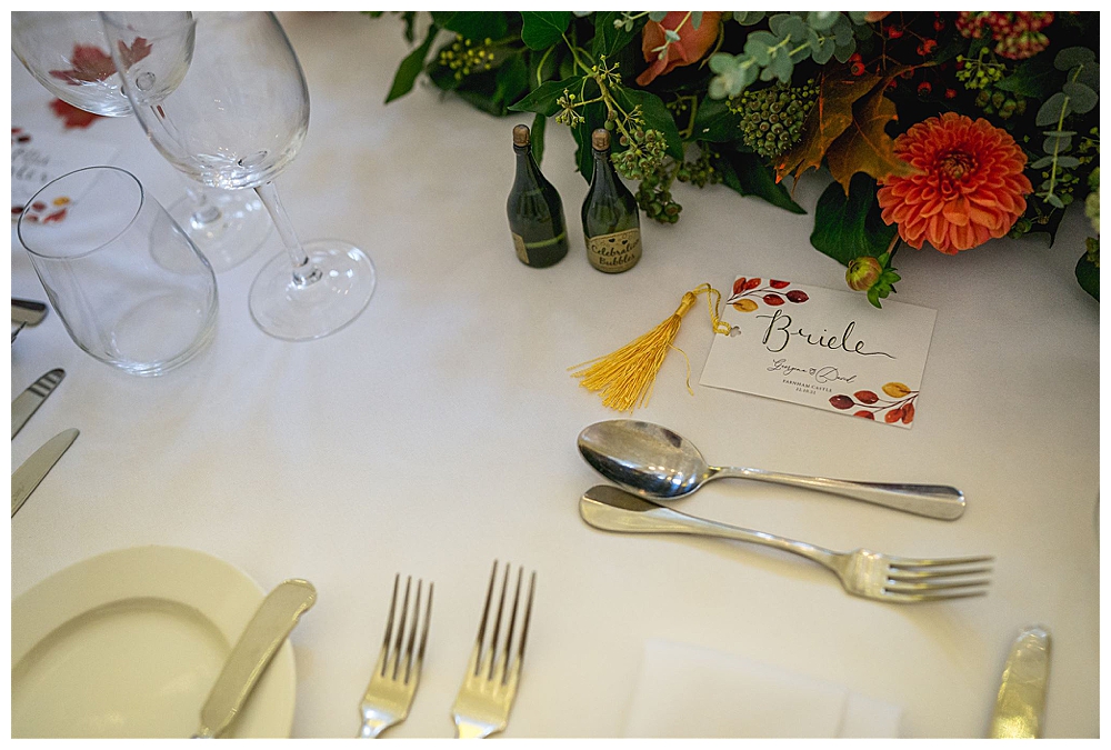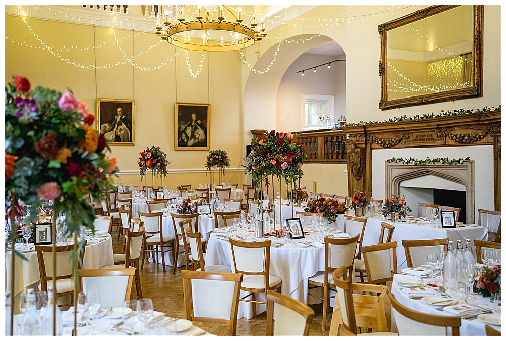 When it came to the castle flowers, the bold autumnal colours really brought the spaces alive and created such a wow factor. To do justice to the amazingly high ceiling ceremony and wedding breakfast rooms at the castle, Georgie and Dave opted for a mix of tall dramatic geometric stands floral centrepieces on most of the guest tables. On the remaining tables, we created beautiful candlelit floral wreaths bursting with warmth and ambiance. The combination was not only more visually interesting and very dramatic, but it enabled us to beautifully repurpose the displays through the day.