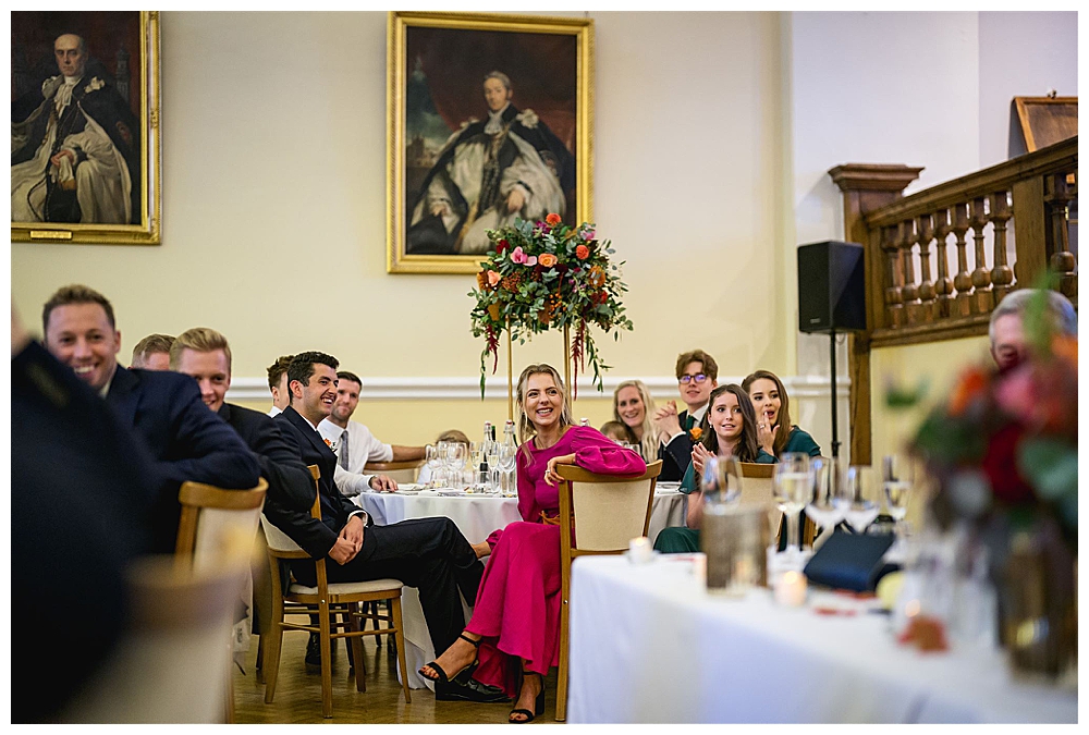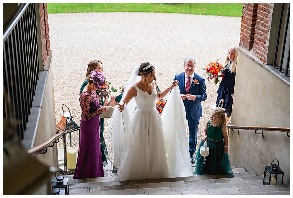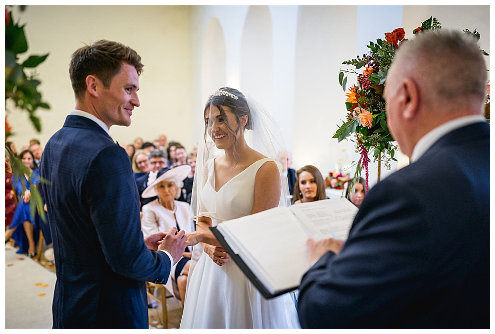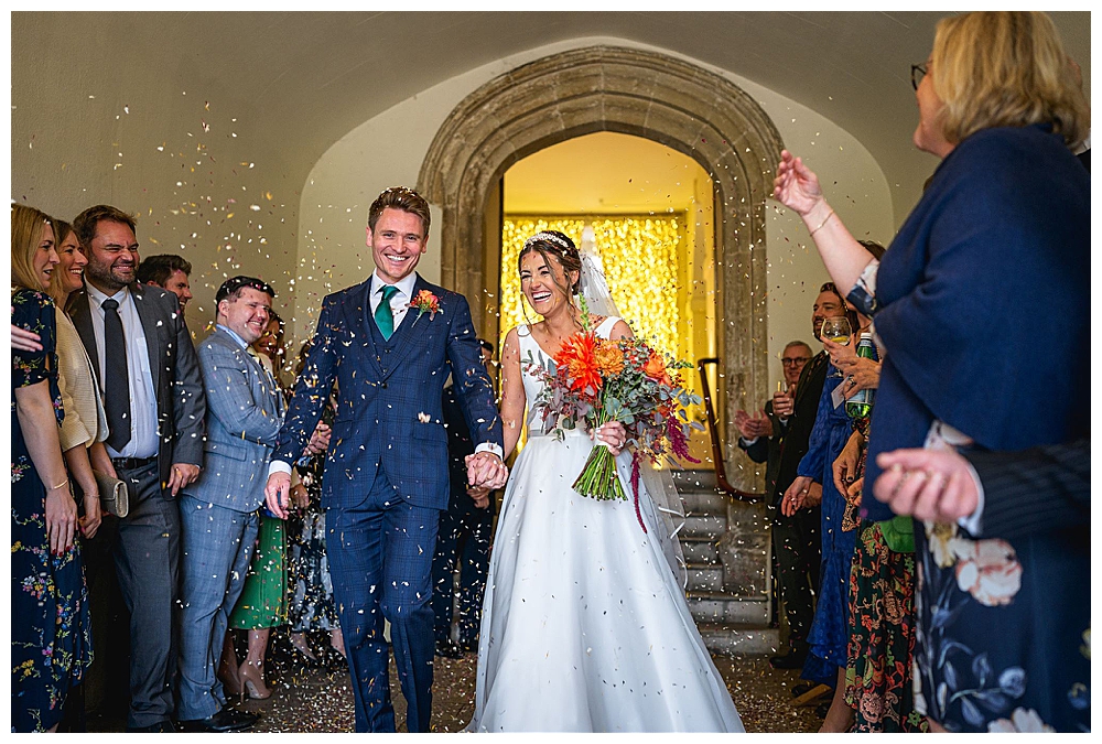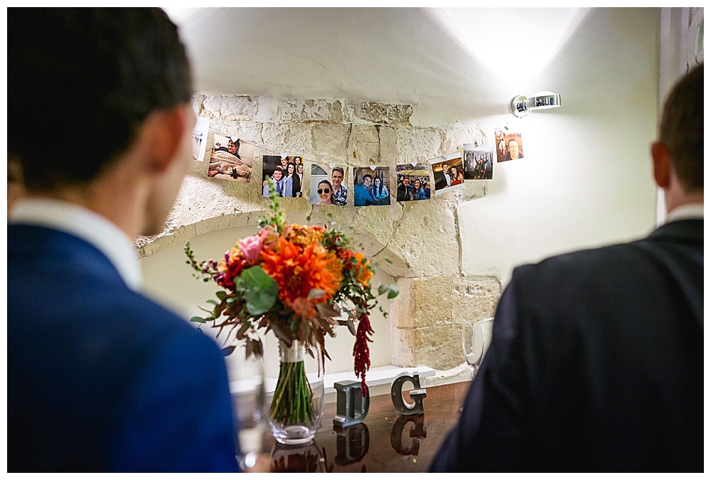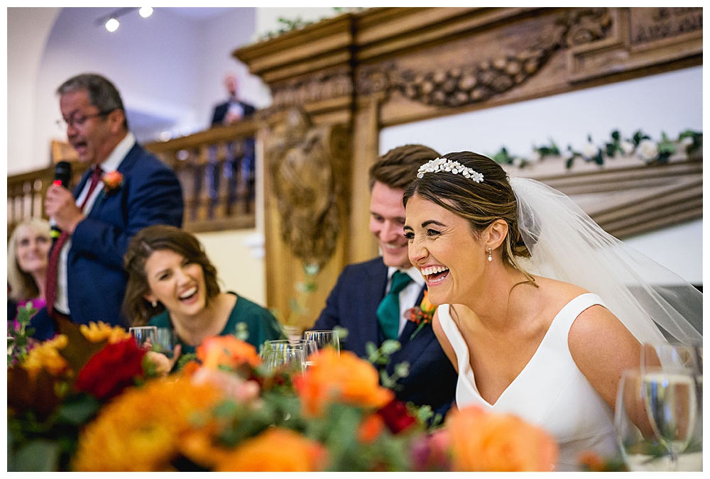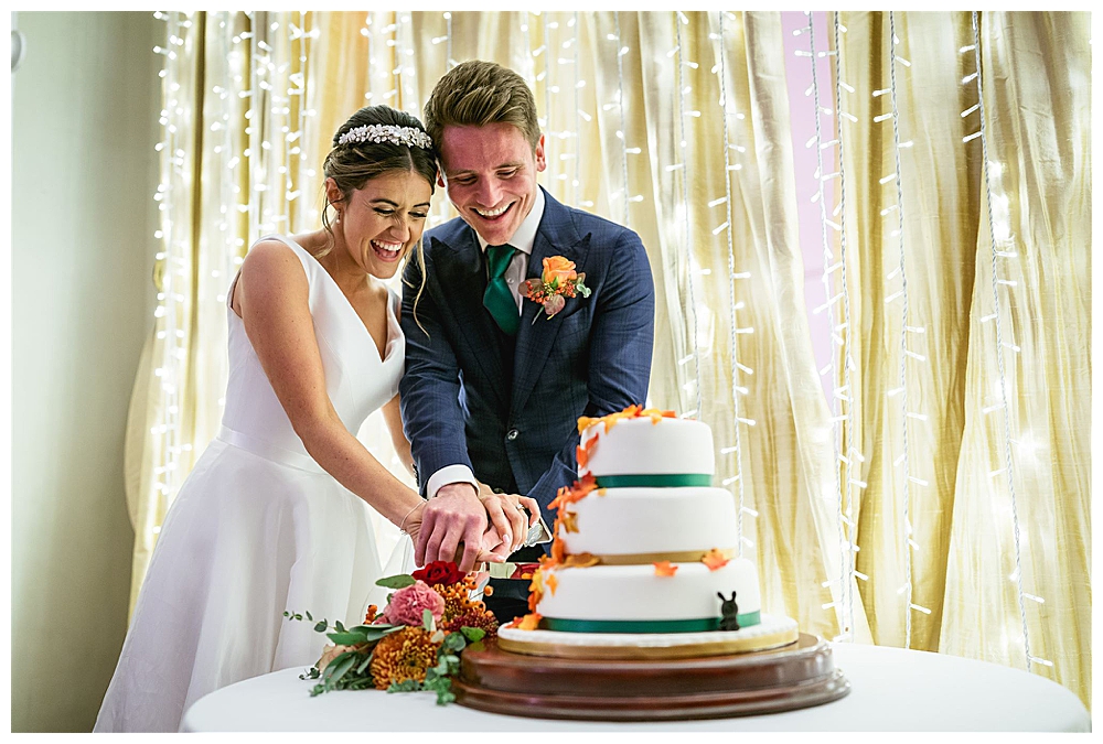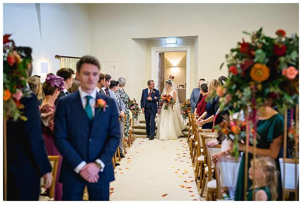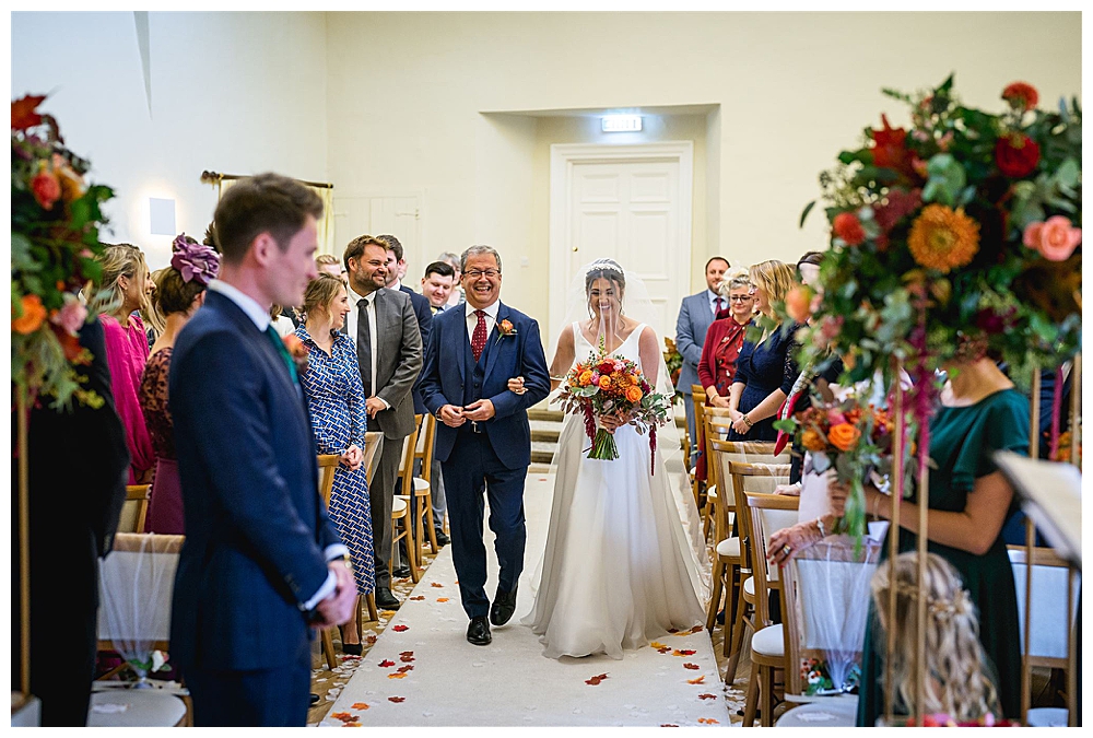 When it came to the castle flowers, the bold autumnal colours really brought the spaces alive and created such a wow factor. To do justice to the amazingly high ceiling ceremony and wedding breakfast rooms at the castle, Georgie and Dave opted for a mix of tall dramatic geometric stands floral centrepieces on most of the guest tables. On the remaining tables, we created beautiful candlelit floral wreaths bursting with warmth and ambiance. The combination was not only more visually interesting and very dramatic, but it enabled us to beautifully repurpose the displays through the day.