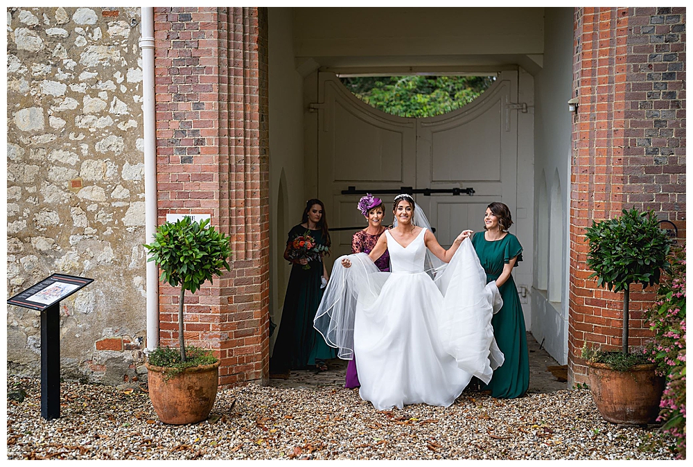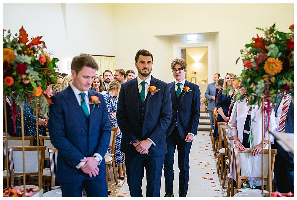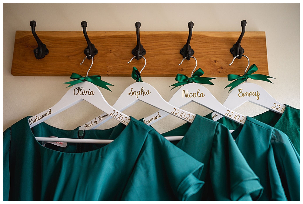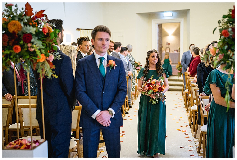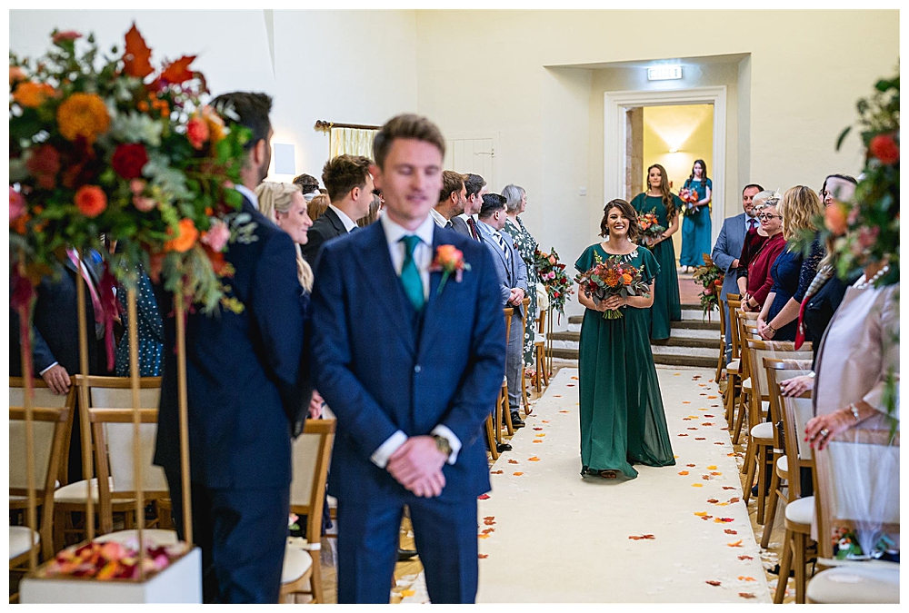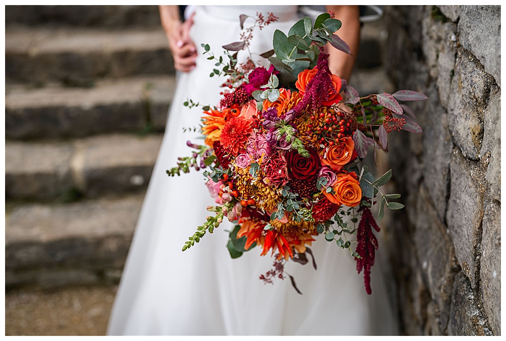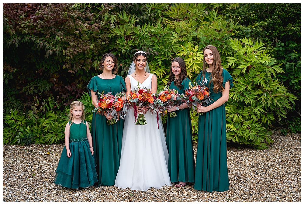 Georgie wanted to have an opulent mix of rich autumn wedding flowers in typical autumnal colours but with a little bit of a twist. So we added in some subtle pops of dusty pink and coral. This really complemented the deep burgundy red and orange shades, and mellowed them a little without reducing their impact. The bouquets stood out so beautifully against the bridesmaids deep emerald green dresses, it was the perfect backdrop colour.