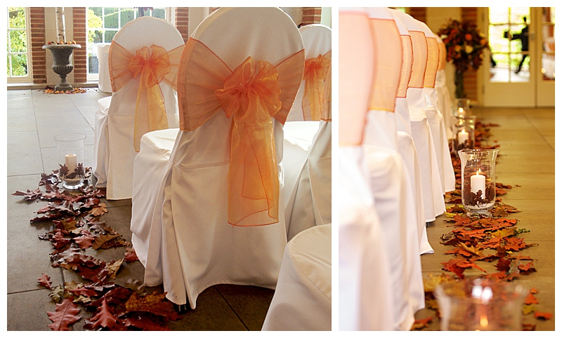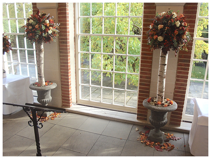 I met with Sara and Nick quite a long time ahead of their wedding, to talk through their autumn wedding flowers dreams for their upcoming wedding at Great Fosters. When I asked them about the theme for their wedding, Sara produced a lovely print she had brought over from New York, with a thick carpet of leaves in the most amazing shades of autumn, taken in a romantic tree lined NY avenue. She wanted everything to stem from this, from the ceremony area to the guest table displays. When I saw Sara on the morning of the wedding, beautifully made up by Sharon Ross she had already been downstairs to see our handywork and she was over the moon and speechless at the result.