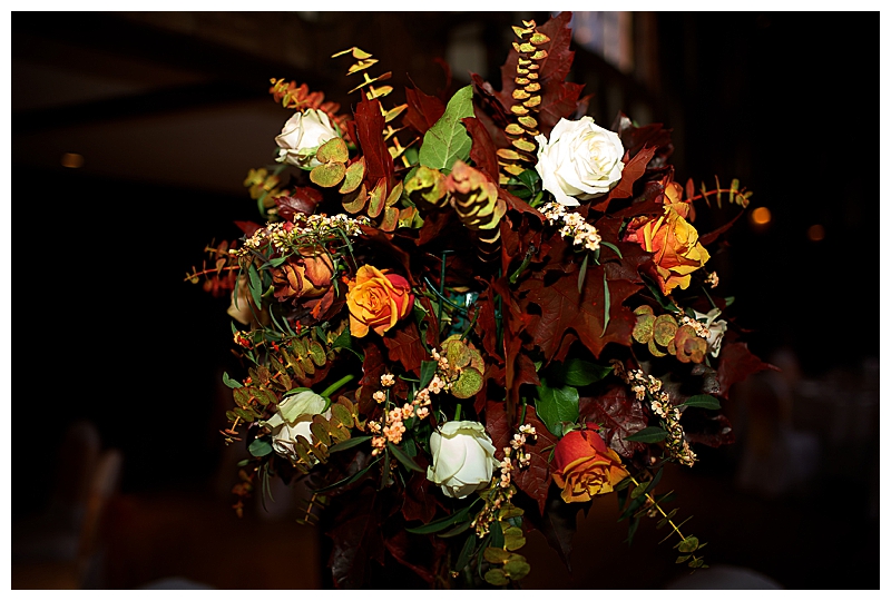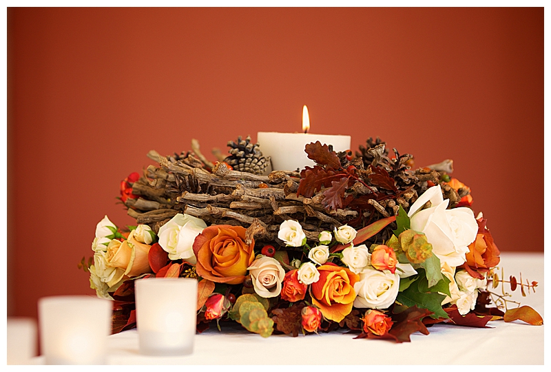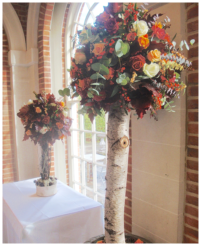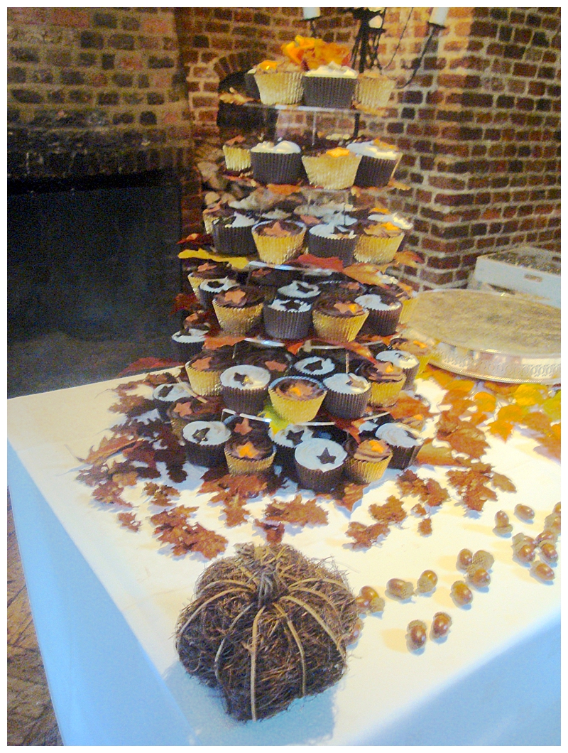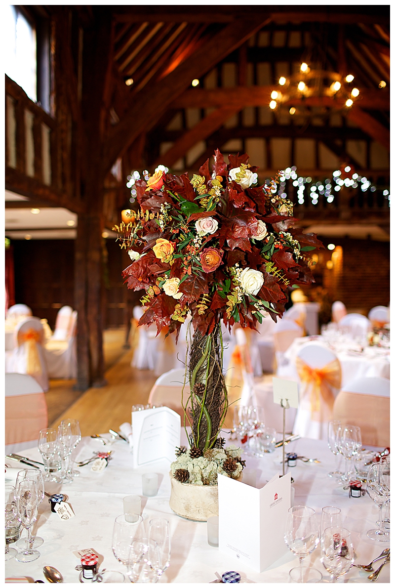 In the middle of the Tithe Barn, we used 4 tall tree like displays potted in whitewashed pots, created from the wonderful trunks of silver birch trees, decorated with vines and pine cones and with large spheres of atumn foliage and roses at the top. For the tables under the eaves, where the ceiling is lower, we used 4 twiggy centrepieces rising up from the middle of large domes of flowers and autumnal foliage, and for the central top table, we embelished Sara’s twiggy wreath with gorgous roses and amber foliage. We decorated the cup cake table with autumn oak leaves and twiggy pumpkins, and put little orange spray roses and leaves amongst the cute cup cakes. All in all a really lovely and unusual wedding which revitalised my creativity buds and saturated my senses with autumn colour, ready for the onset of all white of winter weddings.
