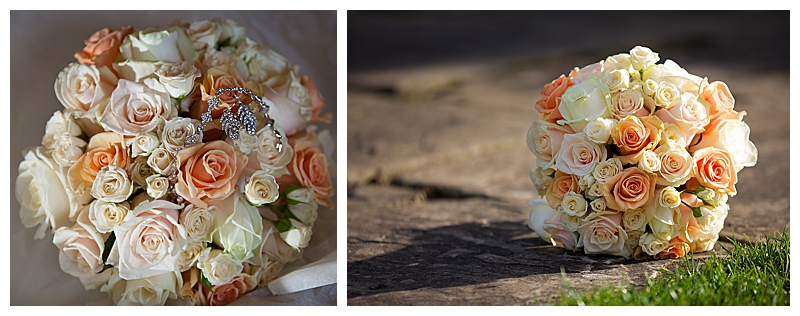 Sara’s bouquet used a mixture of Talea roses, ivory Avalanche roses, ivory spray roses and pale apricot orange Primma Donna roses, to create a textural bouquet to complement her stunning Vera Wang ruffles chiffon dress. The bridesmaid had a similar version with added Coffee Break roses, for a deeper colour mix and the men had buttonholes of Coffee Break, or Talea or Cherry Brandy roses framed by autumn leaves. For the wedding ceremony in the Great Fosters Orangery, we created tall dramatic tree like centrepieces in grand urns, to stand either side of the ceremony area, using chunky silver birch and a dramatic mix of atumnal foliage and burnt orange and crean roses. True to Sara’s inspiring visual, we lined the aisle with burnished oak leaves and dotted hurricane lamps every few steps. These nicely complemented the gorgeous burnt orange organza sashes from Host With Style.