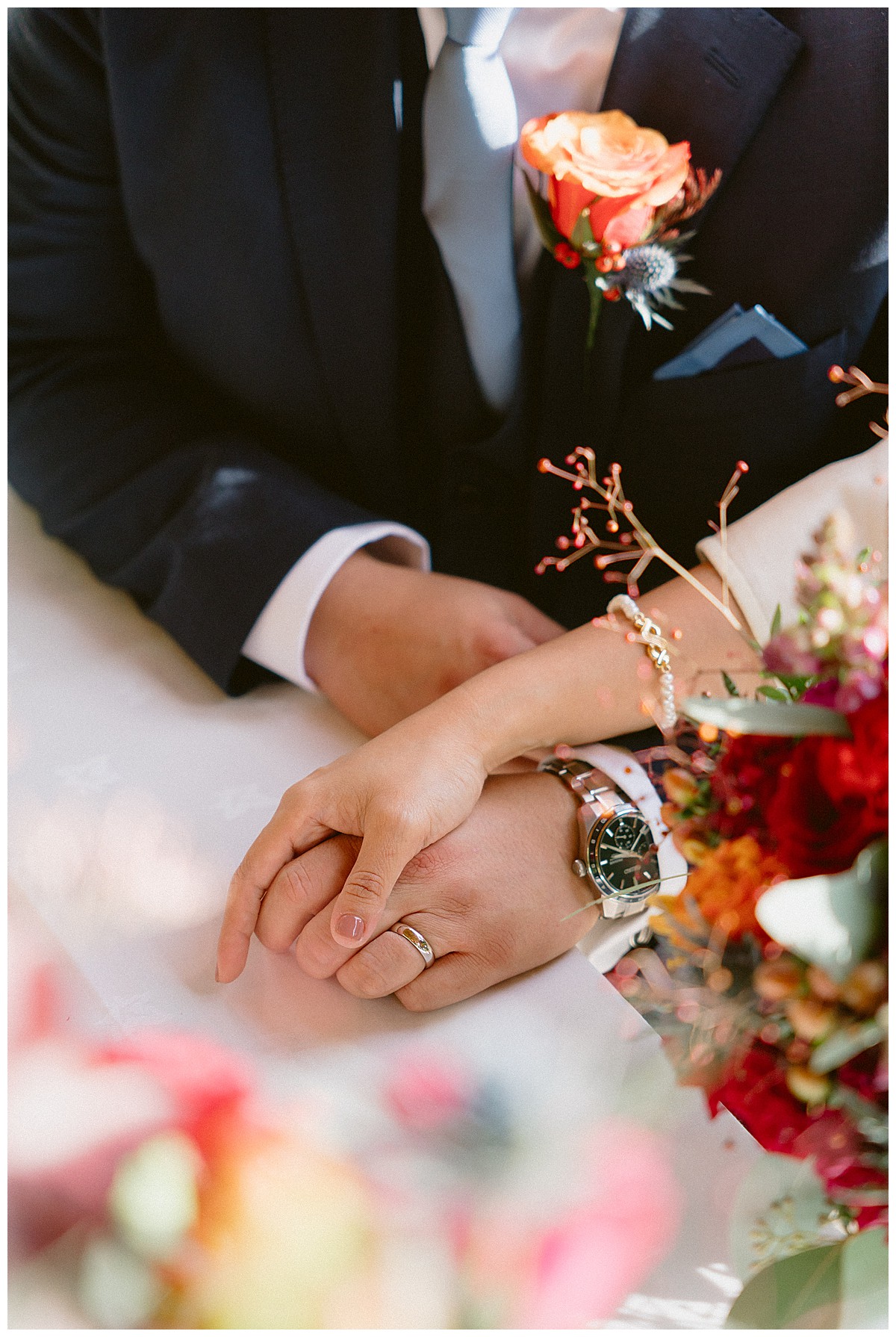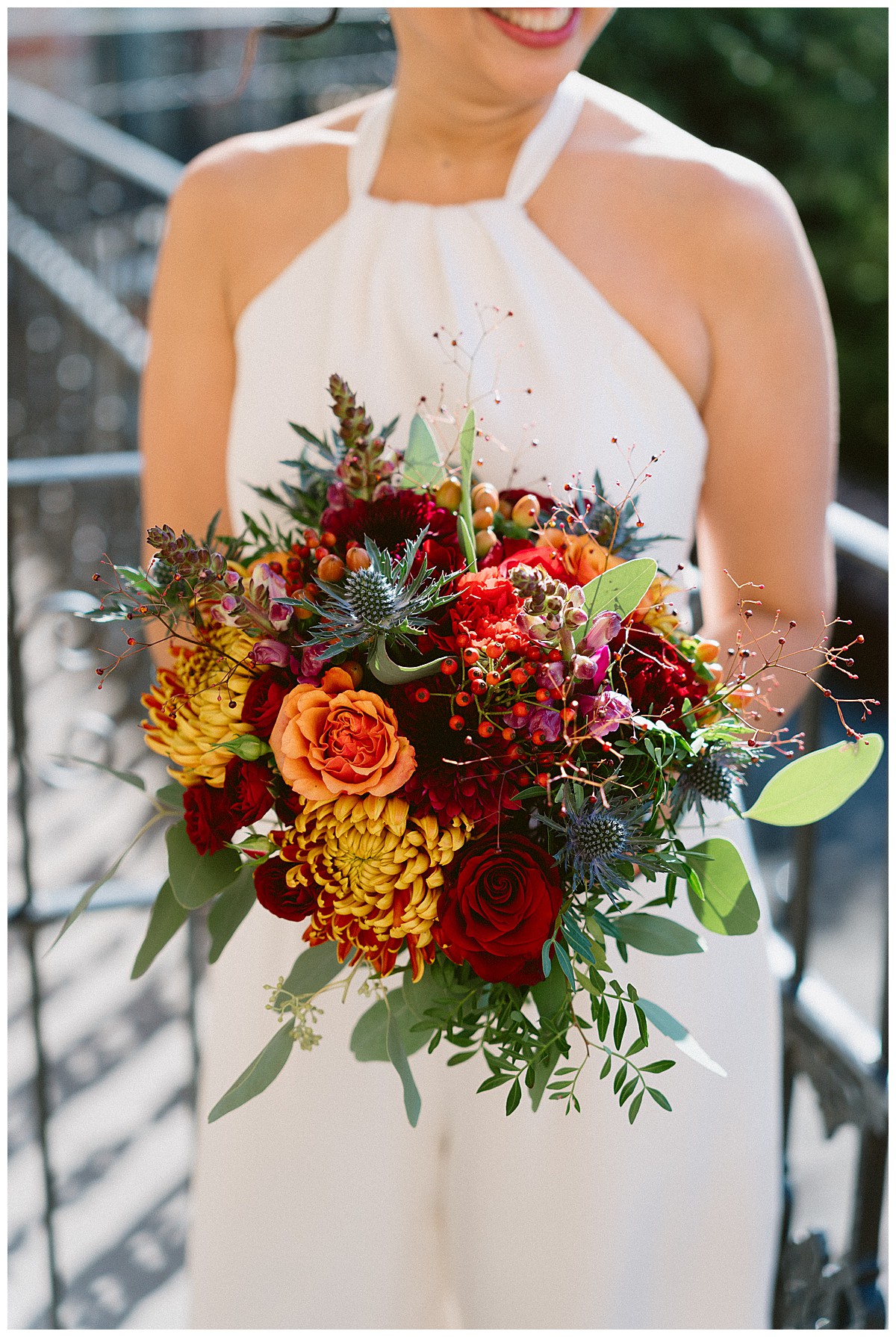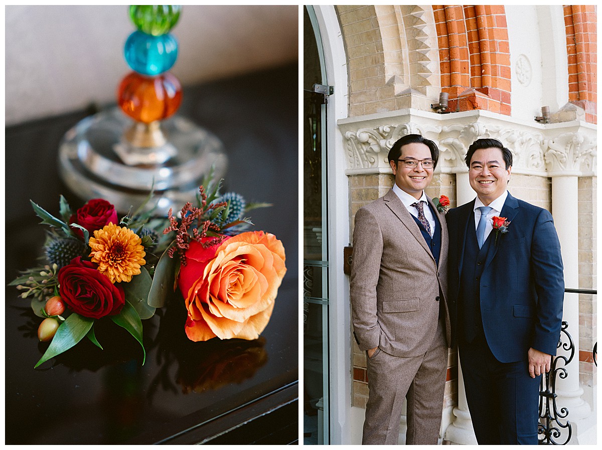 Bernie looked amazing in a halter neck trouser suit and loved her autumnal bridal bouquet bursting with deep burgundy, rustic oranges , earthy browns and elegant contrasting navy blue accents. Carlos and his son wore matching buttonholes in deep orange, with reddish accents and a dash of thistle blue to match the suits, and we created a dainty corsage for Bernie’s mum in the same beautiful colours. These captivating hues are the hallmark of the season and served as the perfect beautiful backdrop for an outdoor wedding filled with warmth and love.