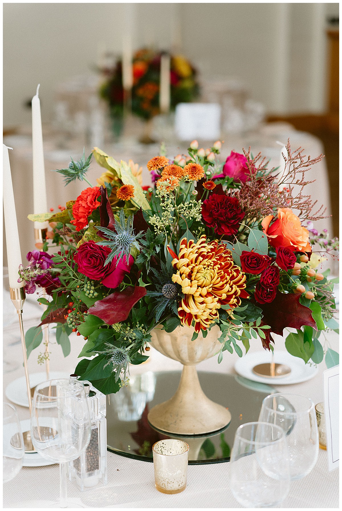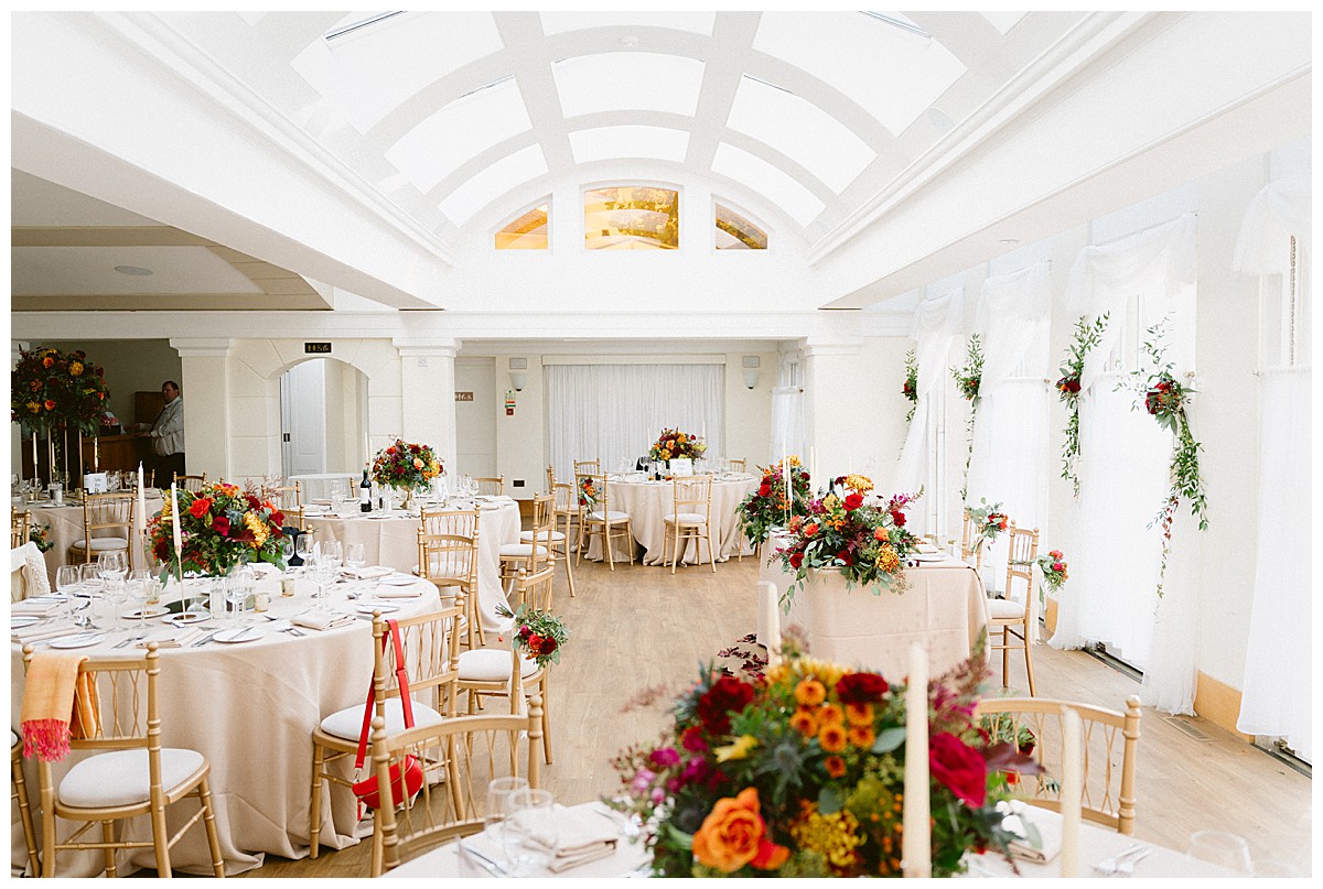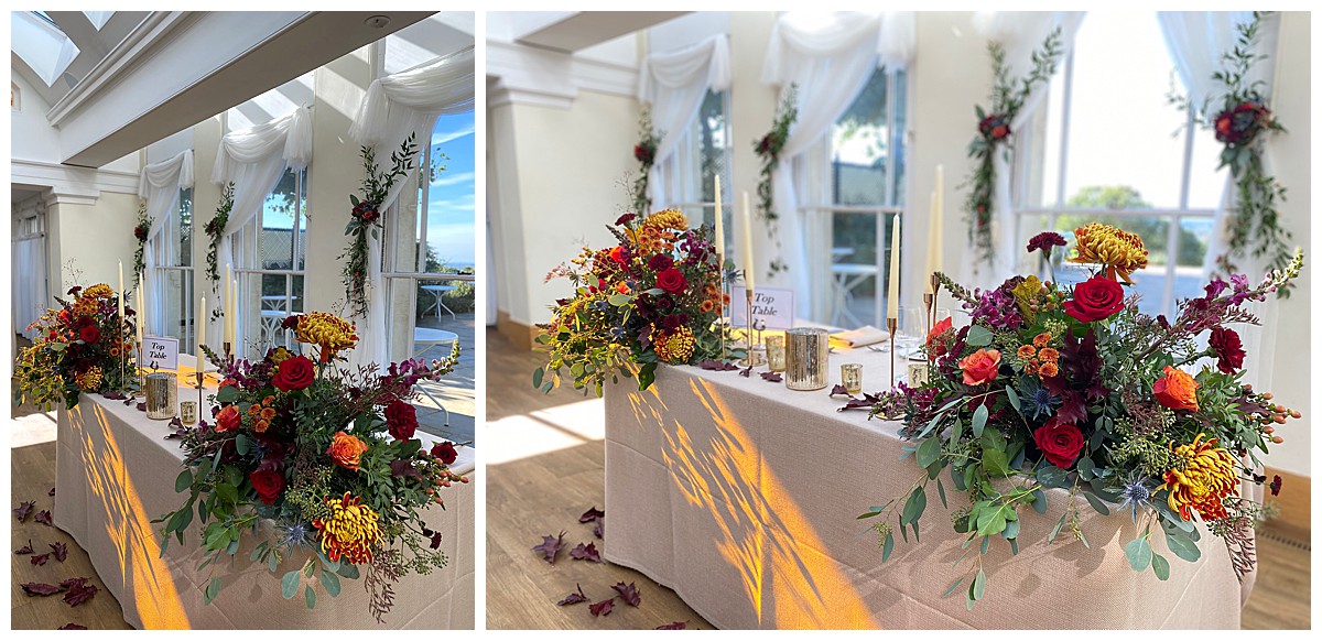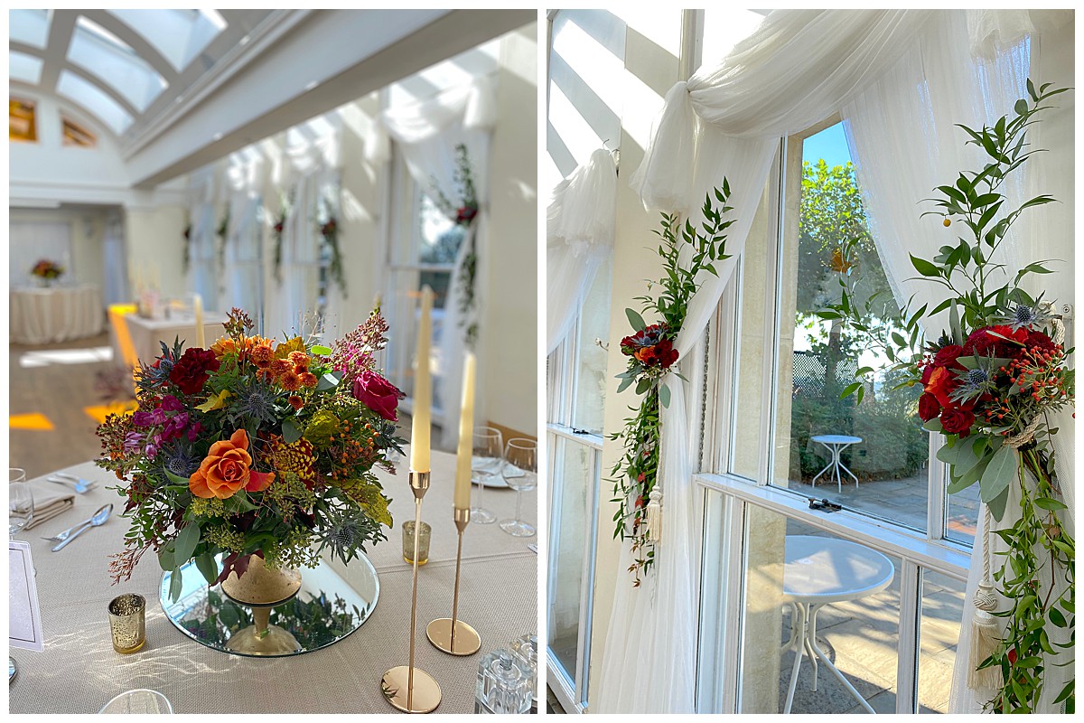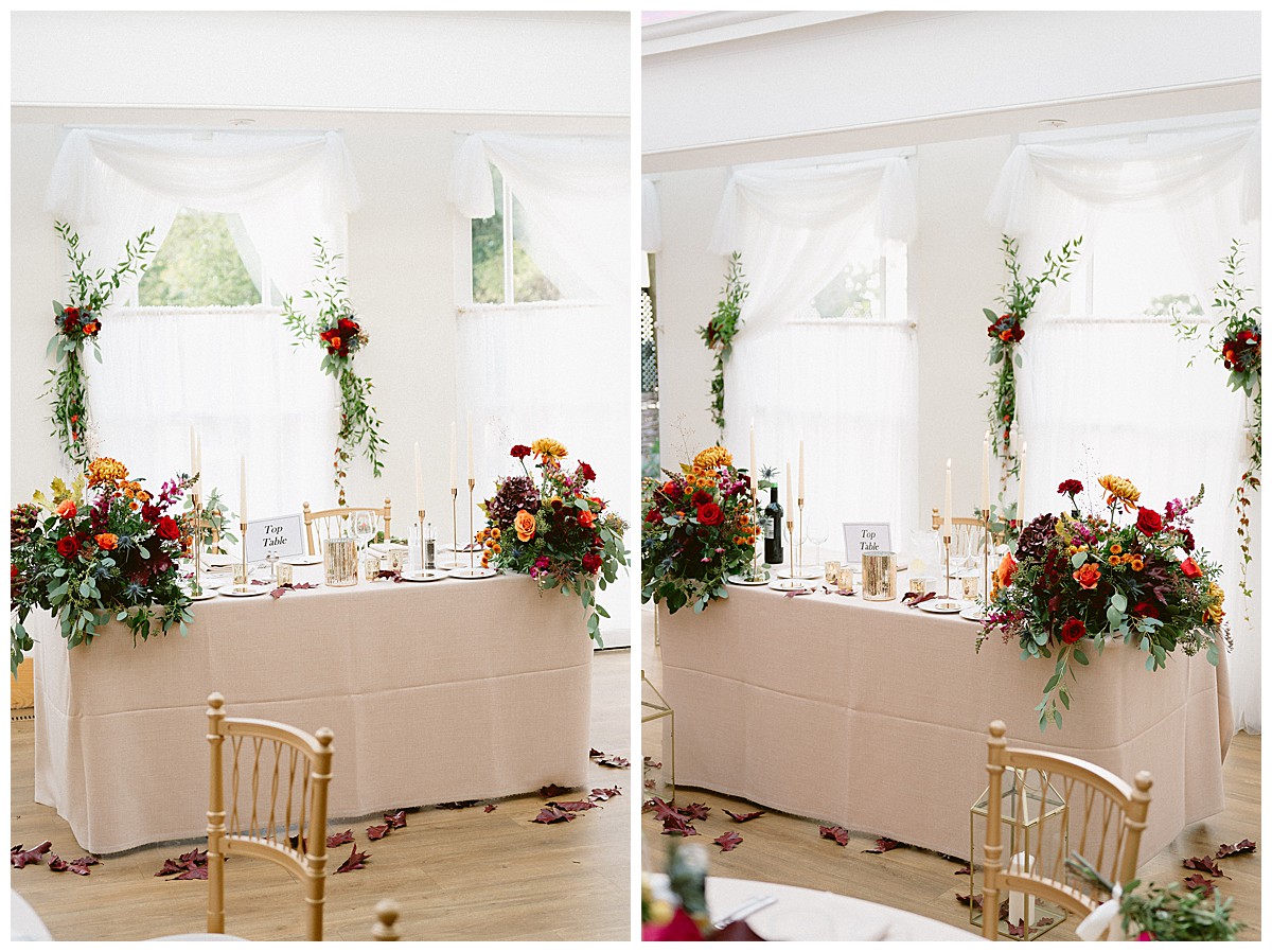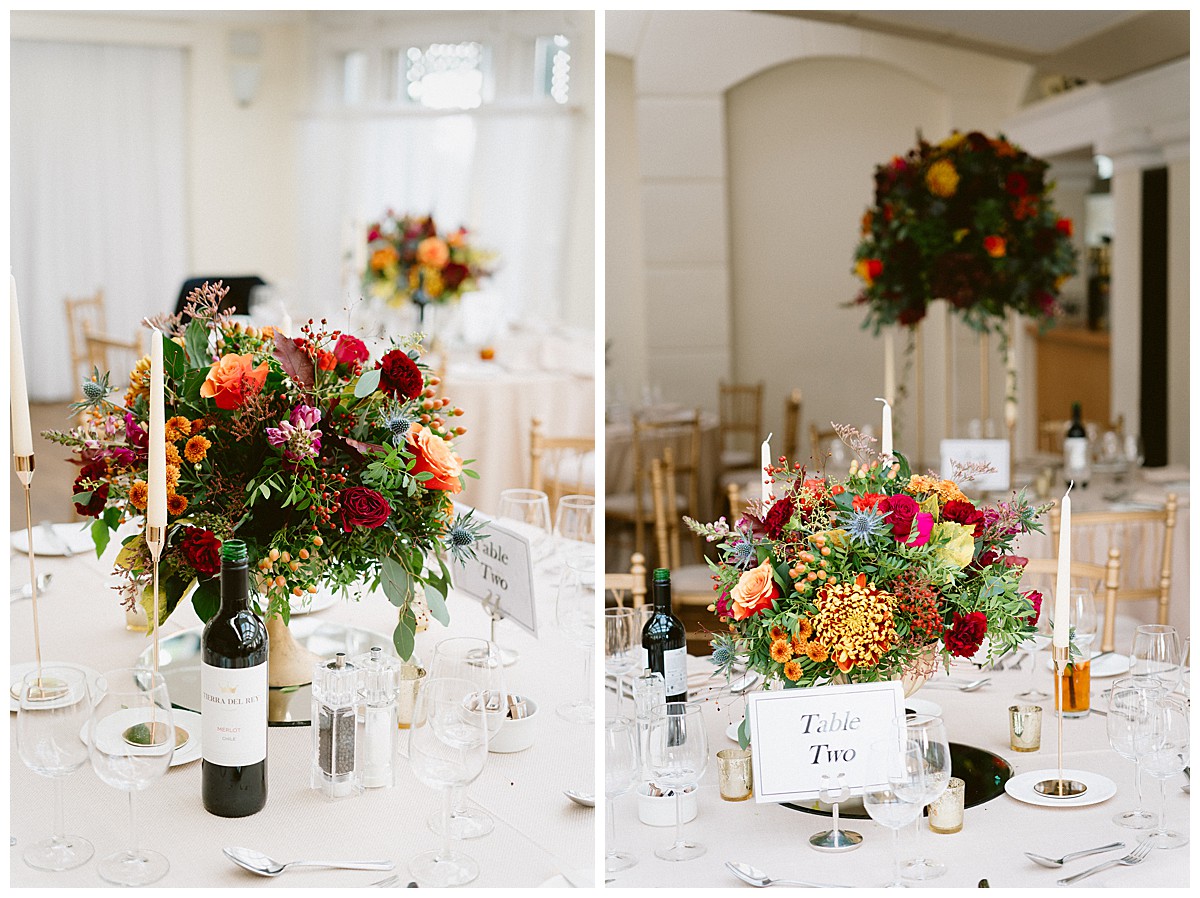 Inside the Belvedere, the displays from the base of the tall focal ceremony displays were later reused to dress the ends of the sweetheart top table and the bridal bouquet was used in the middle of the table after the photos session, Two of the round guest tables were then dressed with the 2 tall geometric stands ceremony displays, to add a big wow to the central guest tables, while the rest the rest of the guest tables were dressed with gorgeous rose bowls bursting with autumn hues. We used roses, spray roses, layered chrysanthemums, snapdragons, thistles, berries and rosehips , thistles and dark oak, to create a texture as rich as the colours.