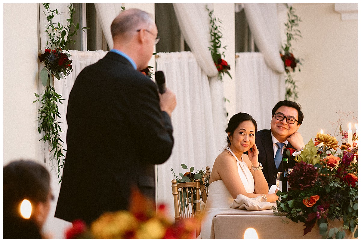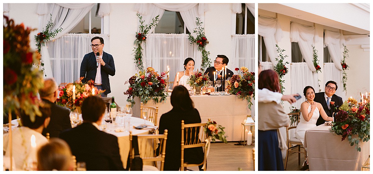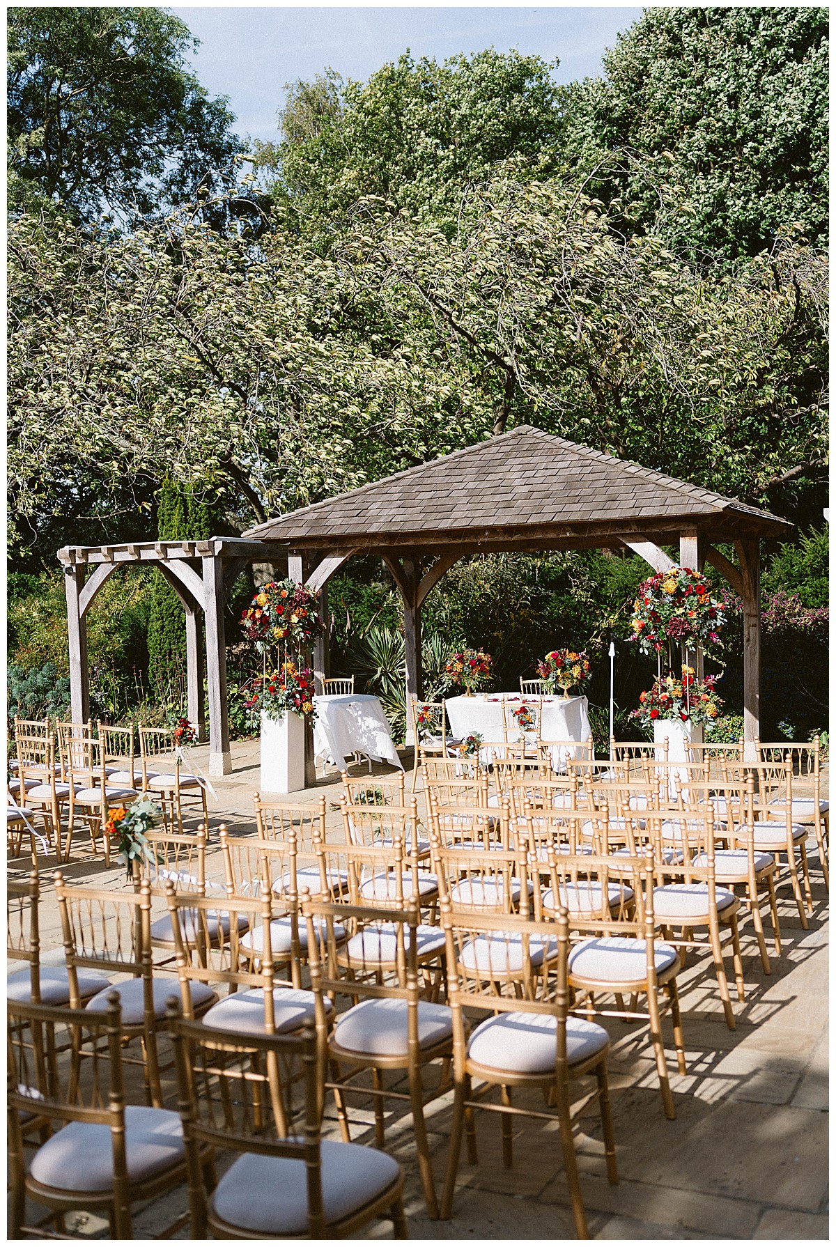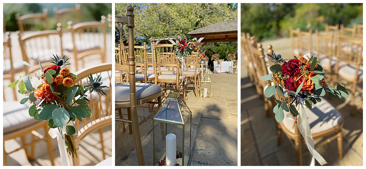 We created 2 amazing tall displays to stand in front of the Belvedere Suite pavilion, and used some of the rose bowls table centrepieces to dress the ceremony table. The aisle was beautifully dressed with autumnal chair posies on every other row end, alternating with our elegant gold lanterns down on the floor. We advised B&C to opt for Host With Style’s beautiful and elegant gold Spencer chairs to match the opulent and rich colour scheme. and the result was really stunning. Under the warm autumn sun the colours absolutely sang and created the perfect backdrop for the outdoor wedding ceremony. Close family and friends read at the ceremony and love was very much in the air, along with 2 gorgeous doves released into the autumn sky! What’s not to love?!!!