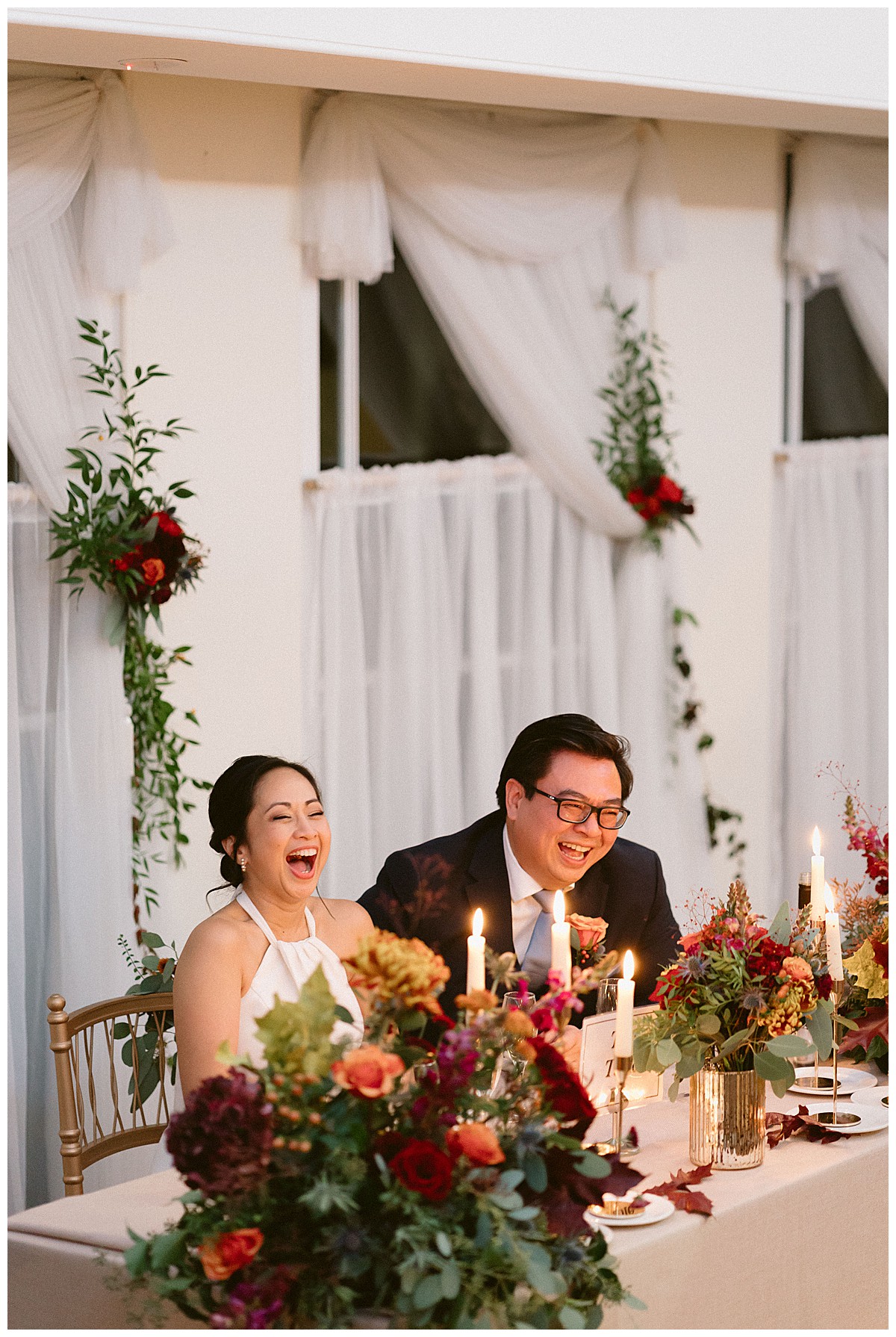 Finally, we added lots of candlelight with our elegant gold taper candlesticks, and matching gold votives, and dressed the draped windows with flowers posies and trailing ruscus foliage.