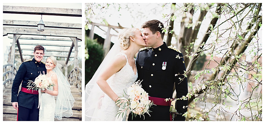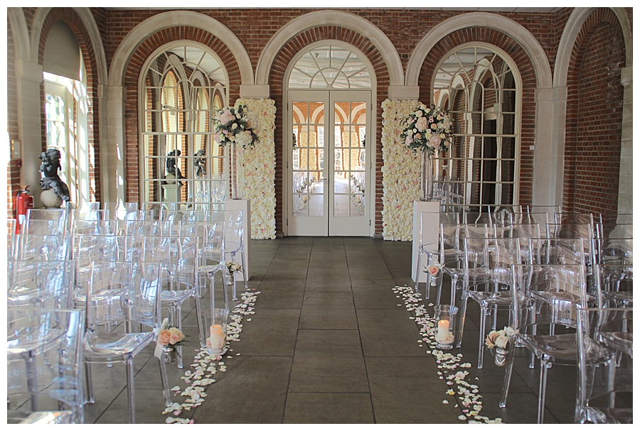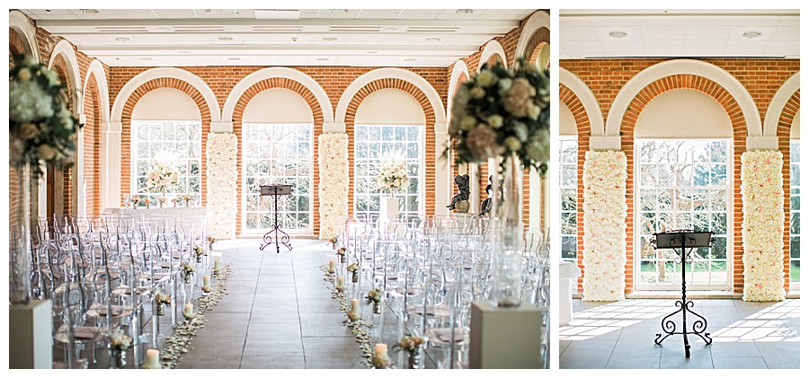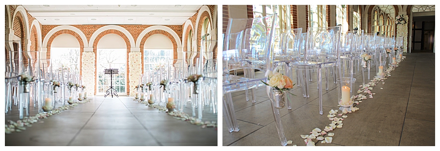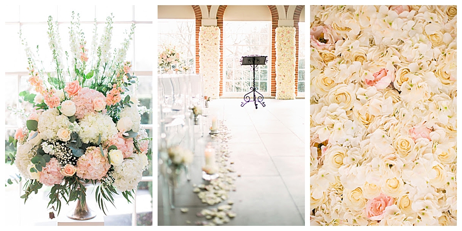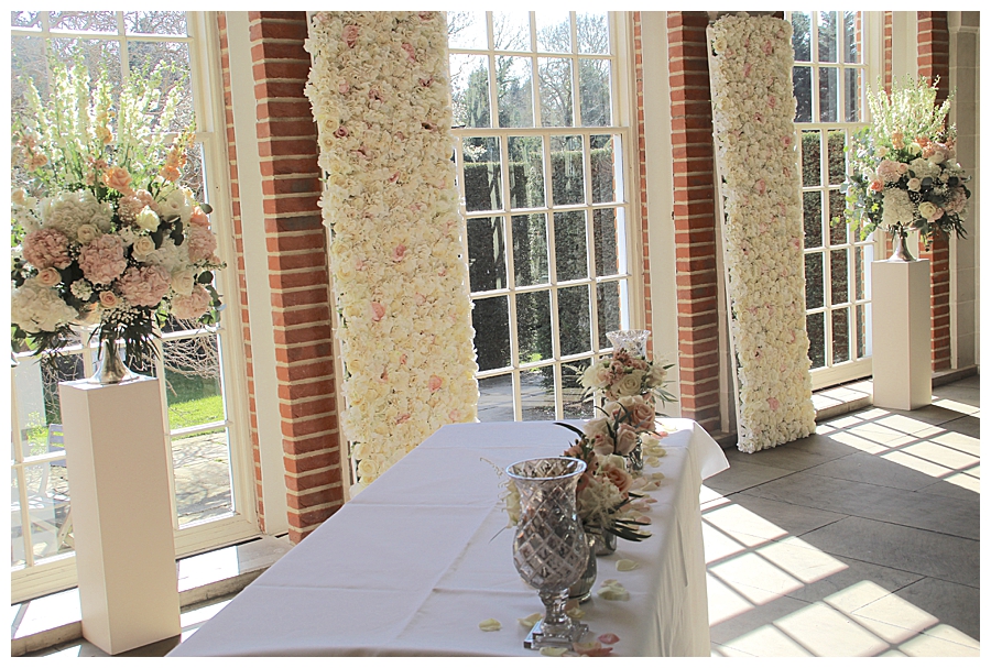 For the wedding ceremony, Natalie and Chris opted for a light and airy decor, with ghost chairs, letting the light that pours through the beautiful orangery windows flow right through and flood the whole room. We styled the aisle with pretty vintage posies of flowers in silver hanging vases, and added candlelit lantern vases down the aisle and rose petals scatter to define the wedding aisle. The stone pillars at the front and back of the room, were also defined with our opulent stunning flower-wall panels. Since the chairs were see through and light was in abundance, we had no reservations about putting anything in front of the gorgeous arched side windows. So here, we used the space to add more floral decor for the ceremony backdrop, by creating two gorgeous floral urns full of spring blooms. The atmosphere was magical, on this beautiful April day with sunshine bathing the Orangery in a perfect soft light. Following the ceremony, the wedding party enjoyed some beautiful April sunshine with gorgeous trees in bud!