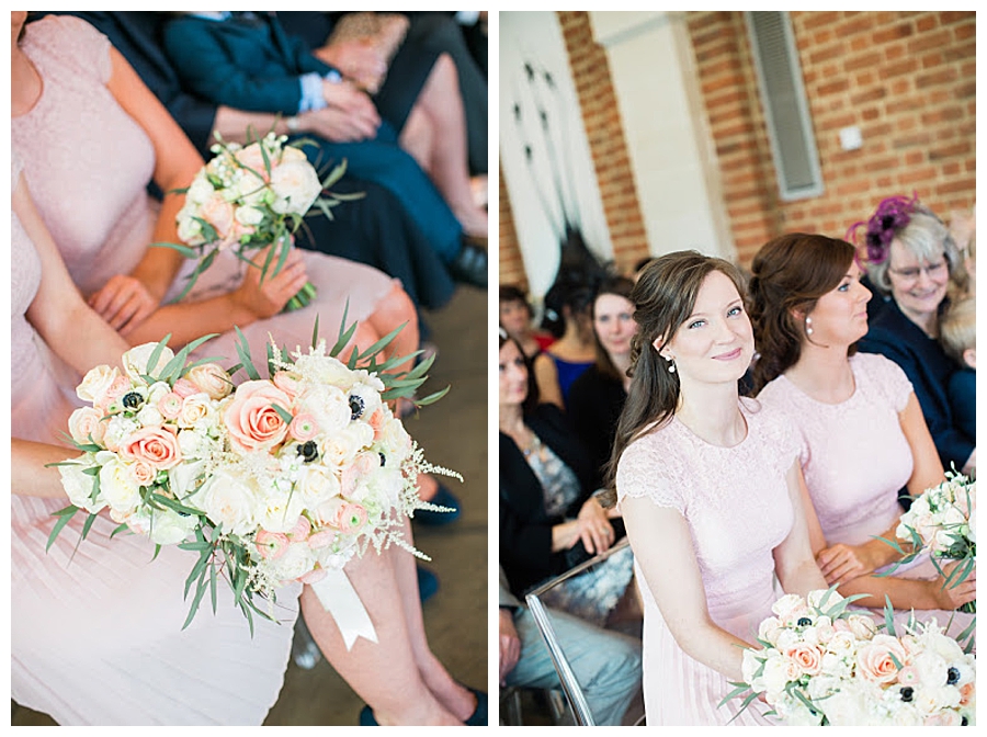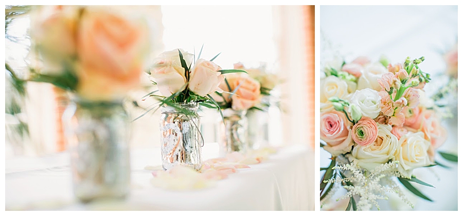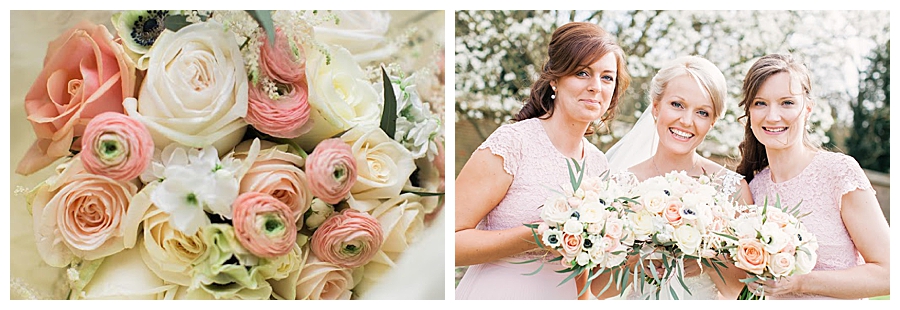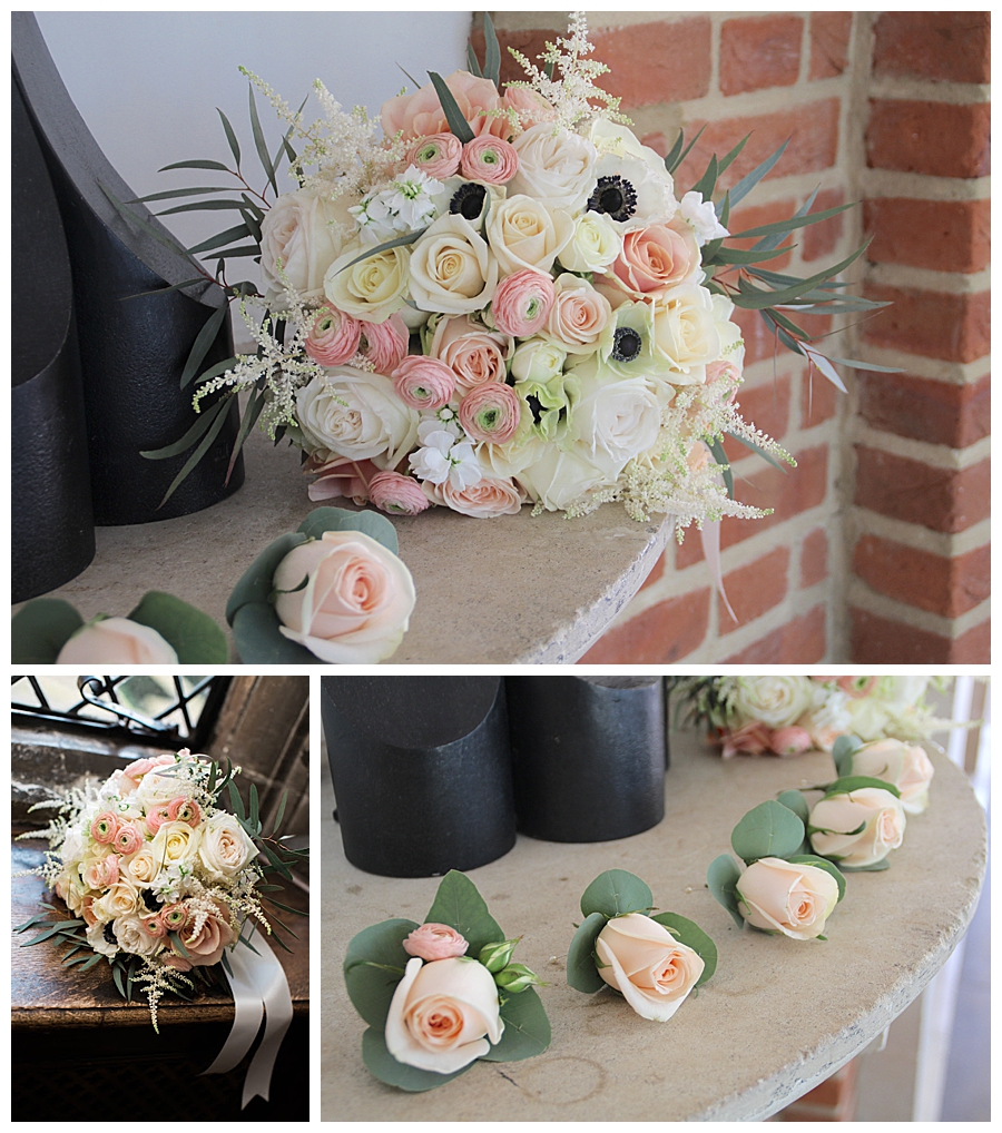Natalie and her bridesmaids carried bloomy bouquets with roses, Klooney ranunculus, spray roses and enchanting anemones, with eucalyptus accents, in soft ivory, blush and pale peach fuzz shades. The men wore peach fuzz rose buttonholes with silvery green eucalyptus.
