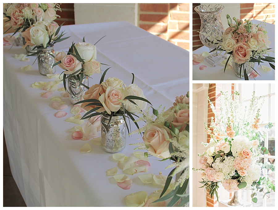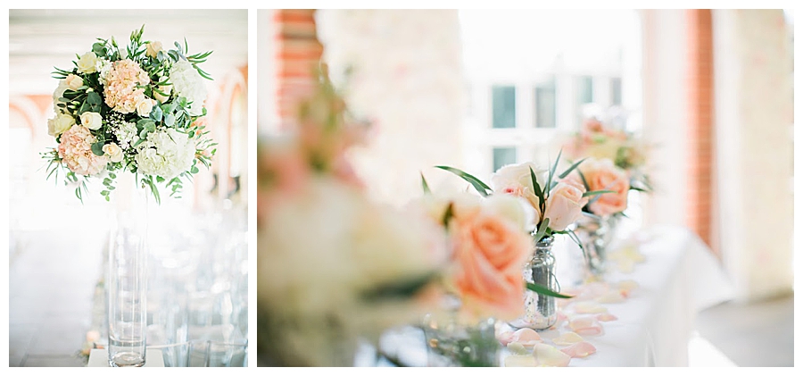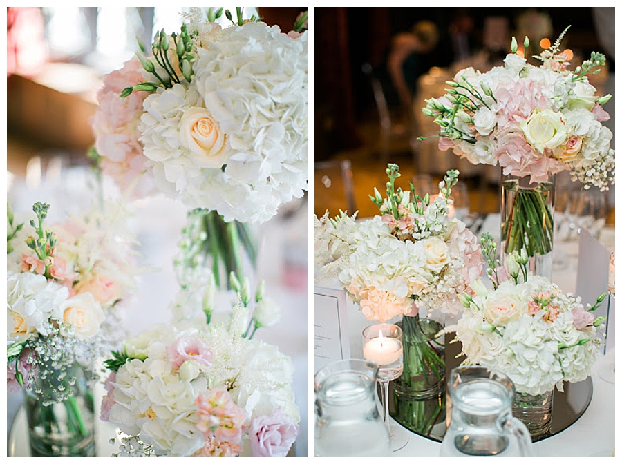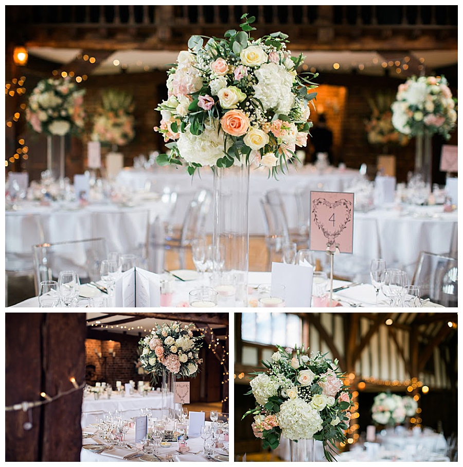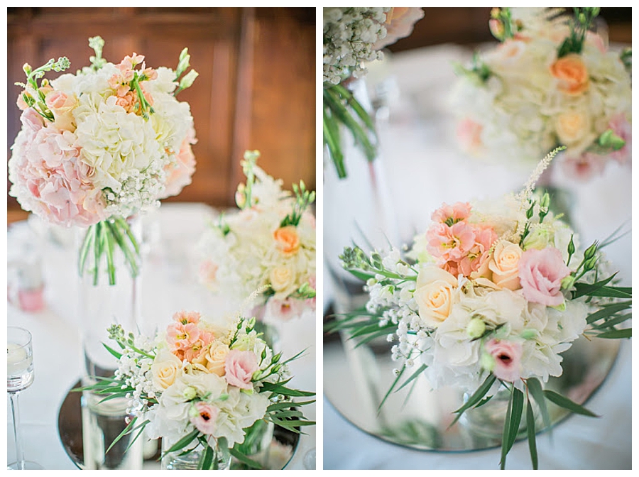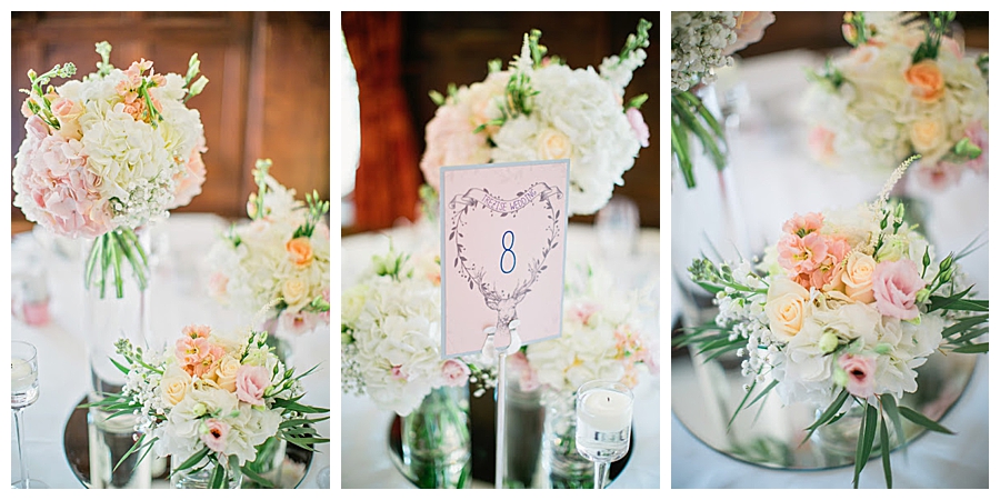 The guest tables at the hub of the beautiful Tithe barn were dressed with tall vases with vintage style blooms including hydrangeas, roses, lisianthus and scented stocks, with lacey gypsophila and flowy draping eucalyptus Nicoli. The tables under the eaves of the barn, where the ceiling is lower, were all dressed with a cluster of mixed height vases with ivory, blush and pale peach fuzz wedding flowers bouquets. We added floating candle vases and tall stemmed votives to complete the candlelit look.