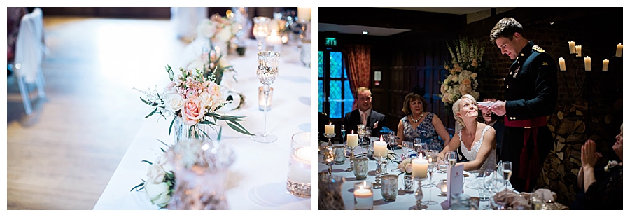 The wedding breakfast was held in the atmospheric Tithe Barn at Great Fosters. I count myself lucky as a wedding florist to work with such a beautiful venue, I adore the tall ceilings on the barn and the cosy feel it has even at larger weddings. For Natalie & Chris’ wedding, we styled the long oval top table with an eclectic mix of flower bouquets, vintage silver candle holders and candlestick holders and tall stemmed votives, adding a really cosy and intimate feel to the large top table.