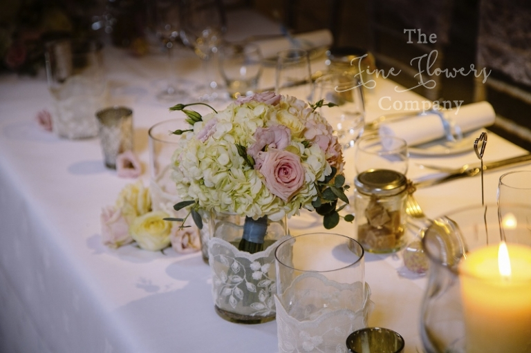 Charlottes carried a lavish bouquet of textural hydrangeas, Avalanche and pale blush O’Hara garden roses, lisianthus and dainty pale blue muscari, and her bridesmaids had coordinating blush and pale blue bouquets which looked stunning against their pale blue dresses. For the wedding aisle, we created a beautiful bloomy walk amongst tall and low candelabras and candleholders packed with pretty country style blooms. For the ceremony area, we created a beautiful backdrop of a dreamy tule canopy tumbling around two rustic flowers columns for a really romantic look. The ceremony table was styled with pretty lace covered vases of ivory and blush hydrangeas and roses. All centrepieces were then cleverly reused in the Tithe Barn – the tall lavish candelabra centrepieces dressing the middle of the Tithe Barn, where the ceiling is very tall, while the lower rings of flowers around vintage candle holders, were used to dress the tables on the sides of the Tithe Barn and lined up for an eclectic pretty effect along the top table.