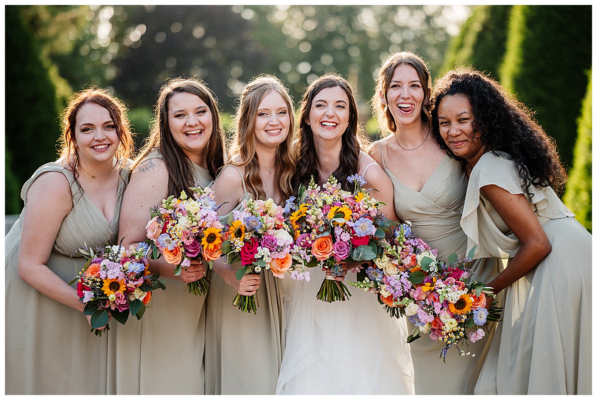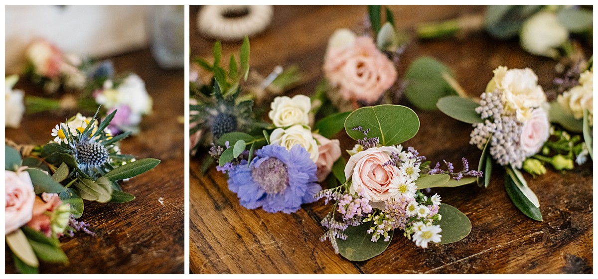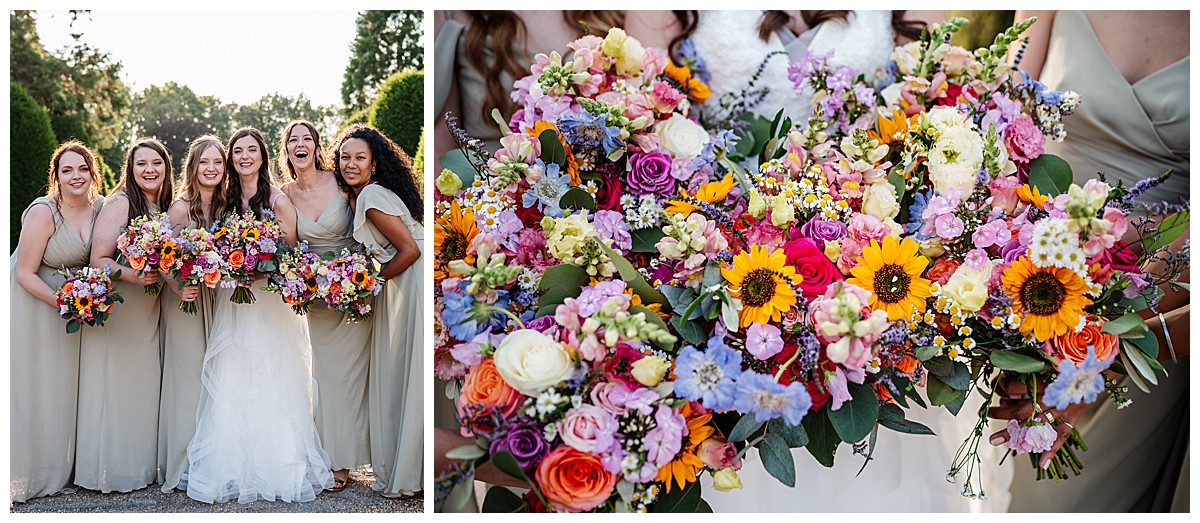 Sophie envisioned mixed and textural bouquets for herself and her bridesmaids, with a just-picked look and a burst of colour. The bouquets featured a delightful blend of flowers, including roses, ranunculus, muscari, scented stocks, astilbe, and wild fennel to name just a few as the list goes on… Soft pastel shades dominated the arrangements, with occasional pops of deeper fuchsia and purple. The result was really rich and vibrant and the colours looked amazing.