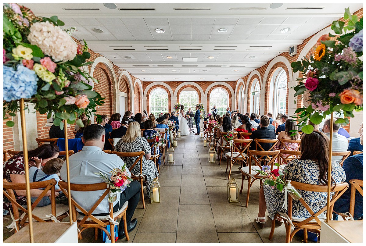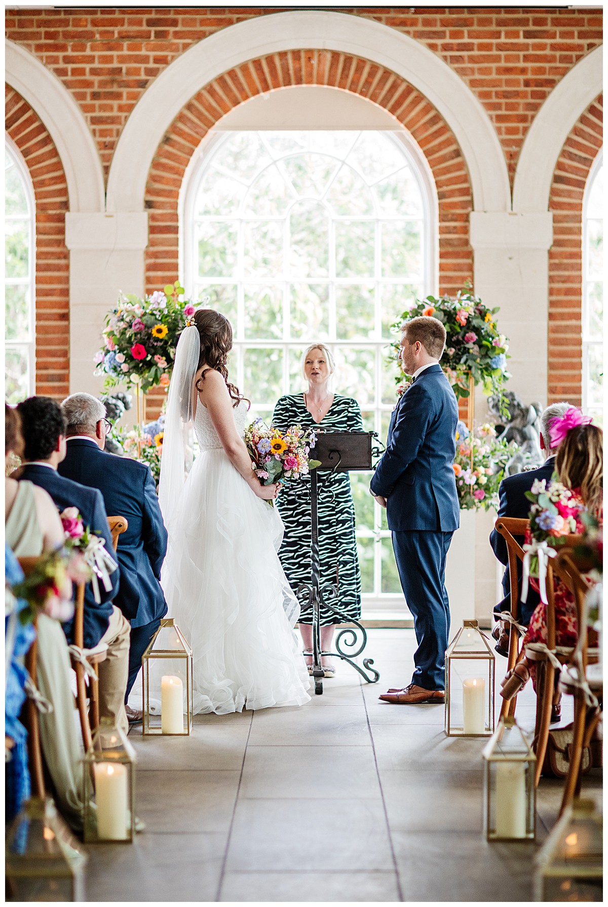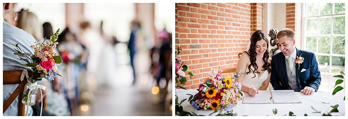 The wedding ceremony took place in the enchanting Great Fosters Orangery, which was colourfully dressed with four tall and colourful displays, framing the ceremony area and the back of the aisle. To complement the vibrant colours, we used tall gold stands to stand the flowers on, and raised them up higher, to head height, on modern art gallery style display plinths. To infuse a splash of colour in between, chair flower posies in hanging jars of water, were placed on the sides of the rustic oak bent back chairs. While each chair back was different, the intentional randomness added a cute and playful element to the decor. Finally, gold lanterns were added down the aisle, to add extra ambiance and add to the rustic vibe.