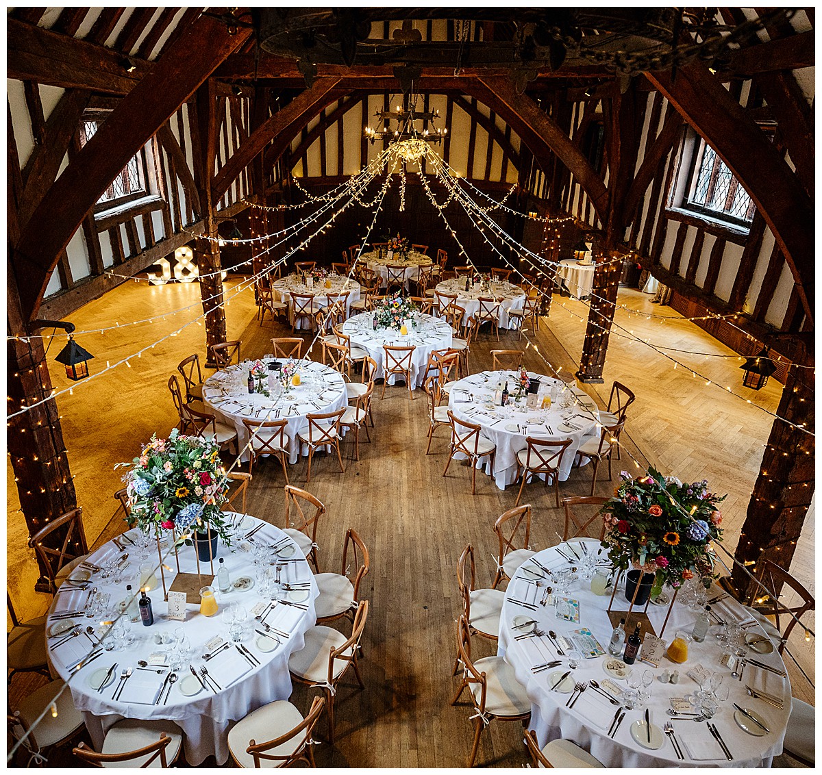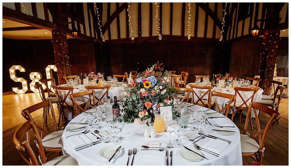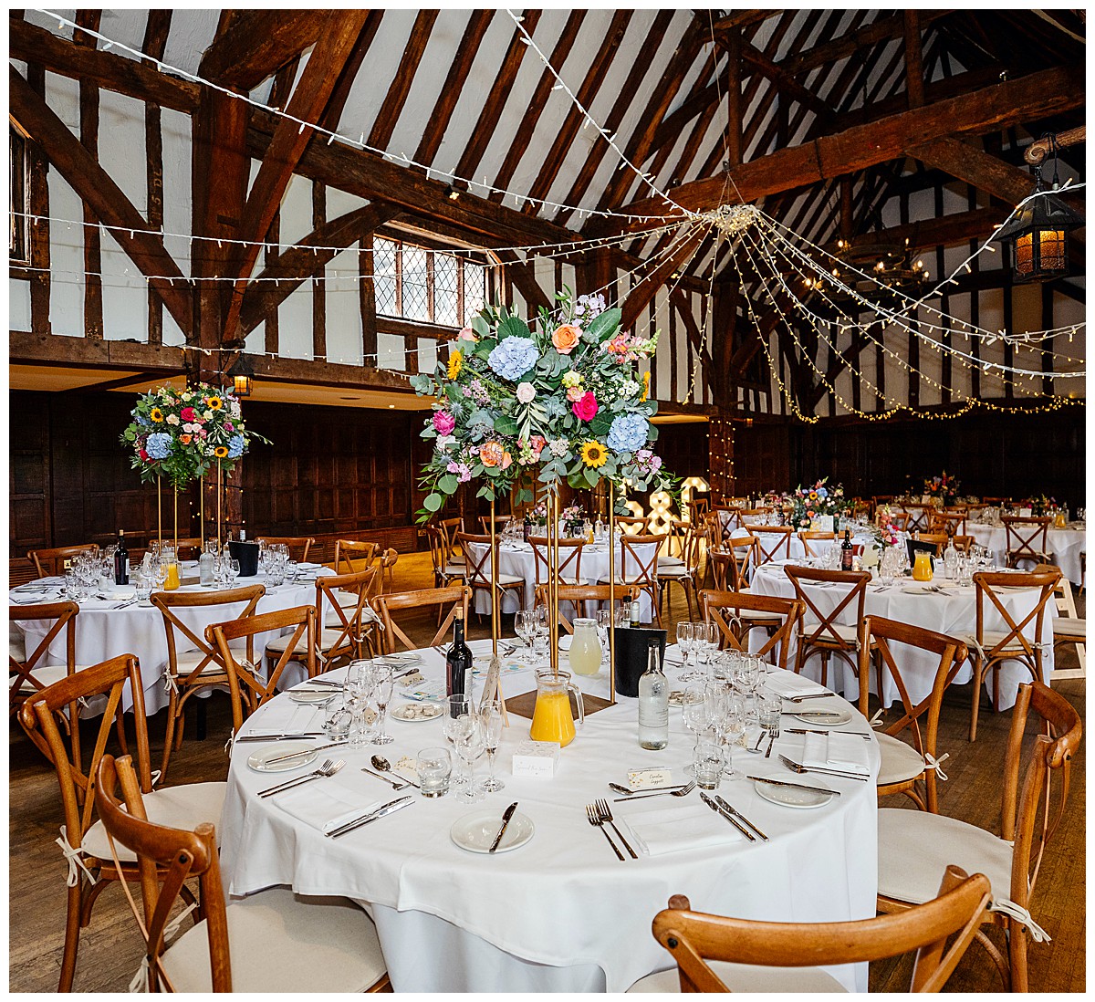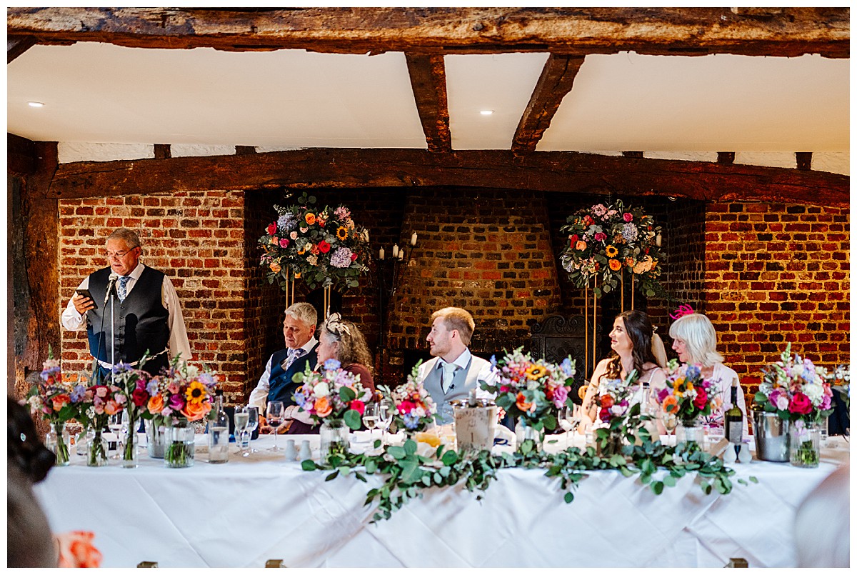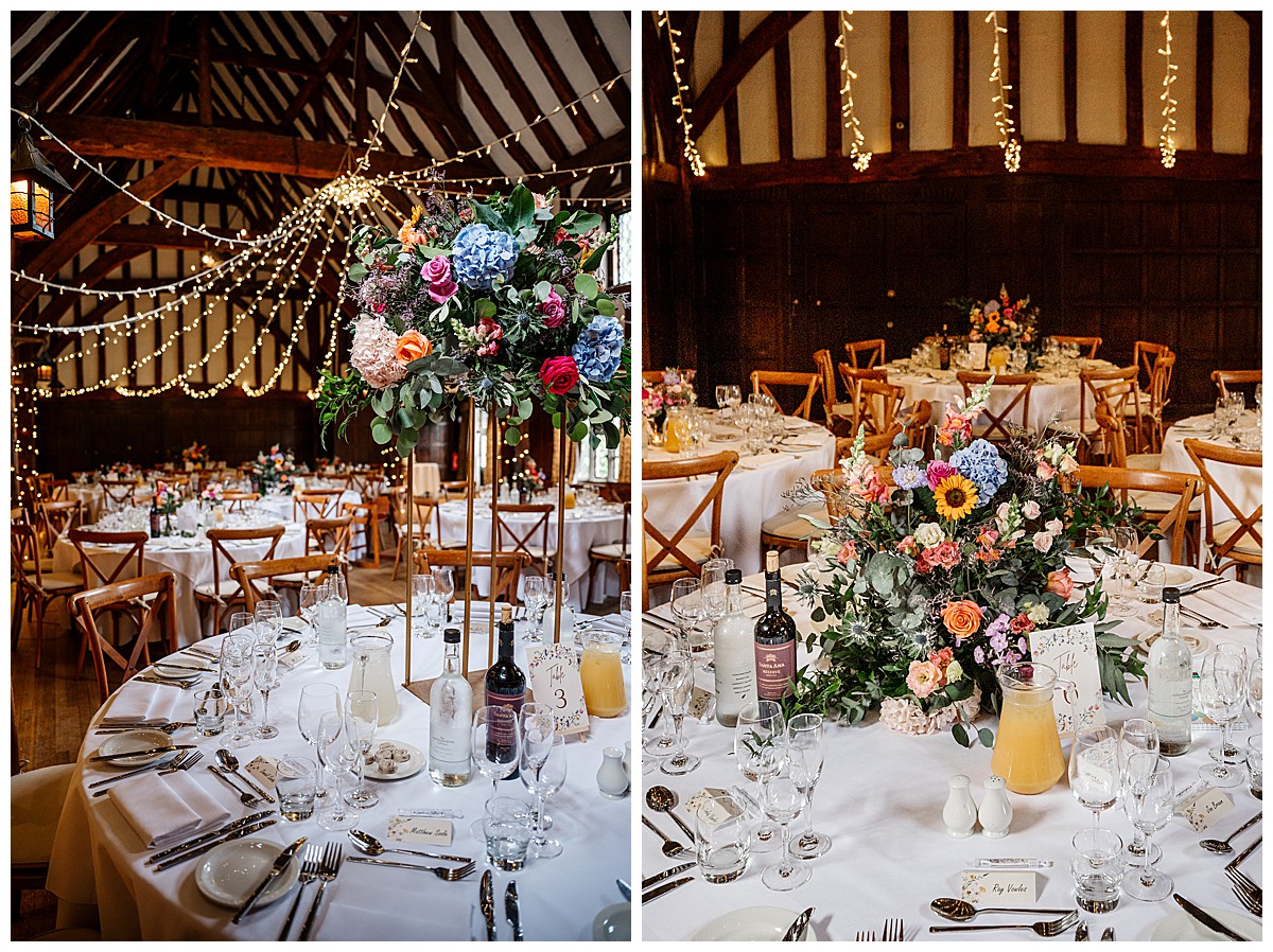 The wedding breakfast was held in the picturesque Tithe Barn, which continued the theme of vibrant colors and lively atmosphere. The ornamental centrepieces from the Orangery were supplemented by additional arrangements, creating a stunning visual display. Some of the tables were informally dressed with the chair posy bud vases clustered together, some with the tall focal display on gold stands, and some with loose flower-meadow-style displays. Up above, the historic tall barn space above the guest tables, were lit by atmospheric fairy light strings canopy provided by Party Lights. The lovely bent wood chairs were thanks to Academy Hire. Both of them are trusted suppliers at Great Fosters so if you are planning a Great Fosters wedding, reach out to them, you will be in good hands!