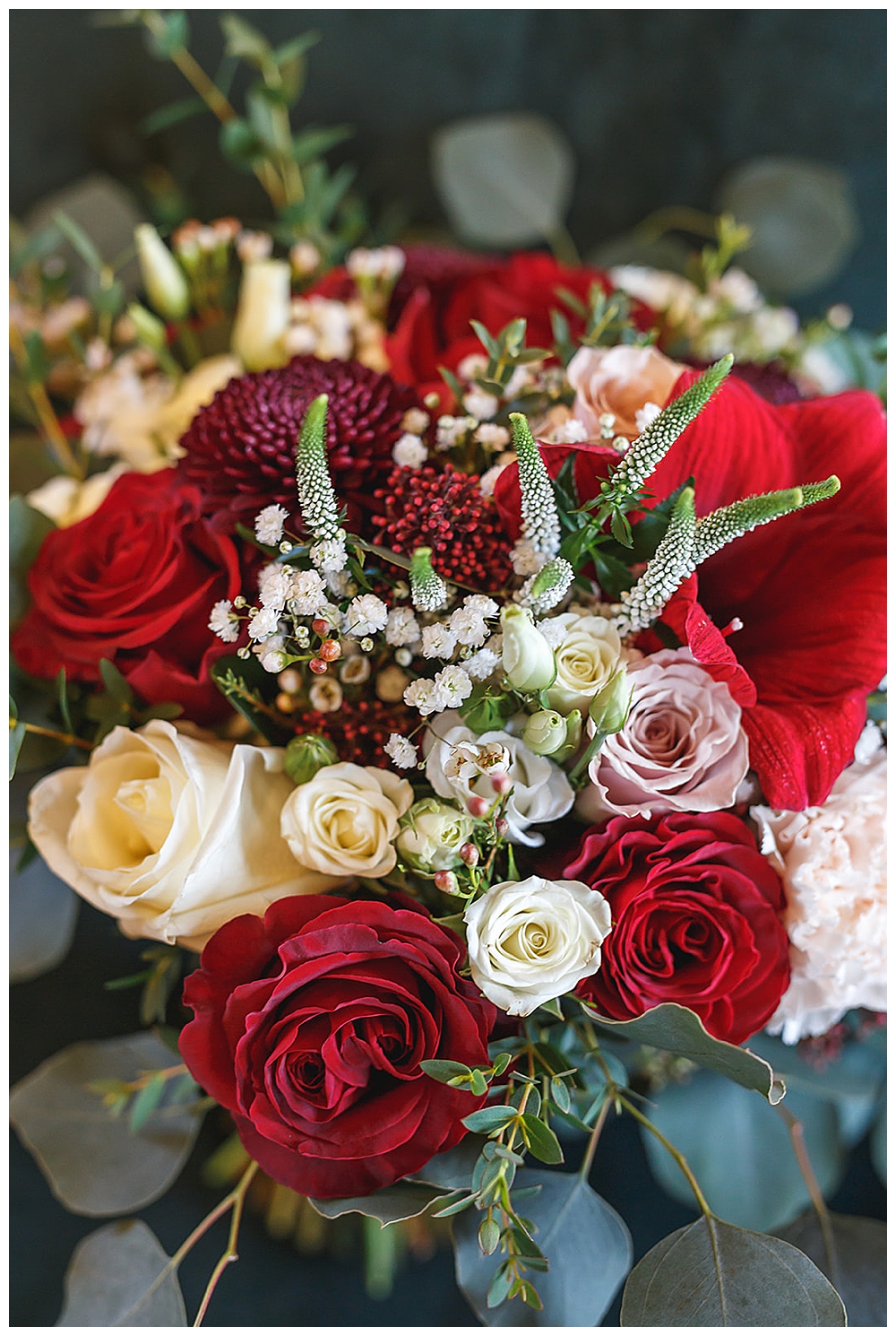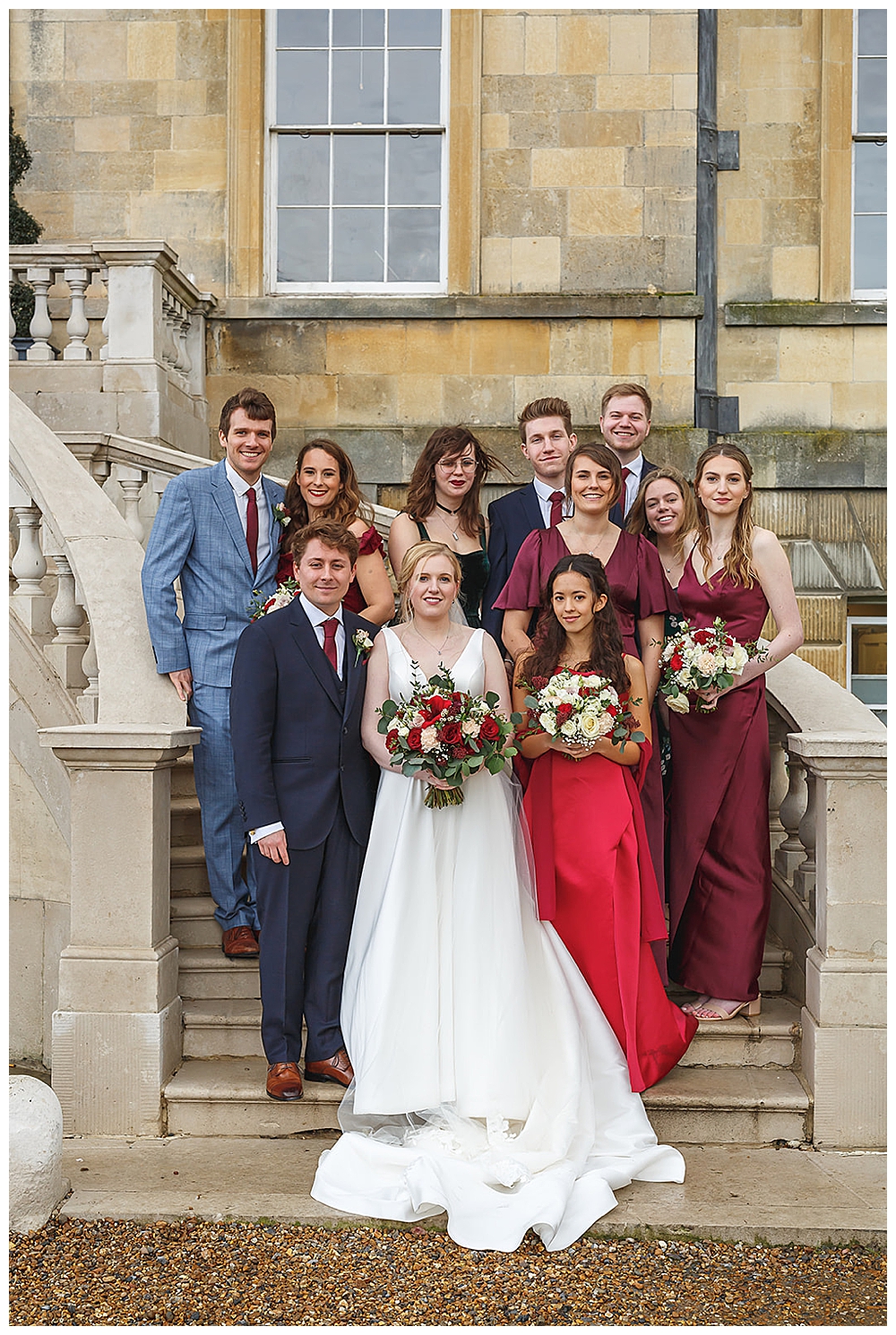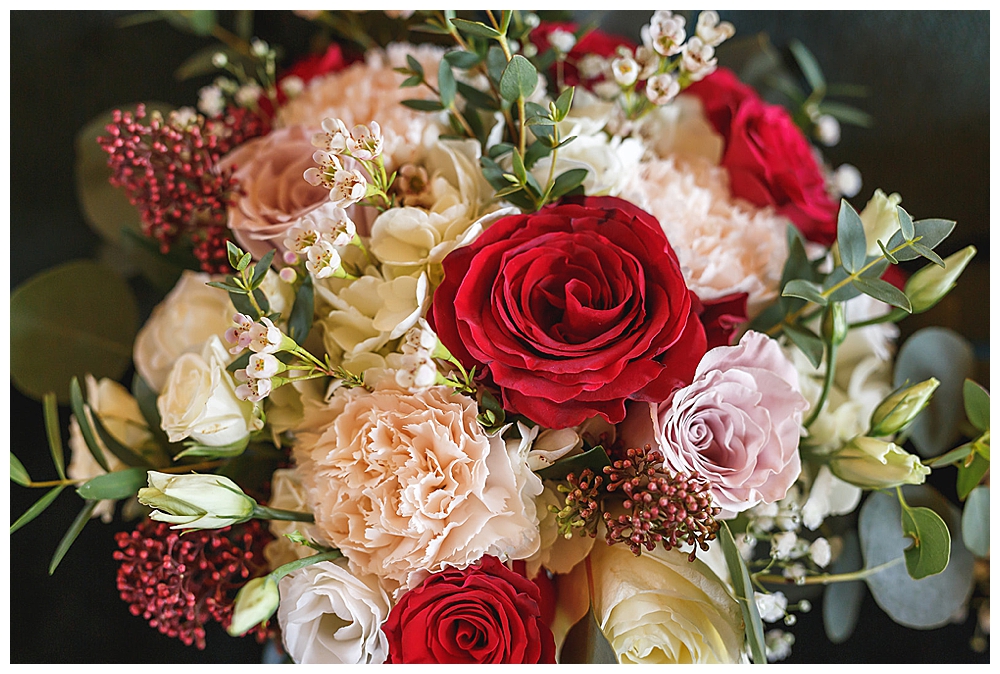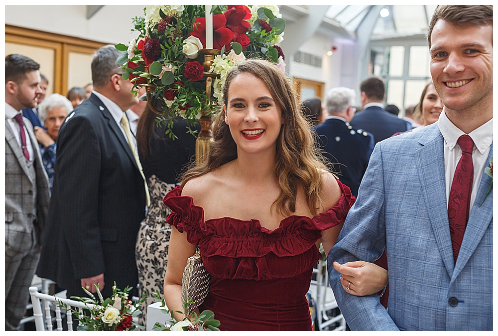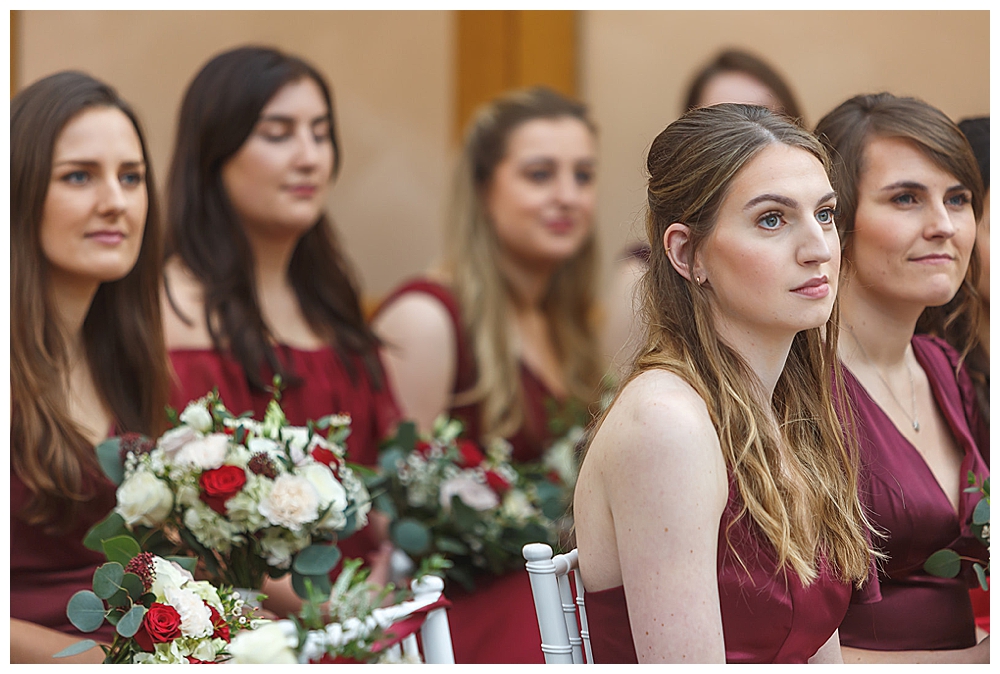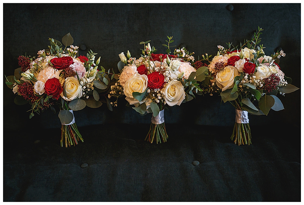 Zoe opted for for a textural hand-tied bouquet of large red garden roses, scented wax flowers, nude pink Menta roses, wintery skimmia and veronica spires, and the bridesmaids had matching bouquets but with more of an ivory bias, to complement the bridal bouquet but stand out well against their deep red and burgundy dresses.  Callum wore a nude pink rose buttonhole with skimmia and wax flowers.
