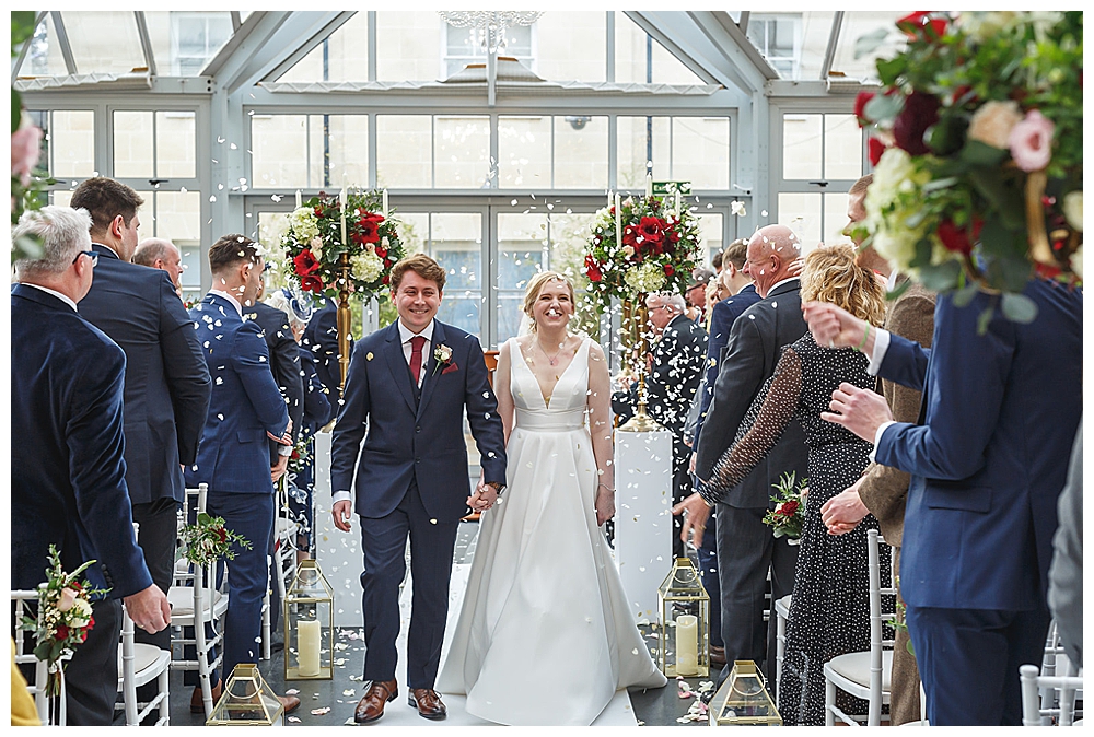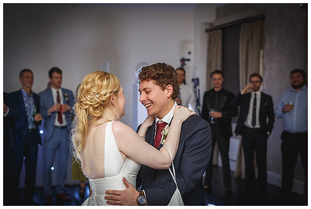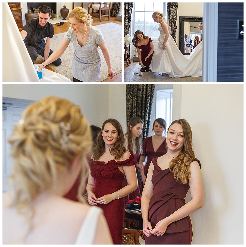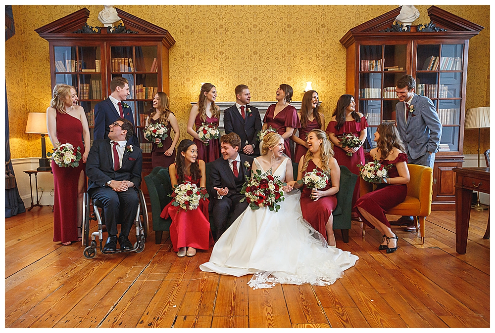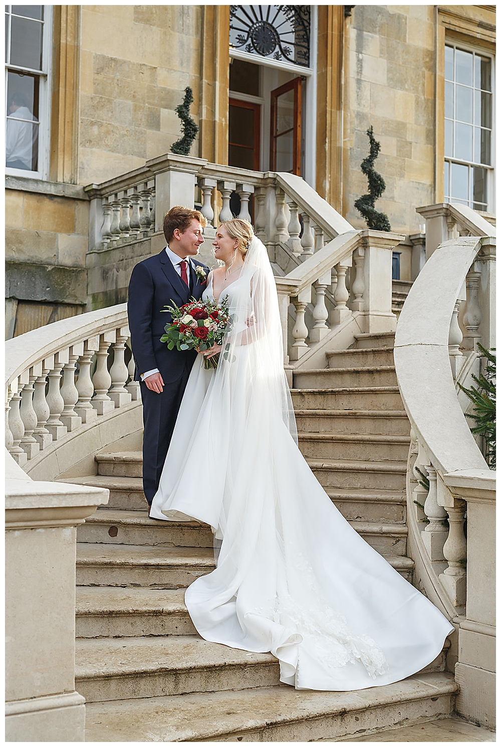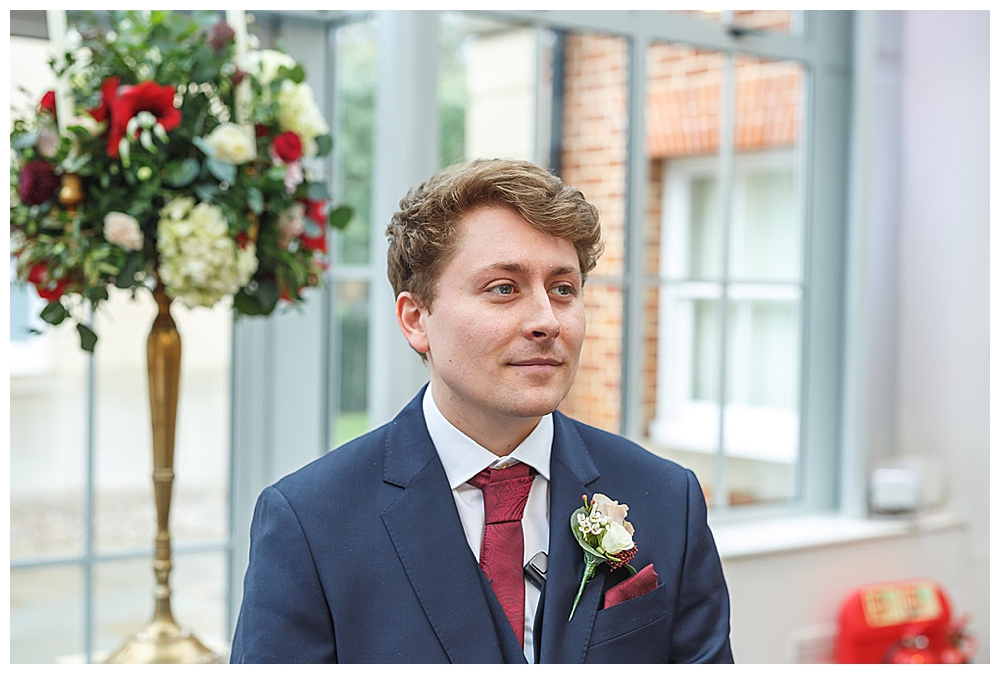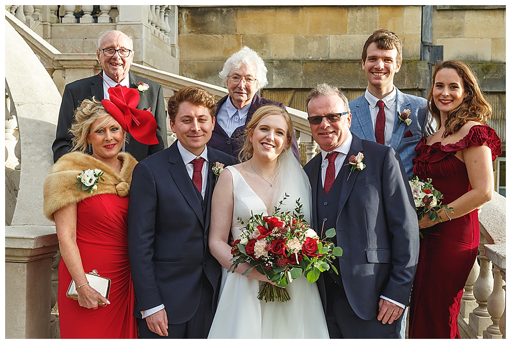 Zoe opted for for a textural hand-tied bouquet of large red garden roses, scented wax flowers, nude pink Menta roses, wintery skimmia and veronica spires, and the bridesmaids had matching bouquets but with more of an ivory bias, to complement the bridal bouquet but stand out well against their deep red and burgundy dresses.  Callum wore a nude pink rose buttonhole with skimmia and wax flowers.