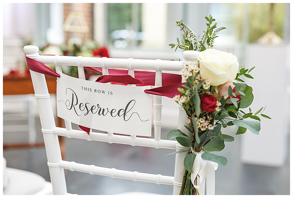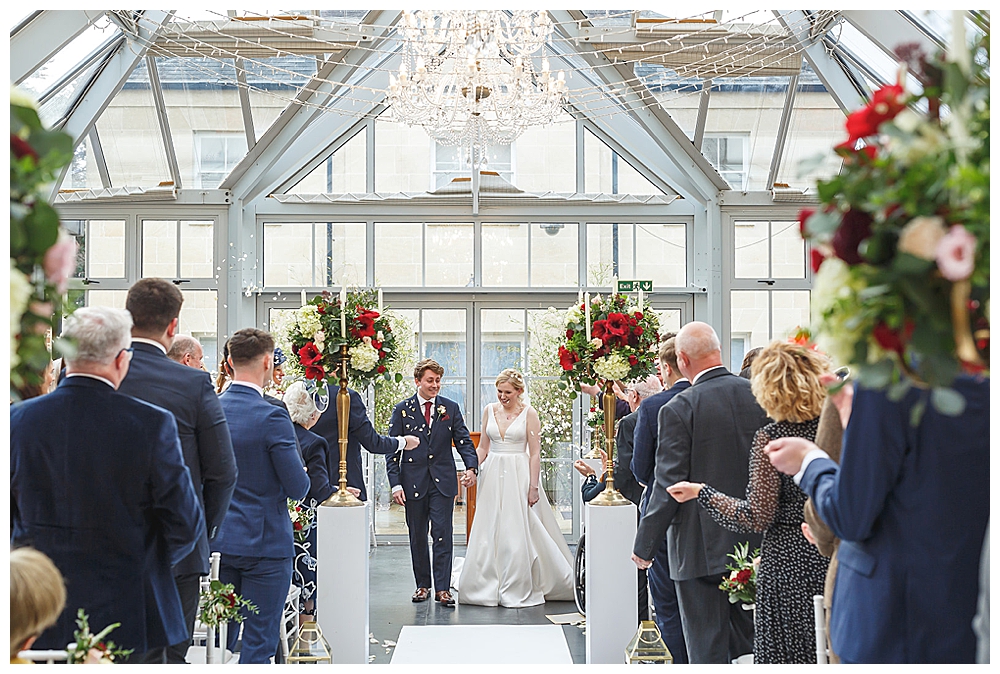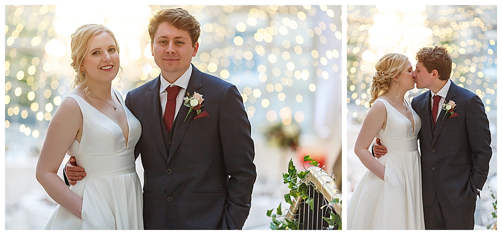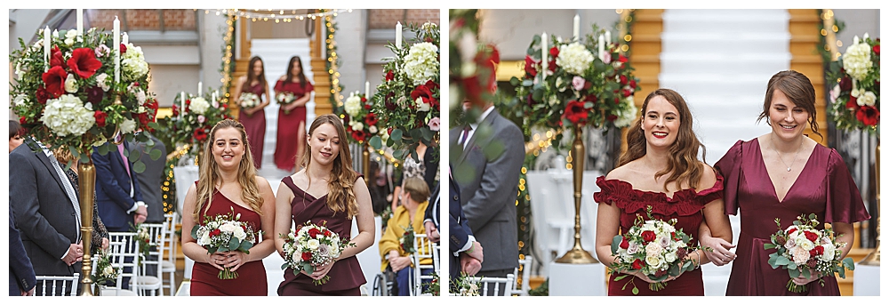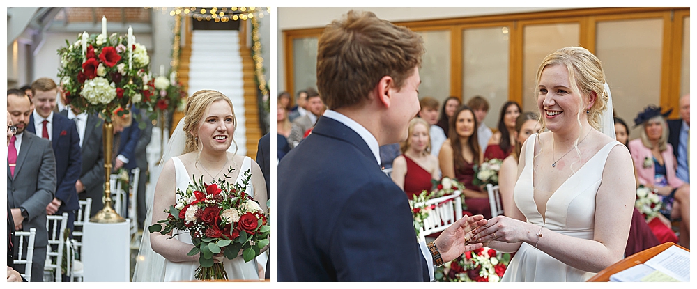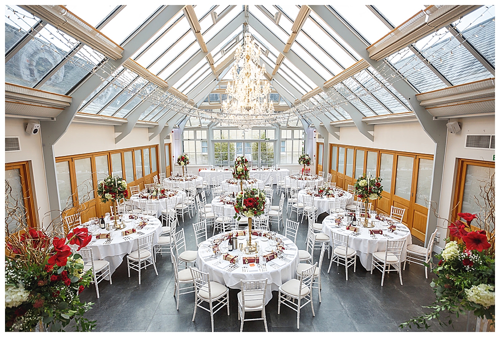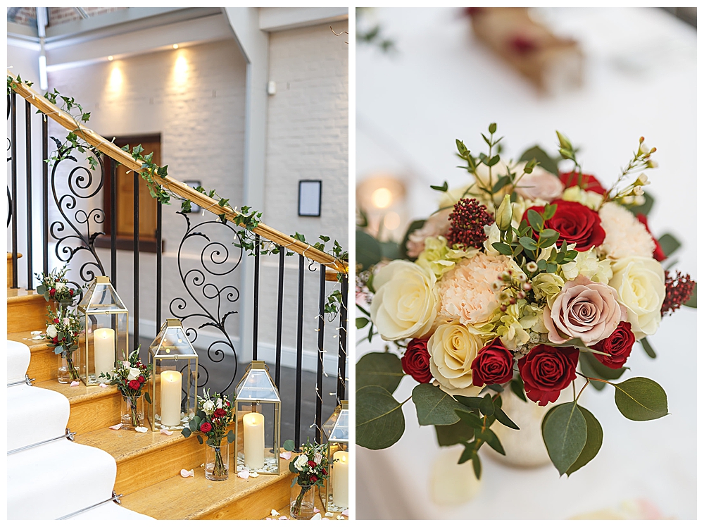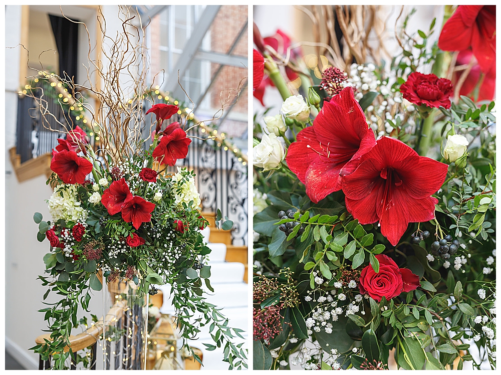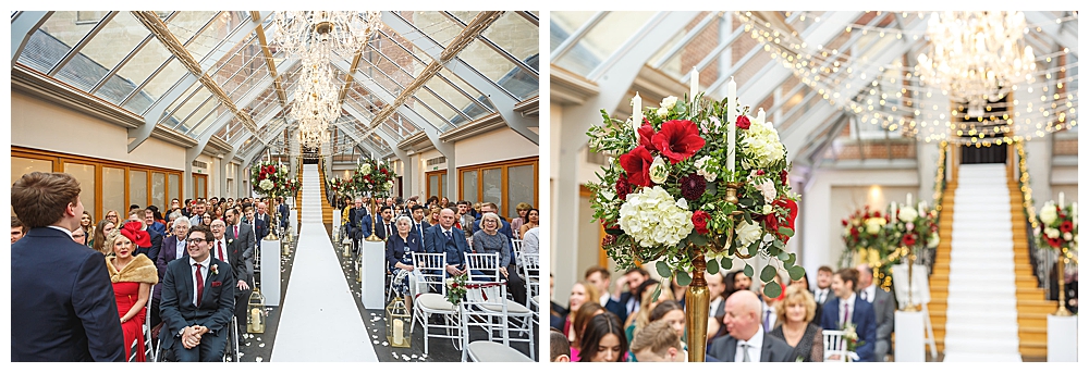 The wedding ceremony and reception were both held at Botleys, a grand Palladian stately home near Chertsey. Guests were welcomed in the upstairs hall by a wishing Christmas tree so that guests could write their messages on the baubles and hang them up.  The wedding ceremony was in the glasshouse Atrium downstairs which let in an amazing amount of cool December light.  At this fabulous Christmas wedding at Botleys Mansion, we dressed the wedding aisle with tall gold candelabra centrepieces, lanterns on the floor and pretty chair posies.  We flanked the stairs down into the atrium with two impressive tall vases styled with twigs, seasonal for and wintery opulent amaryllis lilies and dressed the lower steps with matching lanterns and vases of flowers.   The ceremony table was dressed with candlelit floral wreaths in festive colours.