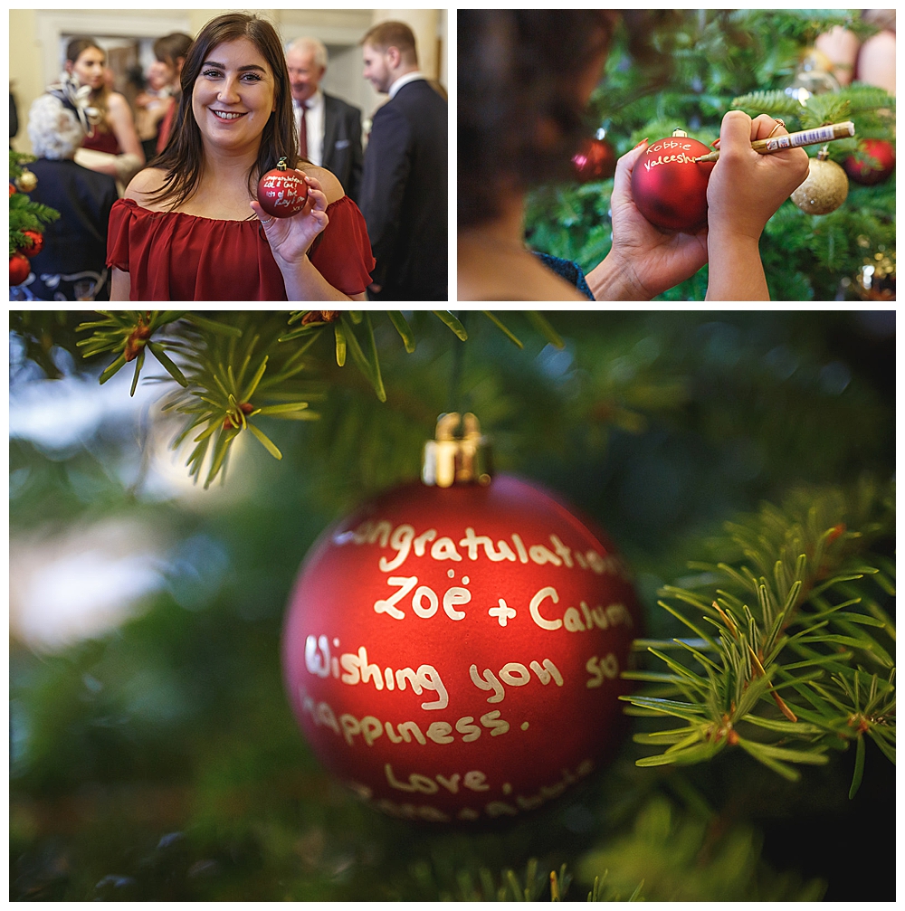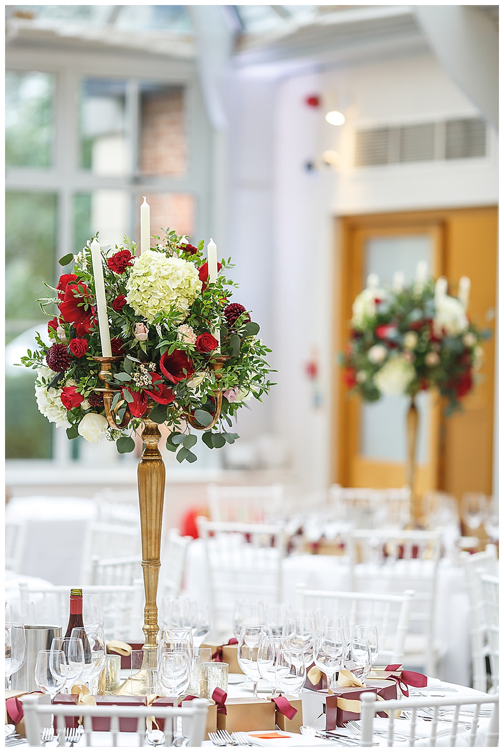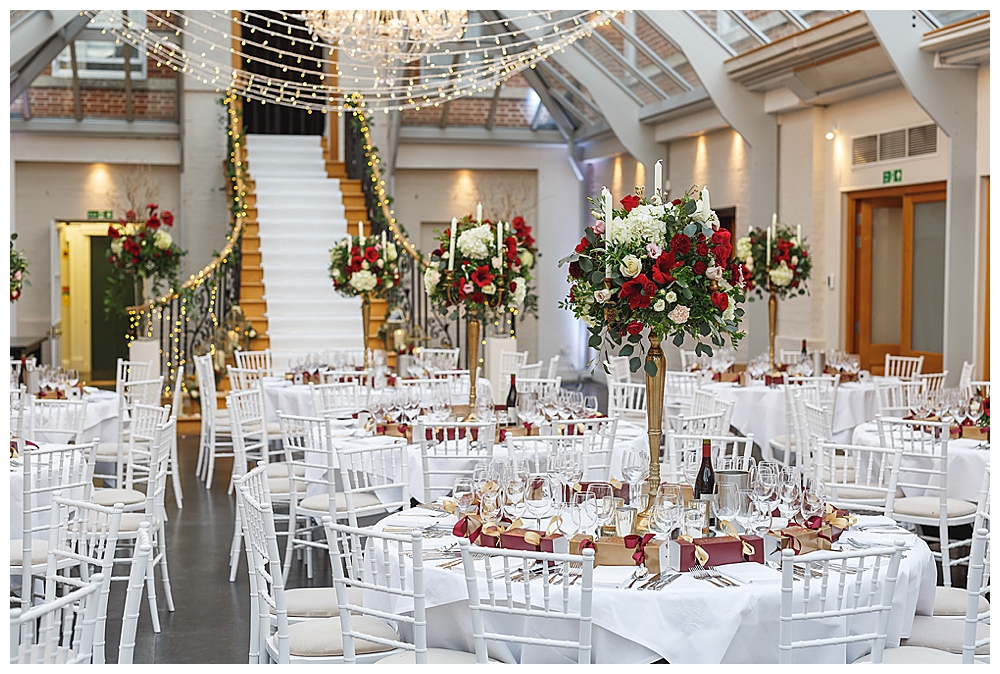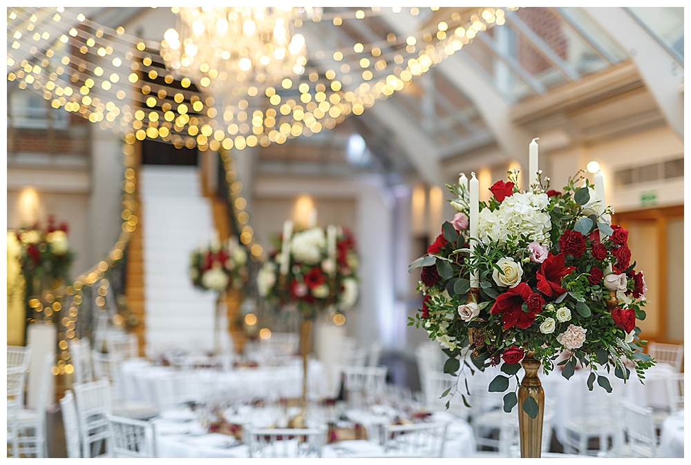 This Christmas wedding at Botleys Mansion was a real joy from start to finish, kicking off by my meeting with Zoe back in the spring,   It really doesn’t get more festive than this winter wedding.  Landing in between Christmas and the New Year, Zoe and Callum’s wedding was such a brilliant celebration, with quintessentially Christmas colours.  Zoe and Callum wanted to go the whole way with the festive look, with pillar box red and ivory flowers, gold accents, Christmas baubles and seasonal fir foliage.