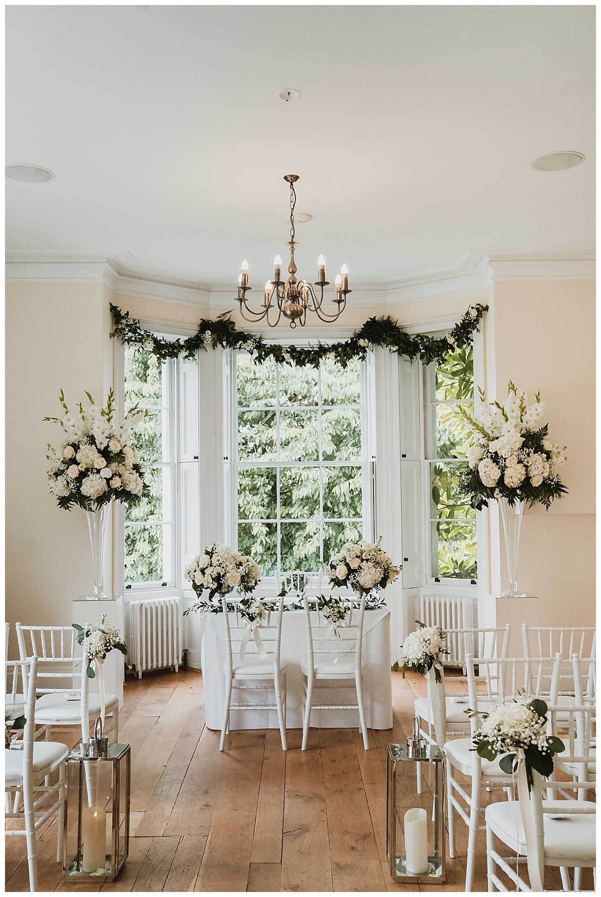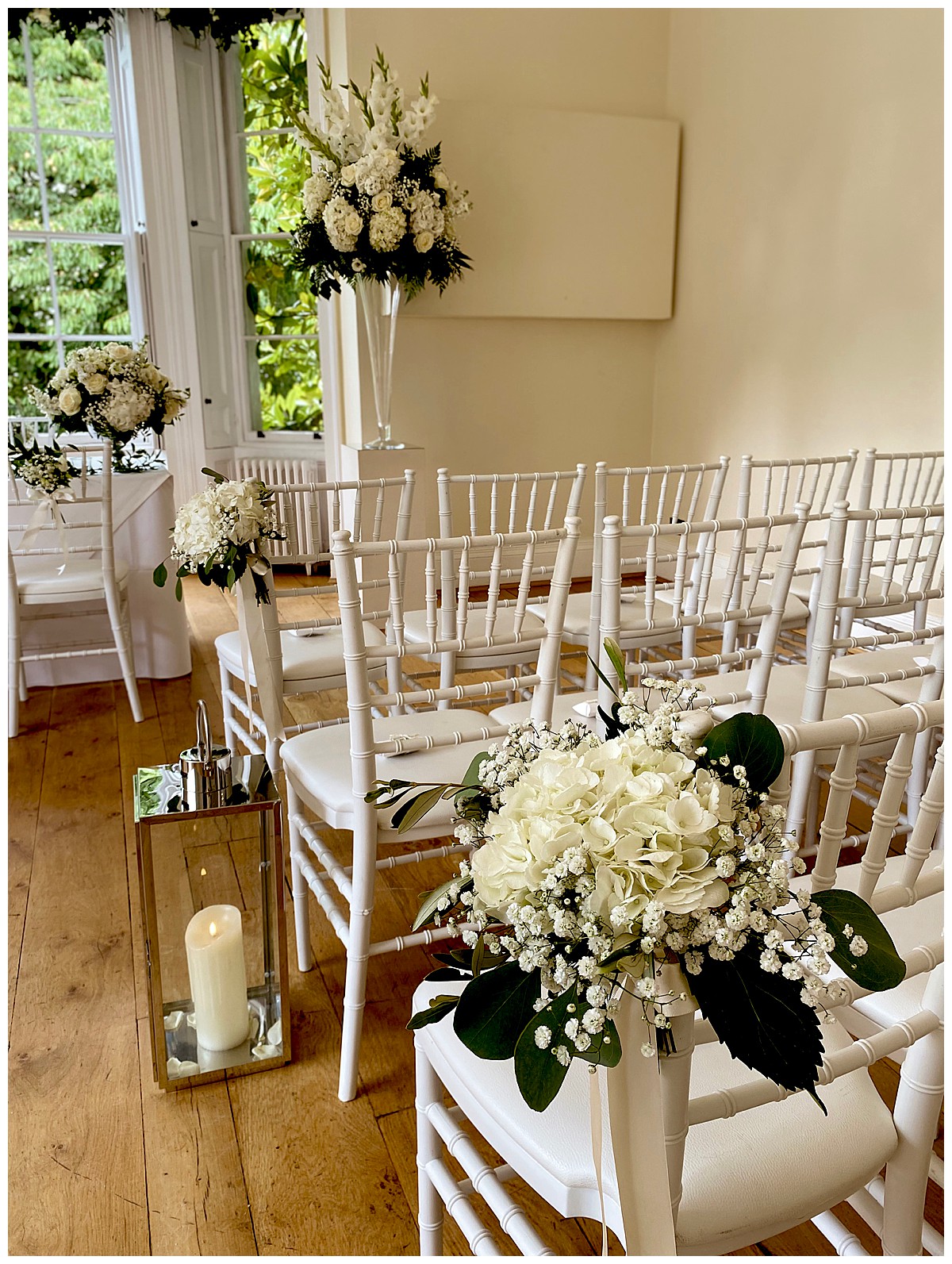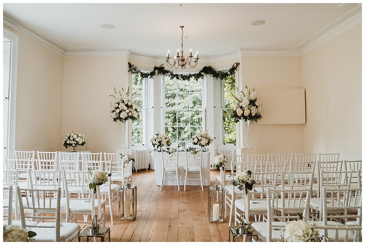 Inside at Pembroke Lodge, we dressed the stairs to the Russell Suite with lovely foliage and flower garlands, welcoming guests to the venue as they head up. The ceremony room was dressed with 2 elegant grand displays of hydrangeas and gladiola, flanking the ceremony area, and green foliage swags at the top of the bay window behind. The aisle was dressed with white chair posies of hydrangeas and gypsophila, and silver lanterns for candlelight. More little posies in little vintage silver bottles were lined up along the mantlepiece. The 2 low guest table centrepieces were also put to good use during the ceremony by using them on the ceremony table.