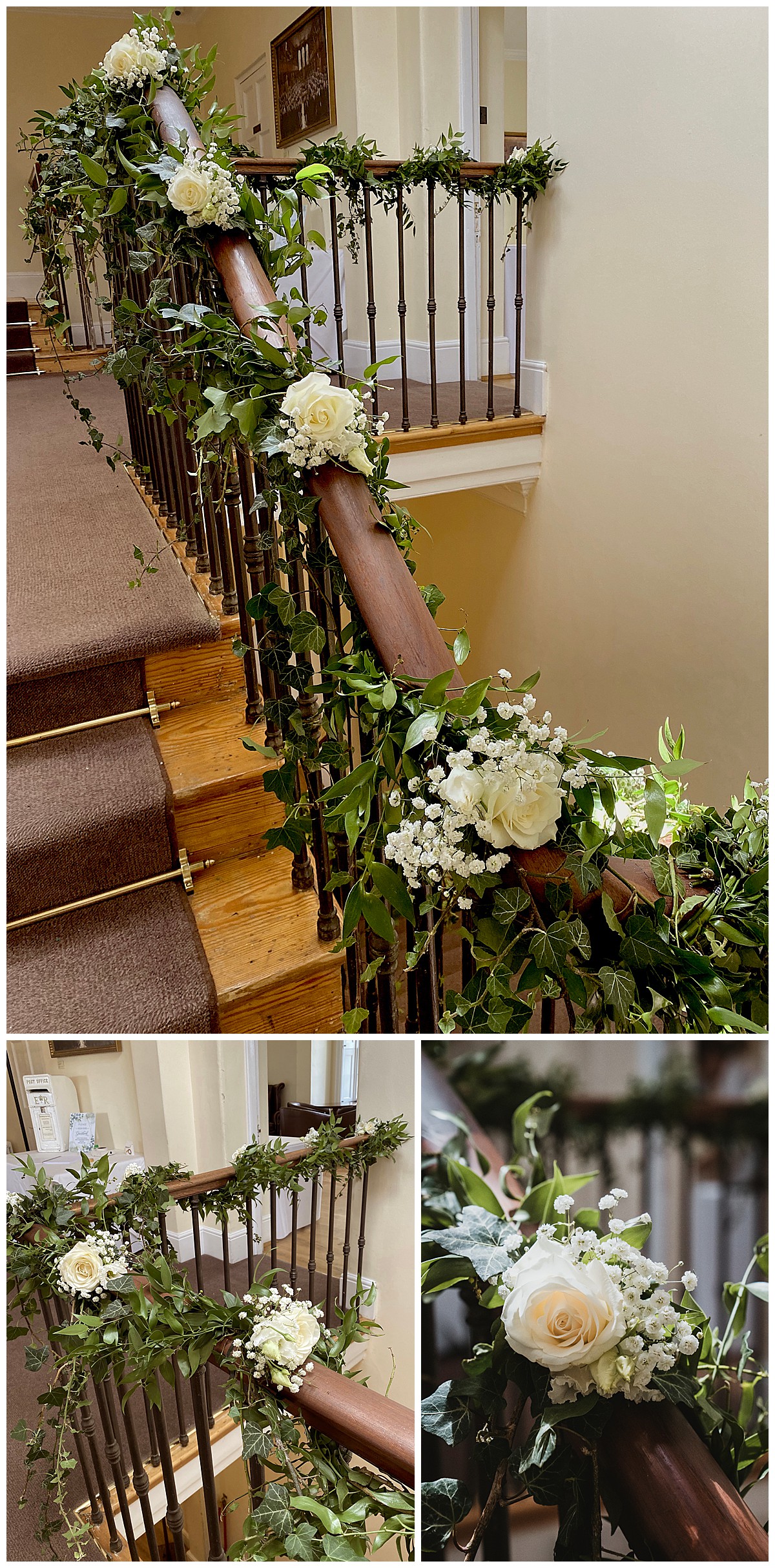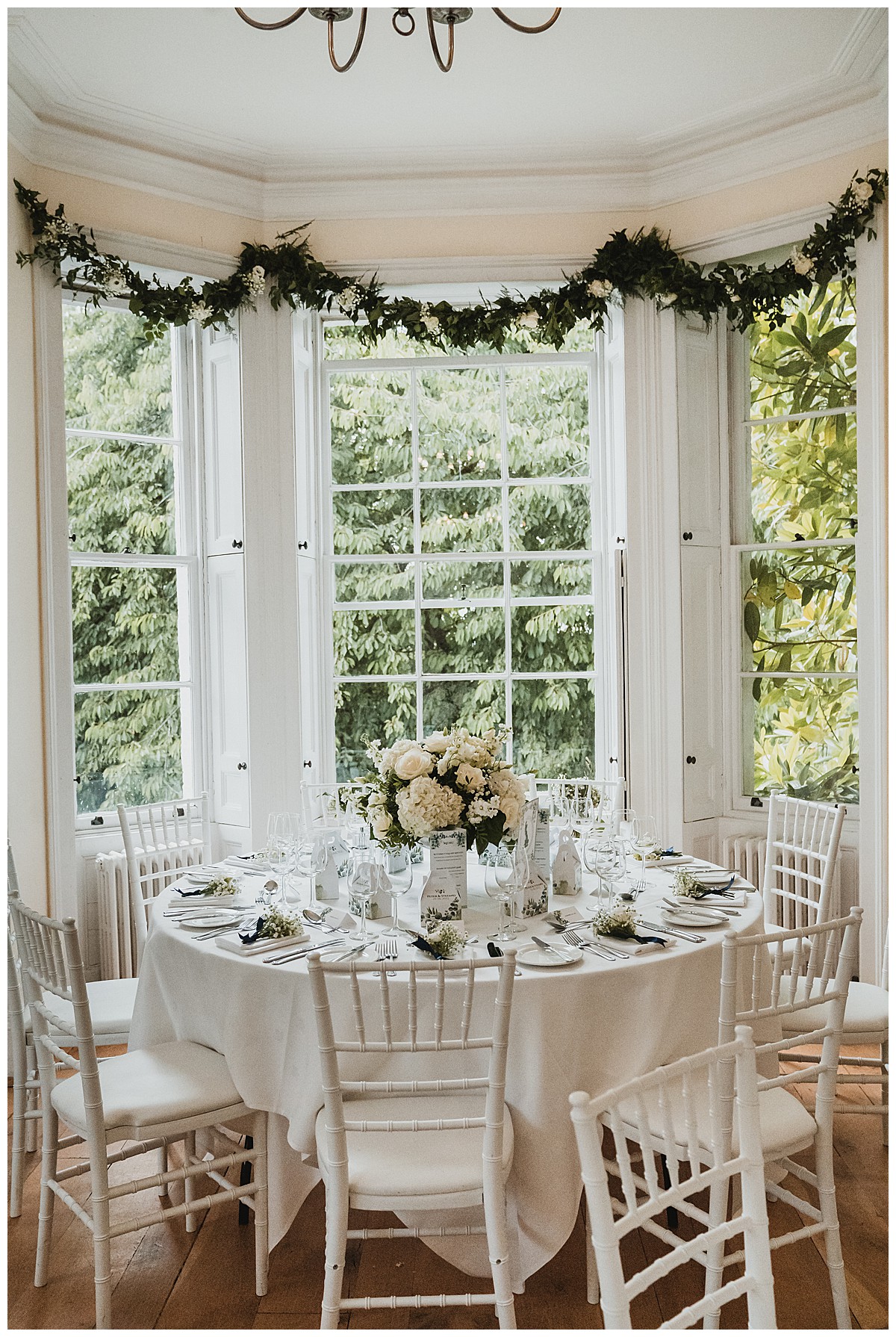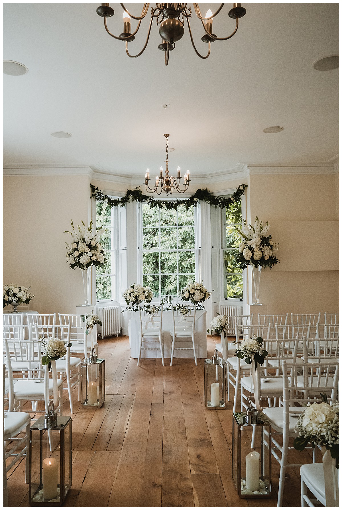 Inside at Pembroke Lodge, we dressed the stairs to the Russell Suite with lovely foliage and flower garlands, welcoming guests to the venue as they head up. The ceremony room was dressed with 2 elegant grand displays of hydrangeas and gladiola, flanking the ceremony area, and green foliage swags at the top of the bay window behind. The aisle was dressed with white chair posies of hydrangeas and gypsophila, and silver lanterns for candlelight. More little posies in little vintage silver bottles were lined up along the mantlepiece. The 2 low guest table centrepieces were also put to good use during the ceremony by using them on the ceremony table.
