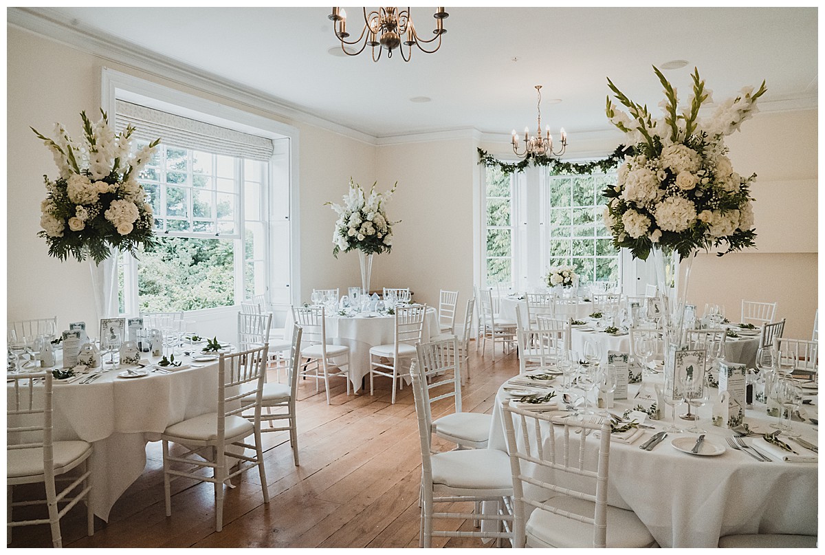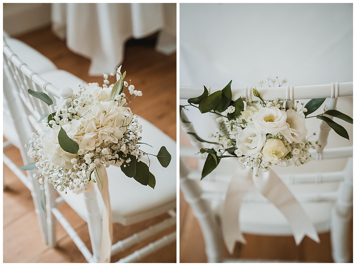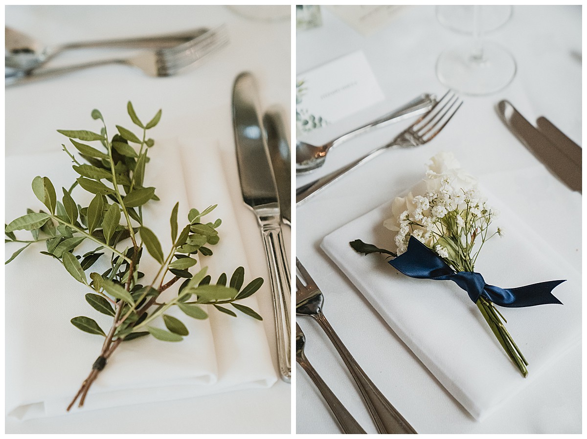 For the wedding breakfast, we added more matching tall displays on elegant fluted vases, and 2 of the guest tables were dressed with low silver rose bowls centrepieces bursting with white hydrangeas, roses, lisianthus and gypsohila. Finally, each napkin was styled with sprigs of foliage, and the top table napkins had little flower placeholders with dainty white lisianthus and gypsophila.