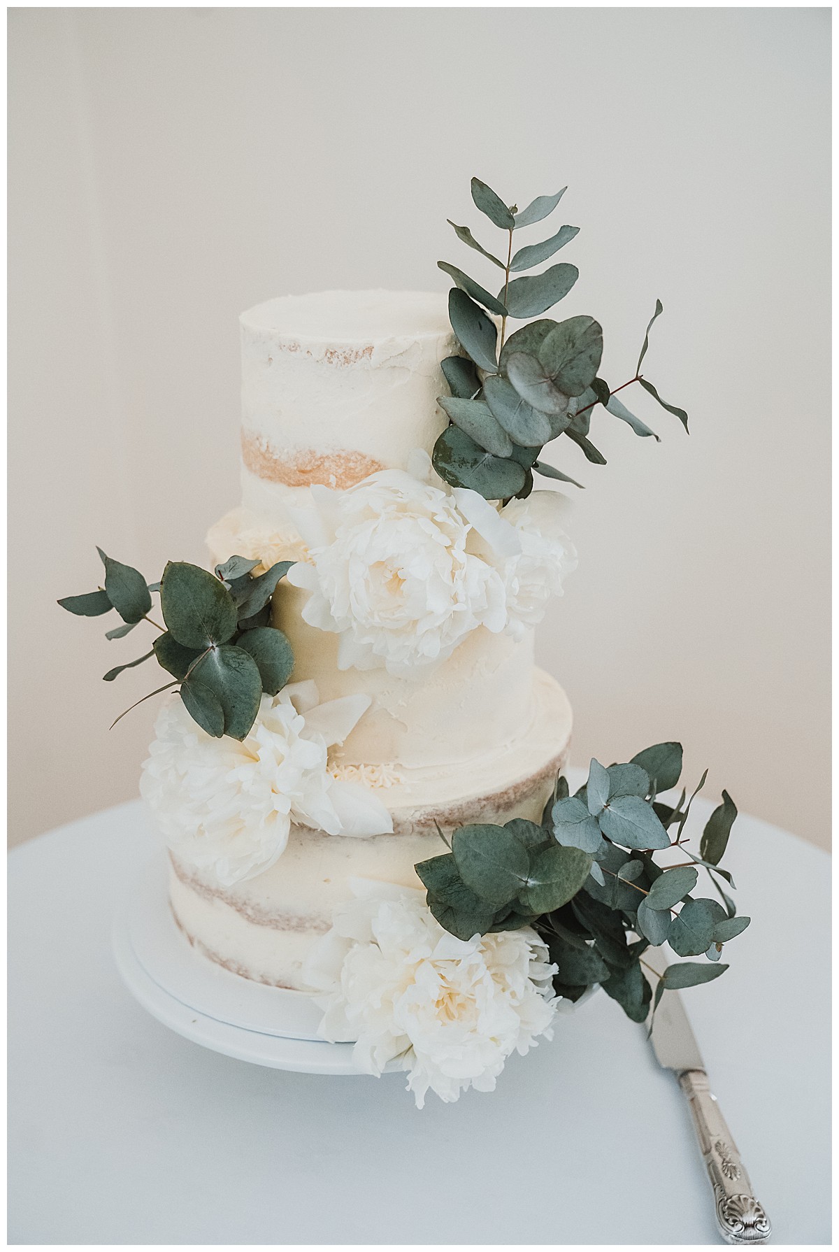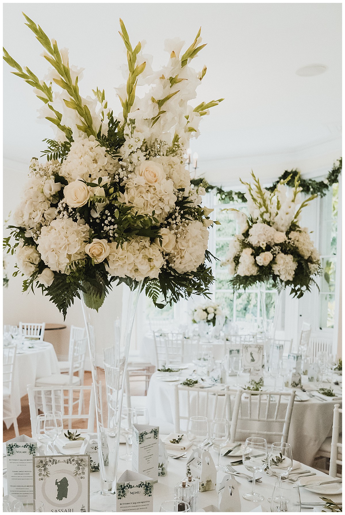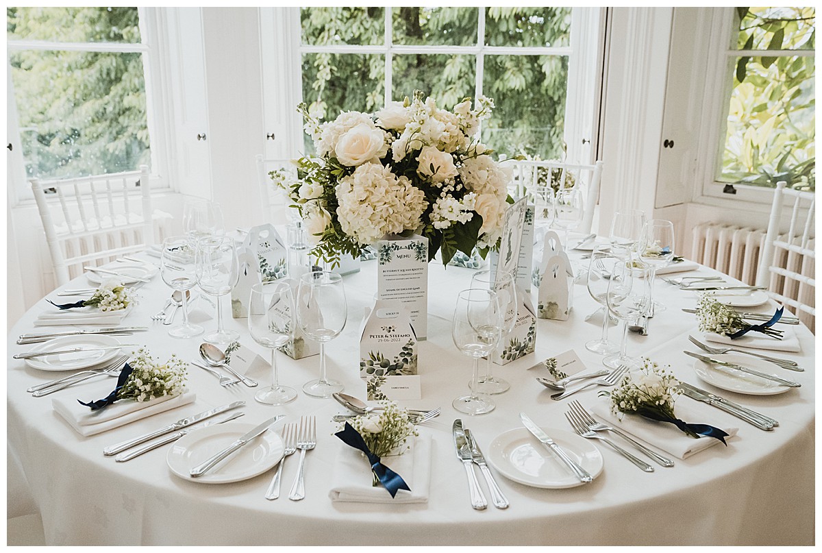 For the wedding breakfast, we added more matching tall displays on elegant fluted vases, and 2 of the guest tables were dressed with low silver rose bowls centrepieces bursting with white hydrangeas, roses, lisianthus and gypsohila. Finally, each napkin was styled with sprigs of foliage, and the top table napkins had little flower placeholders with dainty white lisianthus and gypsophila.