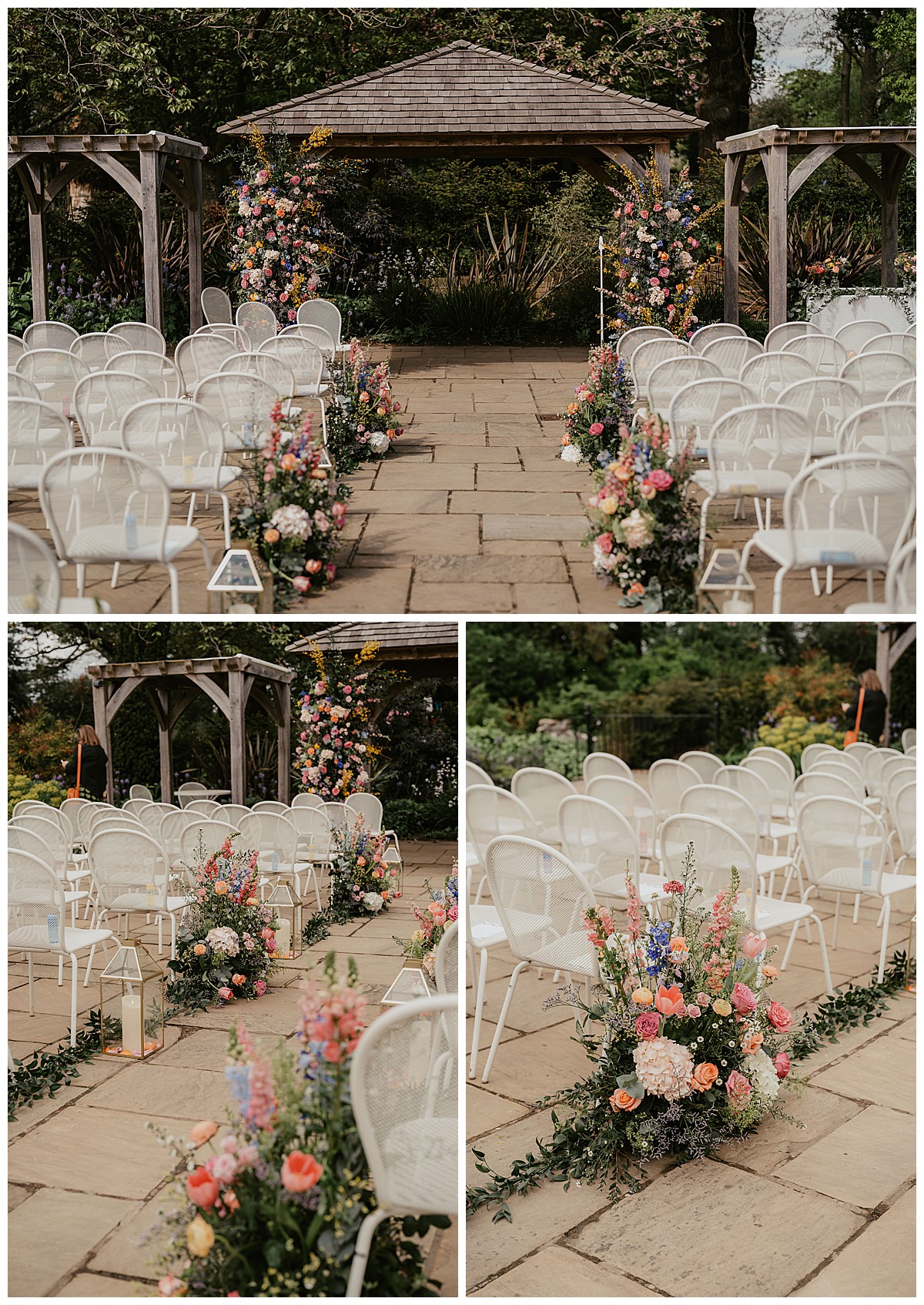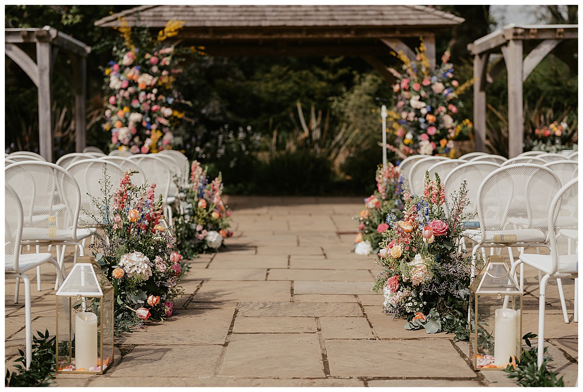 For the ceremony area we dressed the outdoor wedding oak pavilion with 2 freestanding floral towers which could have been positioned indoors in case of bad weather. Rather grand, they took 2 of us to even lift them in place before putting on the finishing touches.