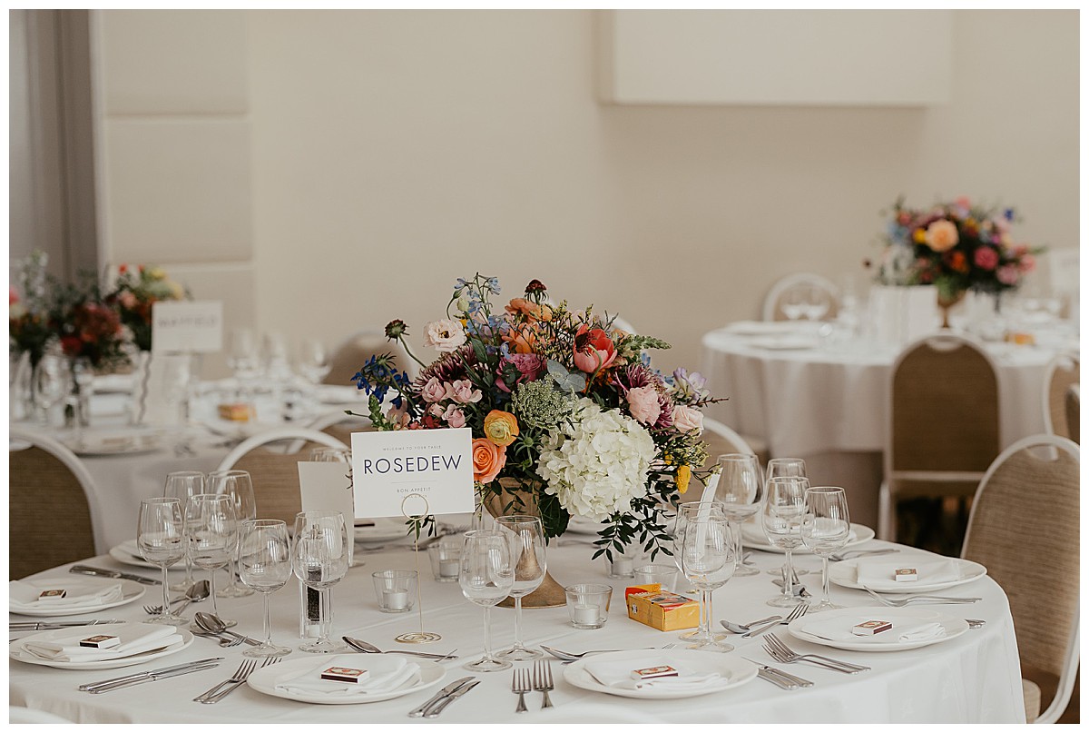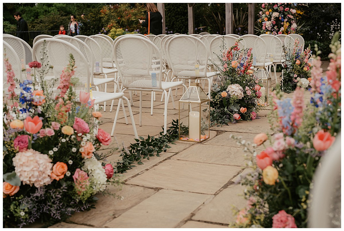 To create a beautiful wedding aisle for Laura, we added gorgeous flower meadows against every other row of seats, to line the wedding aisle, alternating with chair flower posies and gold lanterns on the in between rows. The ceremony table was styled simply with clusters of flower posies in bud vases, connected by a rustic eucalyptus garland.