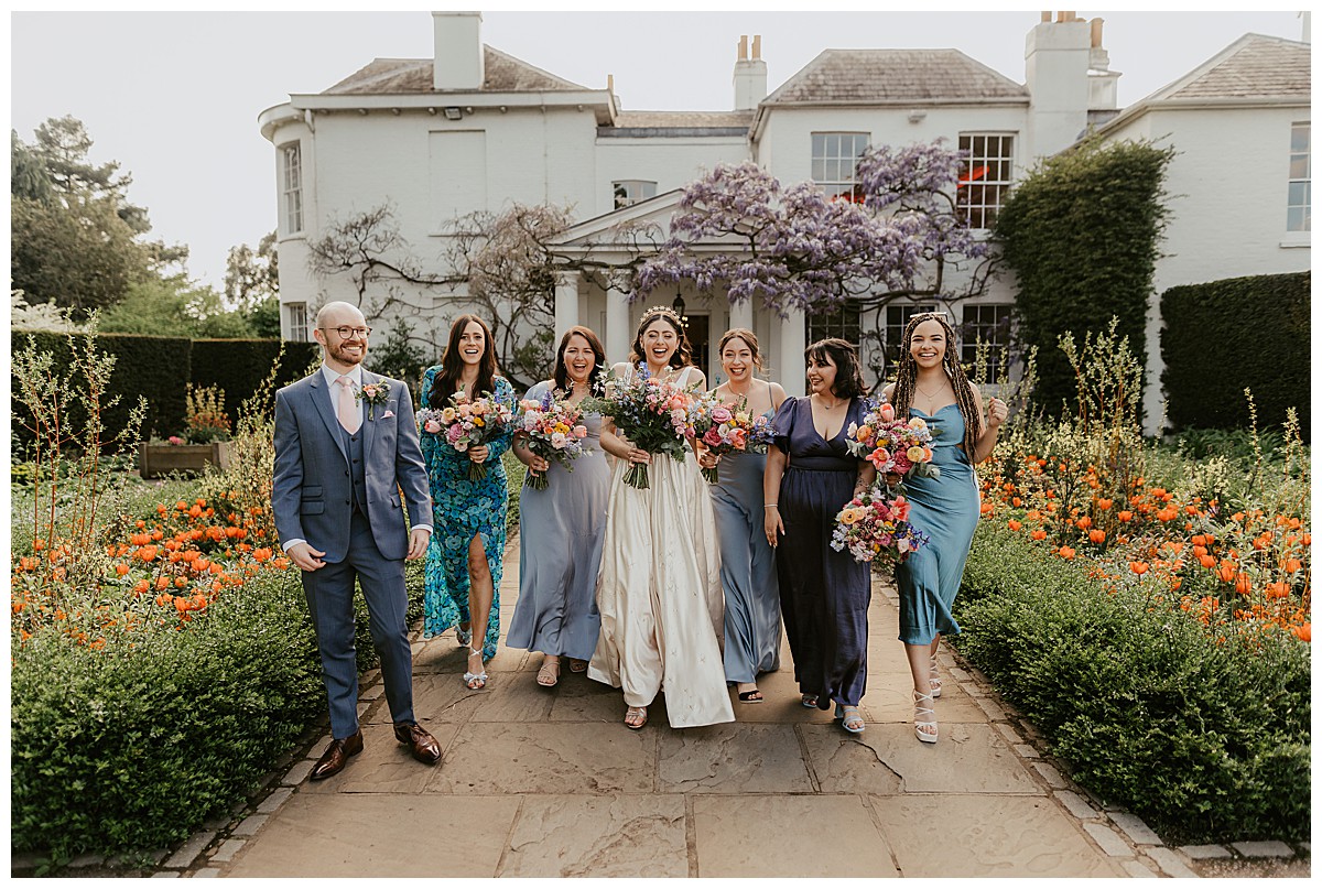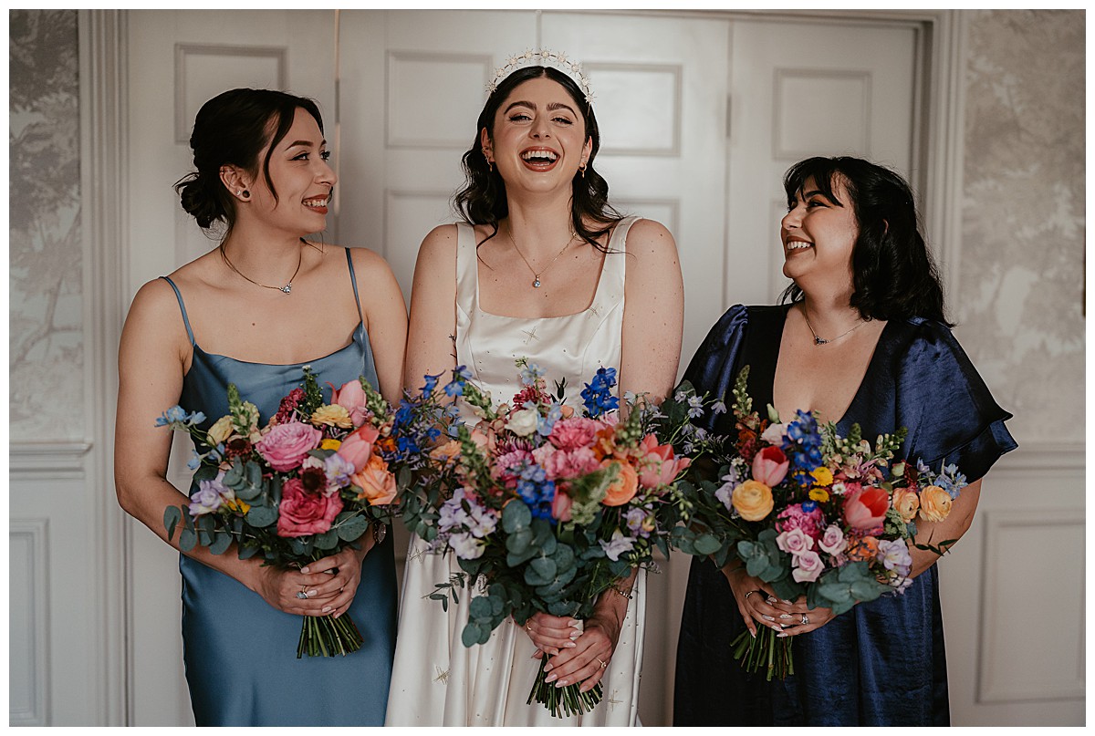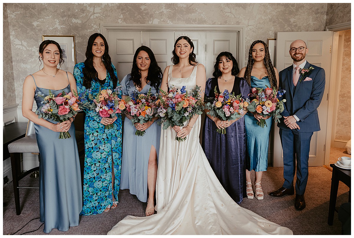 Laura and her five bridesmaids carried wild and unstructured bouquets with lots of colourful country garden blooms, including roses, delphiniums, scented stocks, lisianthus, snapdragons, wild fennel, larkspur and many more flower varieties, all in a blend of colourful and uplifting shades, which looked lovely against their blue-toned dresses. The brides’ best male friend had a matching colourful rustic buttonhole to match the other buttonholes.