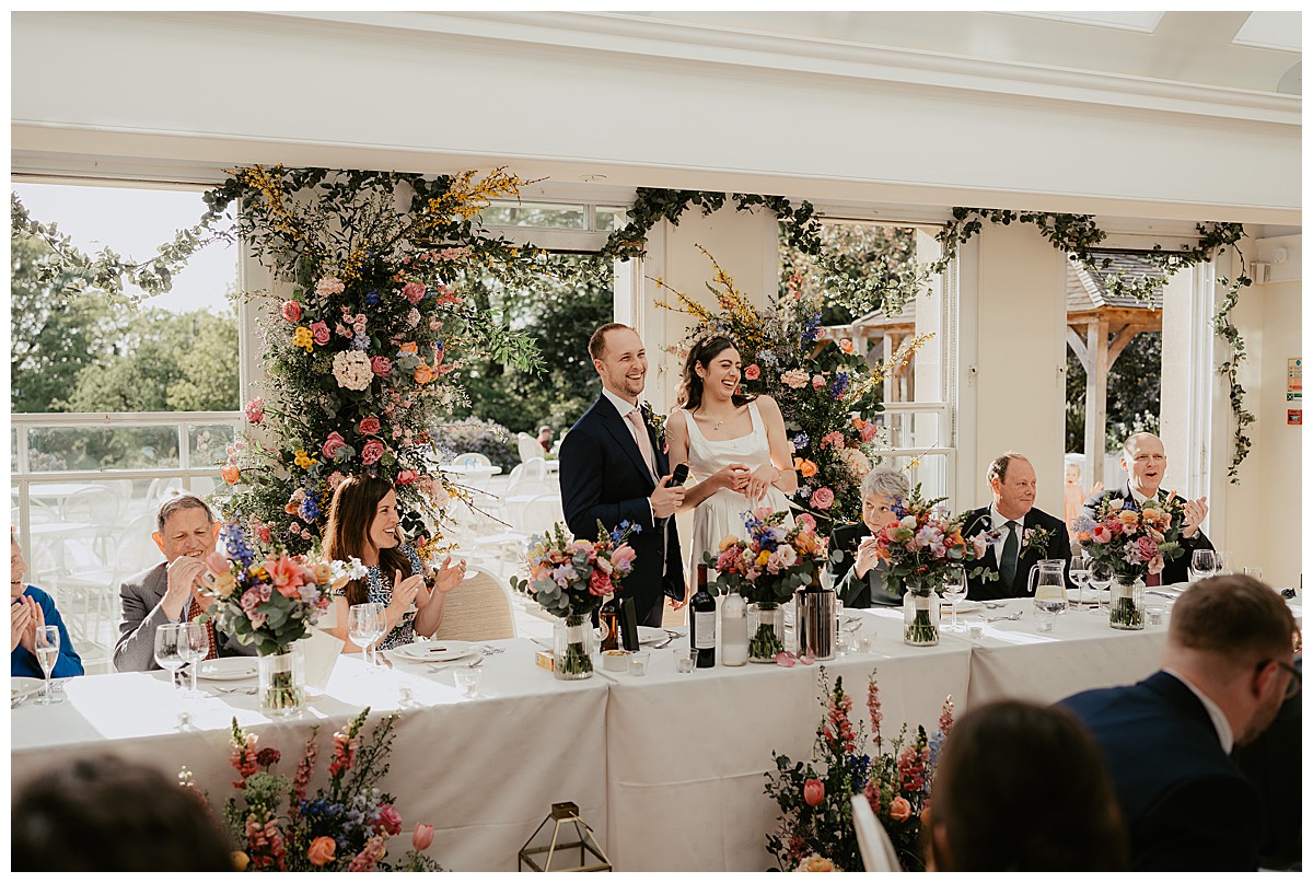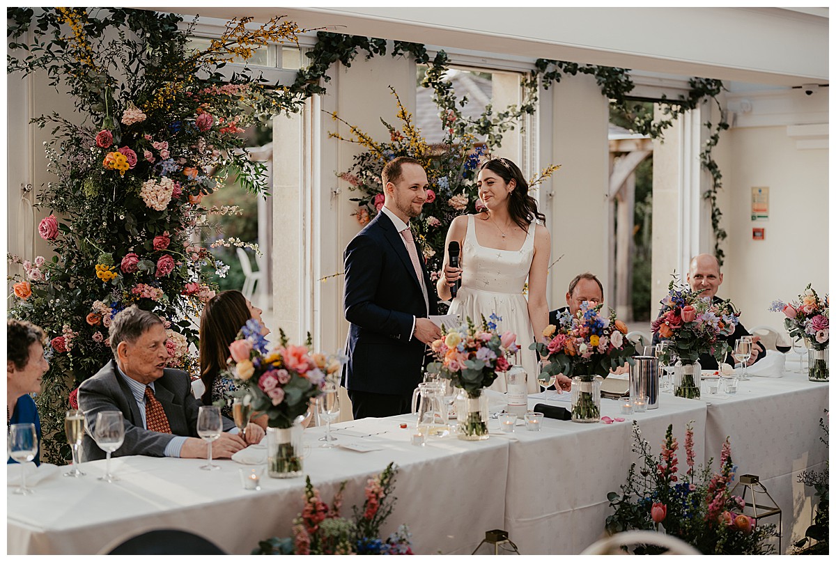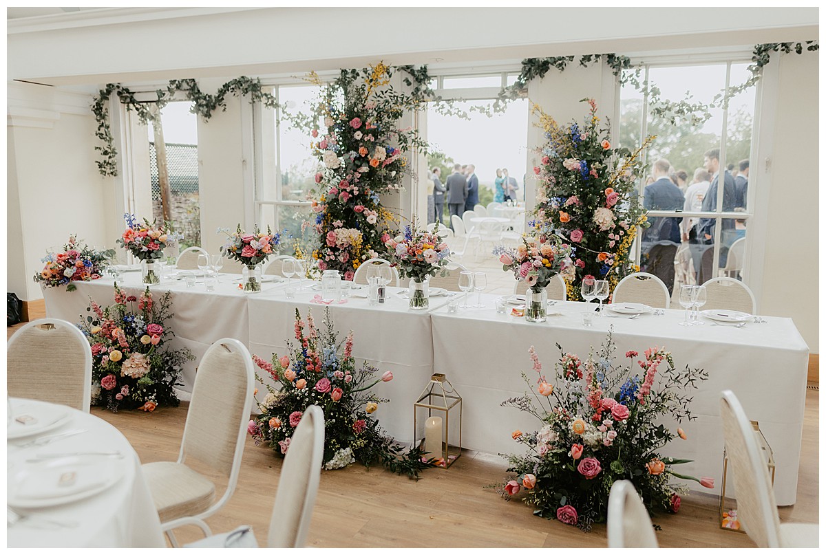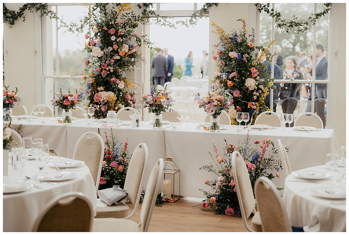 It brought a lot of joy to be able to make such good use of all these beautiful flowers later on in the day once the ceremony had finished: the floor meadows were reused at the bottom of the long top table and the floral pillar towers were repurposed cleverly from the oak pavilion to behind the top table, creating a beautiful backdrop to the fun and laughter-filled speeches. The loose and bloomy bridal and bridesmaids bouquets were also cleverly repurposed to add flowers to the top table and finally, even the the chair posies were reused to dress some of the round guest tables. The remaining round guest tables were dressed with opulent gold rose bowls bursting with colourful summer flowers. The textures throughout were really glorious and the mix of garden style flowers and wilder meadow blooms was really successful, really bringing nature to the inside space.