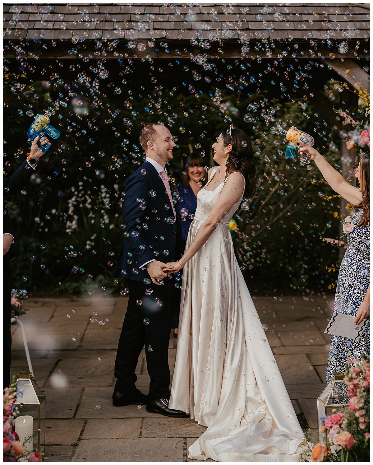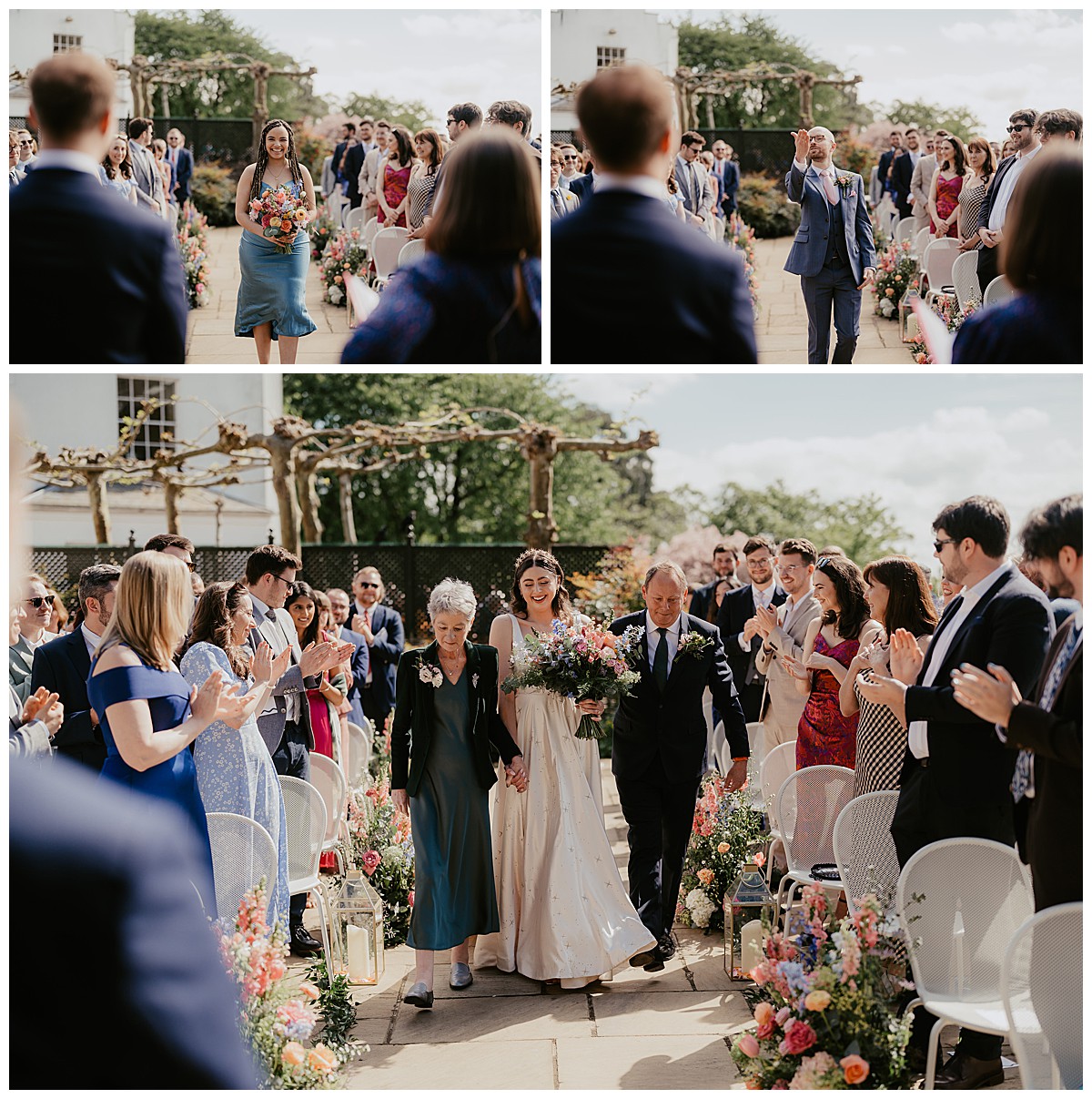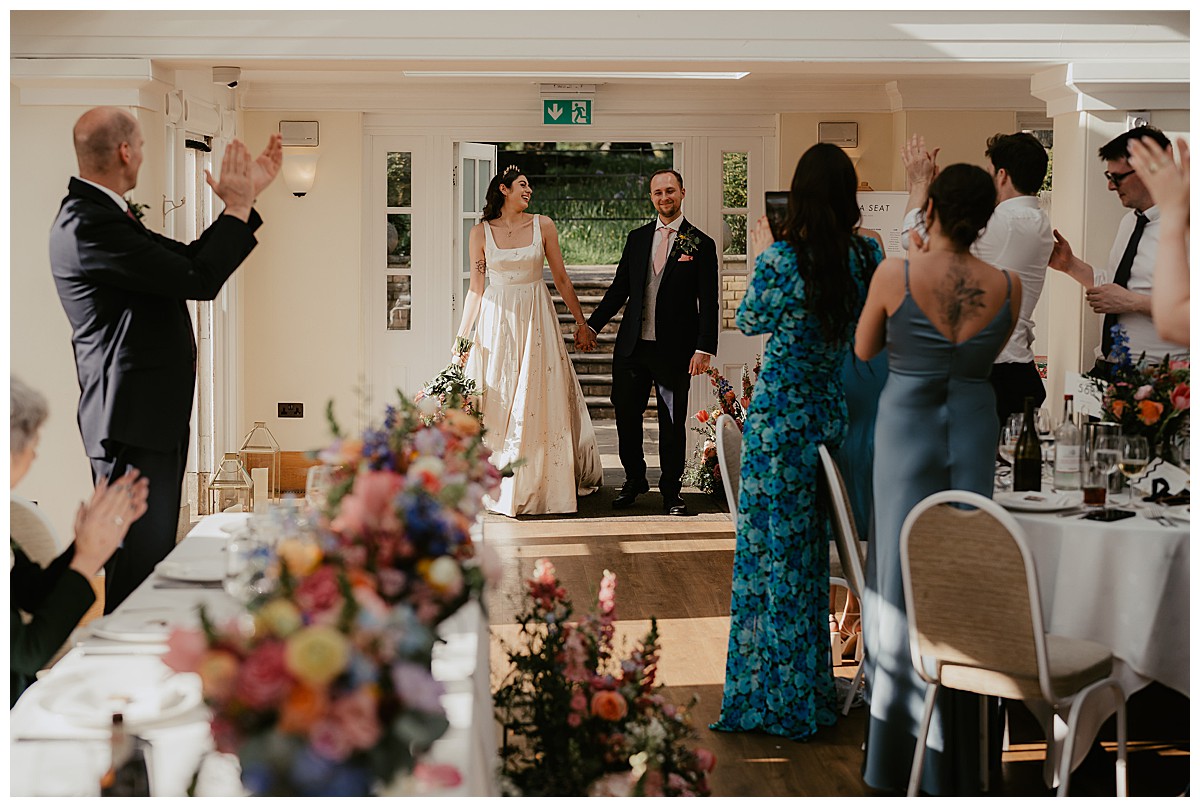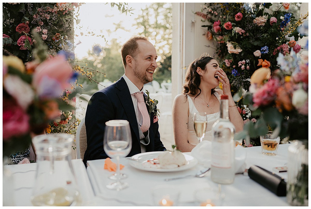 It brought a lot of joy to be able to make such good use of all these beautiful flowers later on in the day once the ceremony had finished: the floor meadows were reused at the bottom of the long top table and the floral pillar towers were repurposed cleverly from the oak pavilion to behind the top table, creating a beautiful backdrop to the fun and laughter-filled speeches. The loose and bloomy bridal and bridesmaids bouquets were also cleverly repurposed to add flowers to the top table and finally, even the the chair posies were reused to dress some of the round guest tables. The remaining round guest tables were dressed with opulent gold rose bowls bursting with colourful summer flowers. The textures throughout were really glorious and the mix of garden style flowers and wilder meadow blooms was really successful, really bringing nature to the inside space.