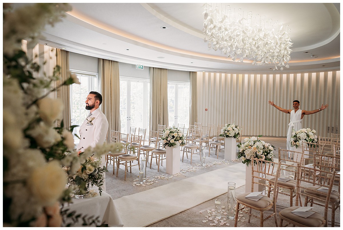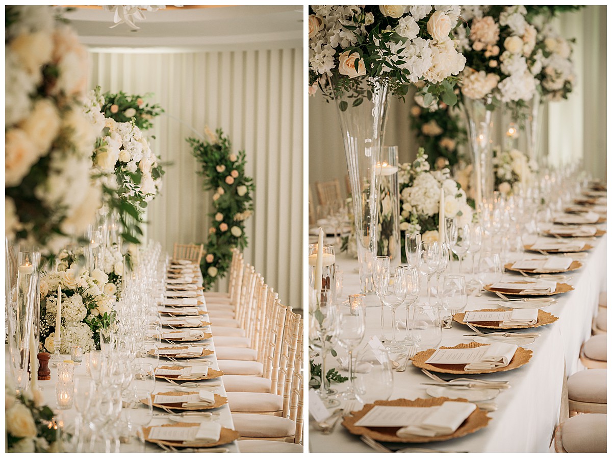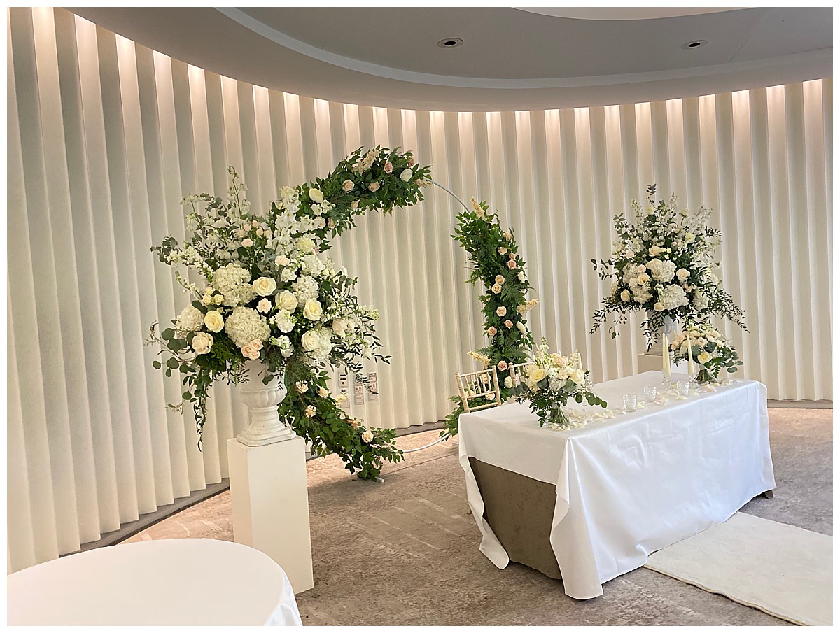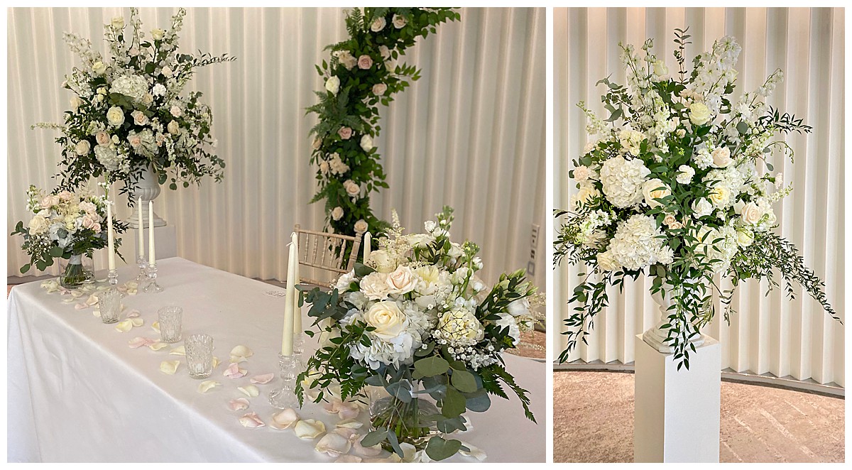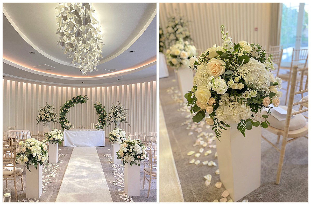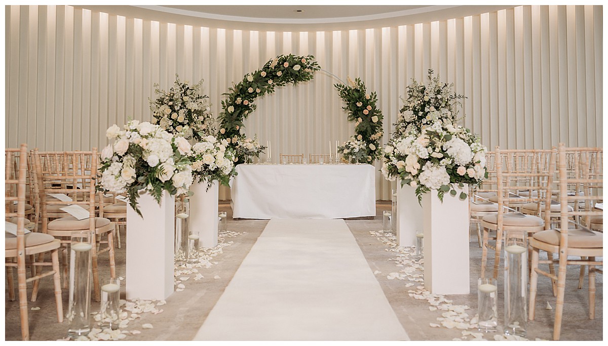 The wedding ceremony florals were stunning, with a beautiful flower lined aisle, casting a fabulous scent as guests walked past them, to take their seats. At the front, two statement floral urns framed an equally impressive floral moongate arch, which combined and amplified one another, creating a fabulous backdrop to the wedding. The ceremony table was dressed with natural, romantic style vases and candlesticks. Floating candles and rose petals down the aisle completed this elegant decor and created the perfect ambiance for this amazing luxe wedding.