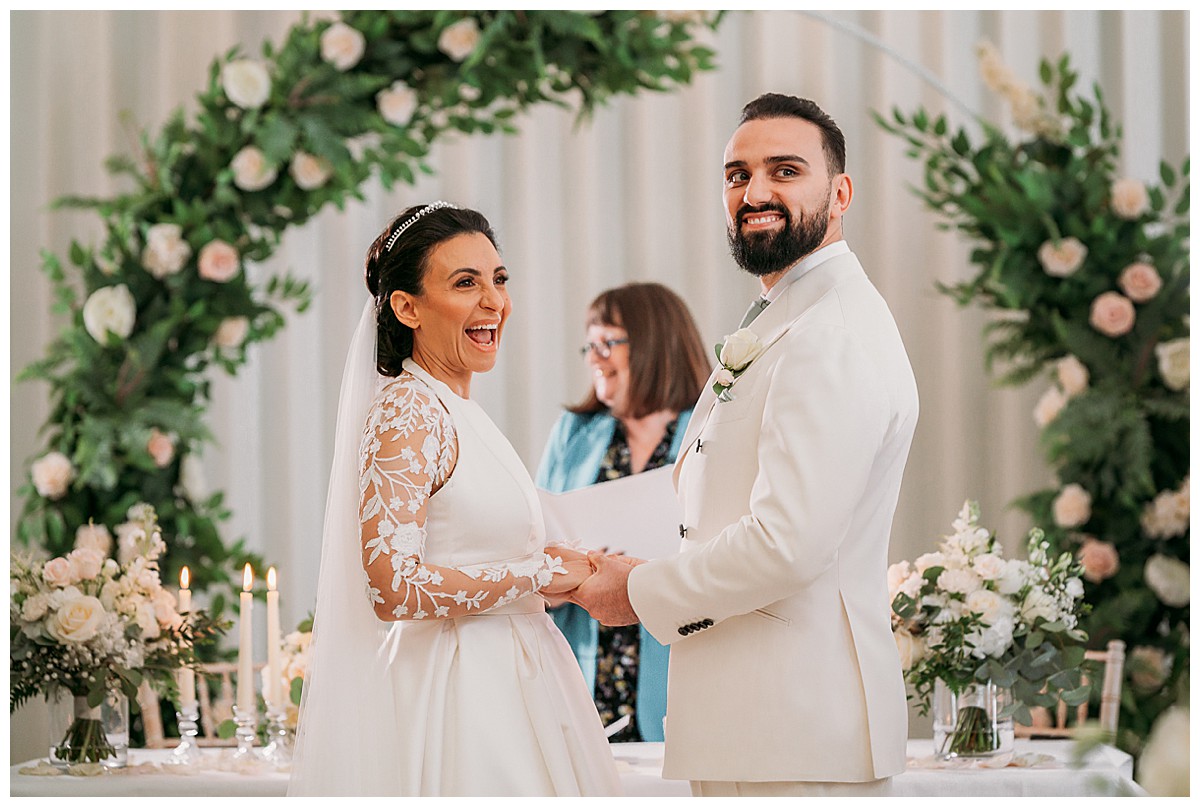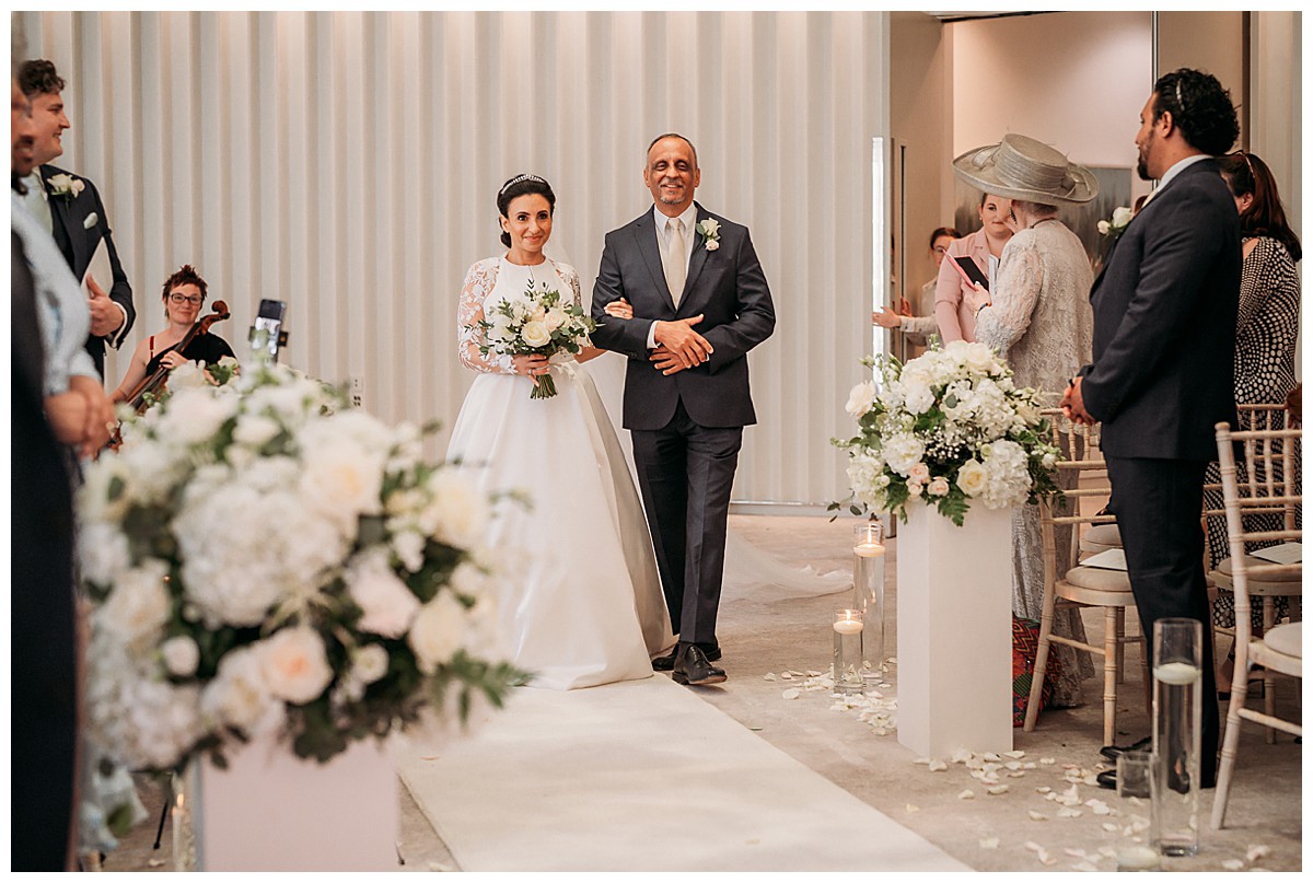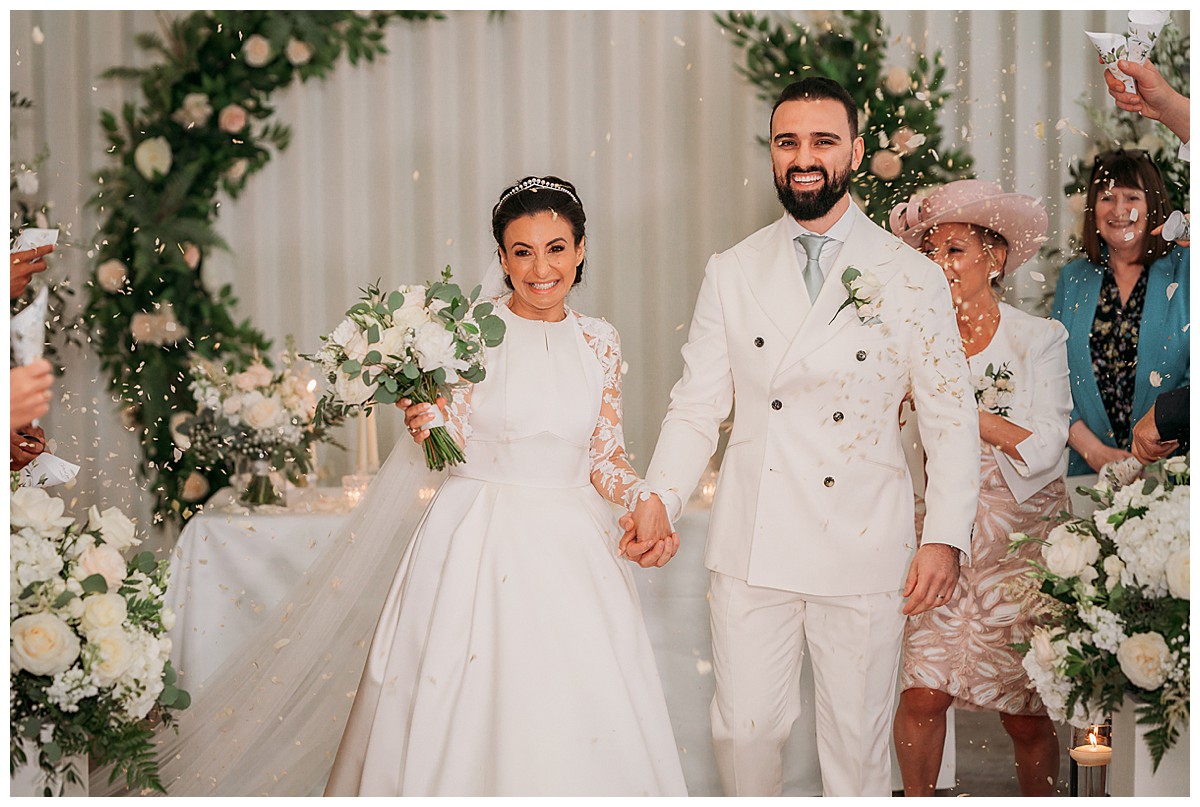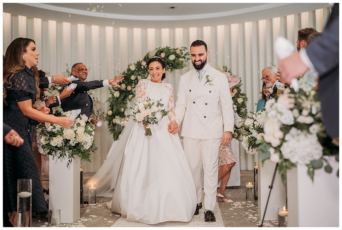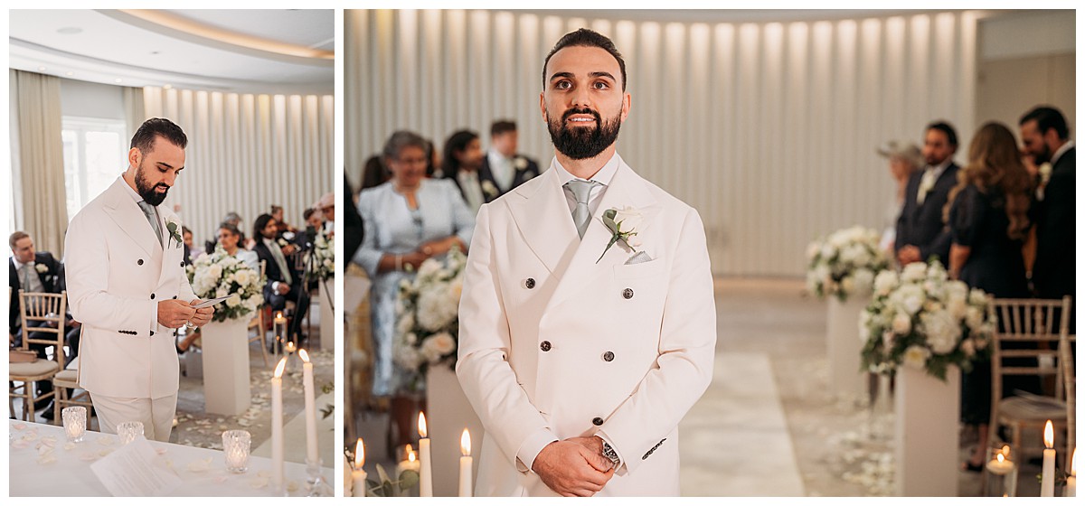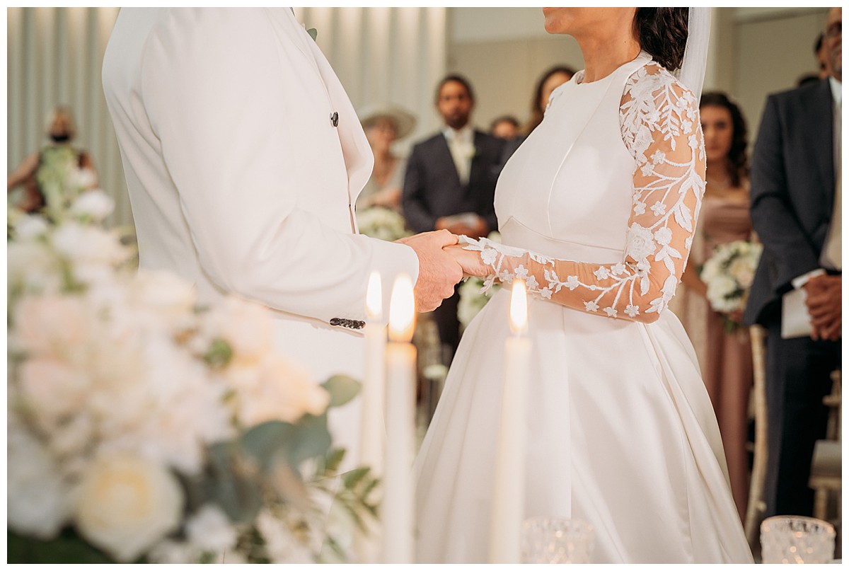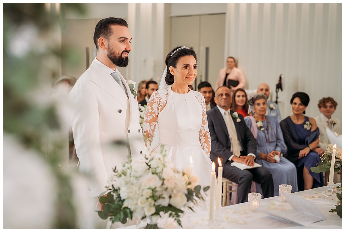 The wedding ceremony florals were stunning, with a beautiful flower lined aisle, casting a fabulous scent as guests walked past them, to take their seats. At the front, two statement floral urns framed an equally impressive floral moongate arch, which combined and amplified one another, creating a fabulous backdrop to the wedding. The ceremony table was dressed with natural, romantic style vases and candlesticks. Floating candles and rose petals down the aisle completed this elegant decor and created the perfect ambiance for this amazing luxe wedding.