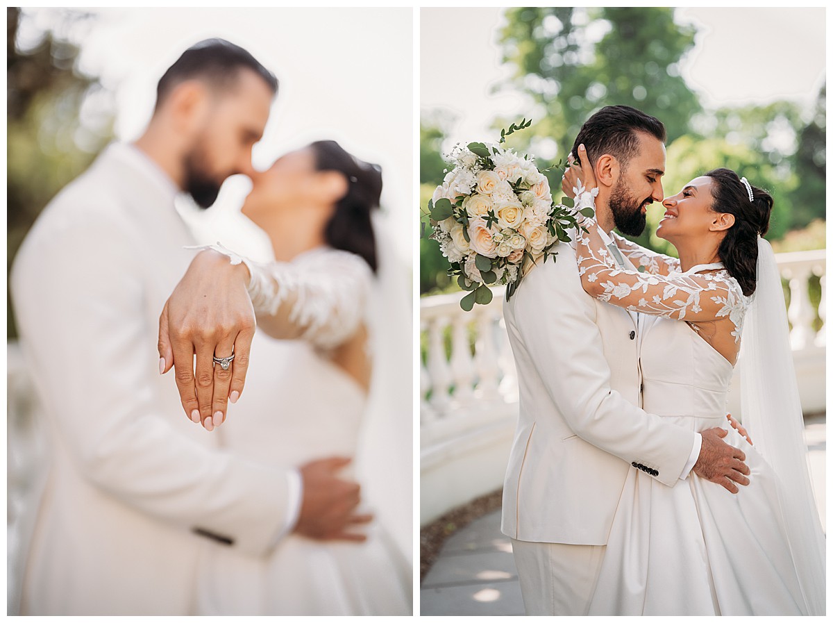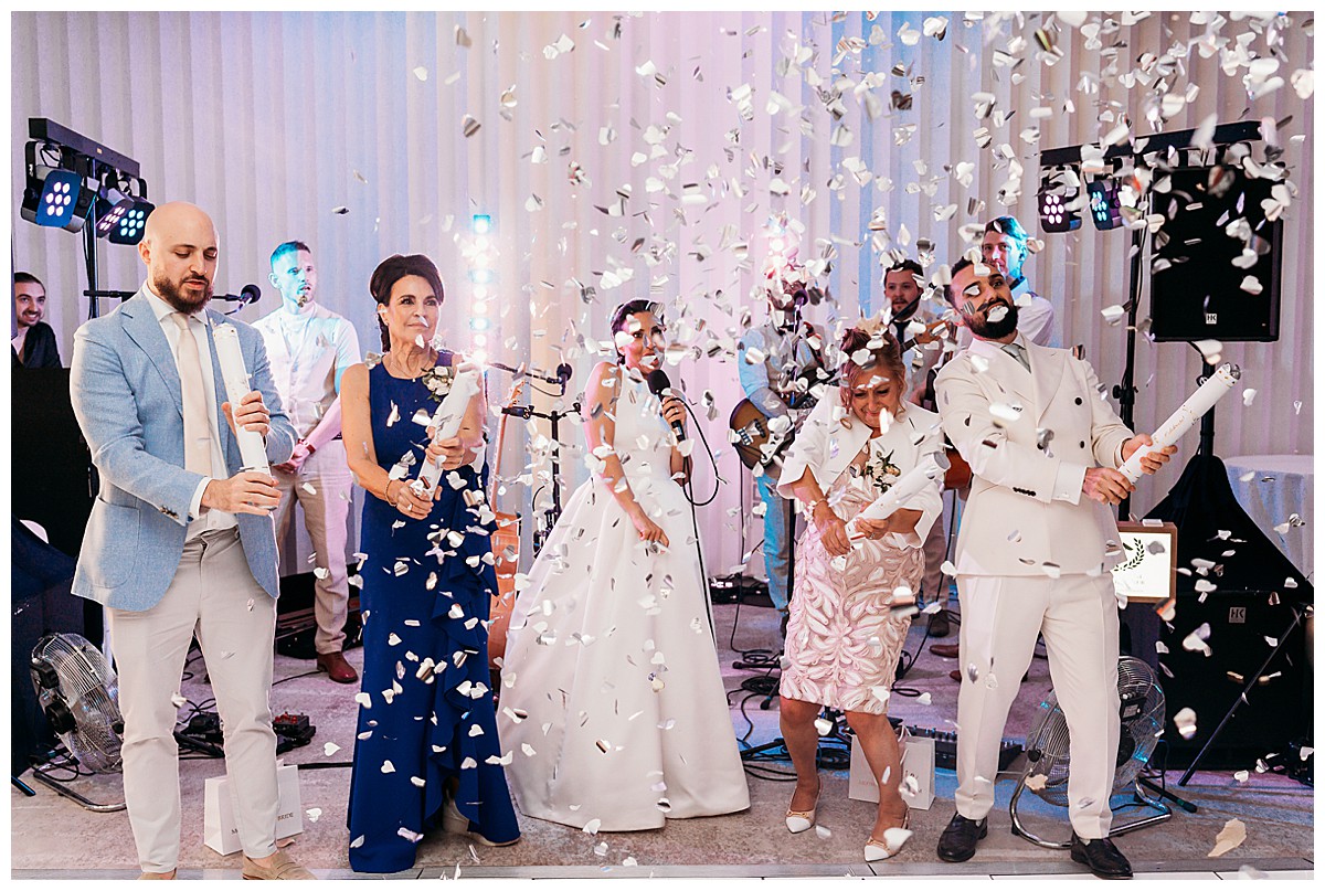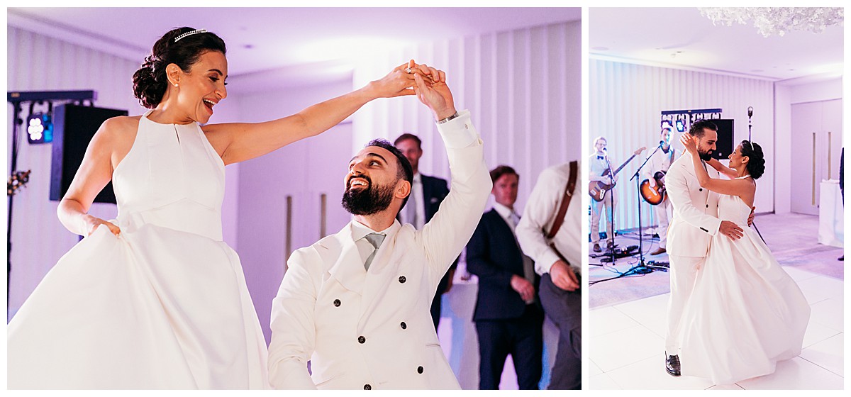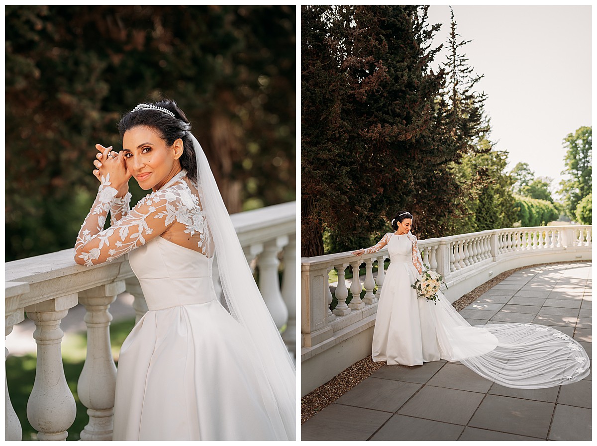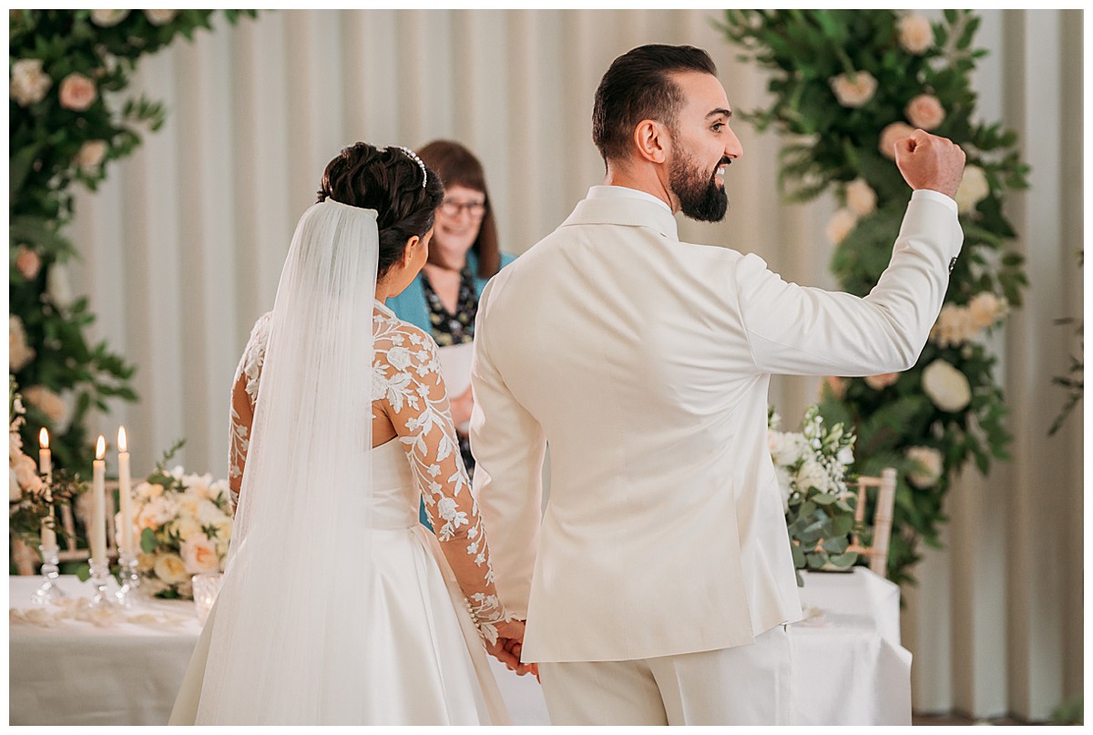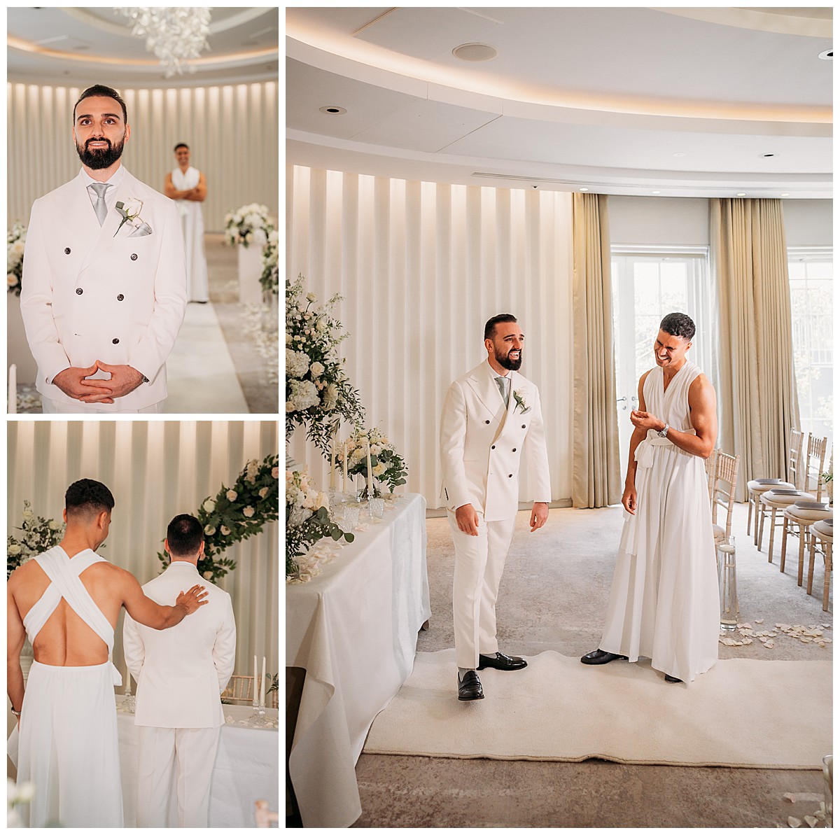 The wedding ceremony florals were stunning, with a beautiful flower lined aisle, casting a fabulous scent as guests walked past them, to take their seats. At the front, two statement floral urns framed an equally impressive floral moongate arch, which combined and amplified one another, creating a fabulous backdrop to the wedding. The ceremony table was dressed with natural, romantic style vases and candlesticks. Floating candles and rose petals down the aisle completed this elegant decor and created the perfect ambiance for this amazing luxe wedding.