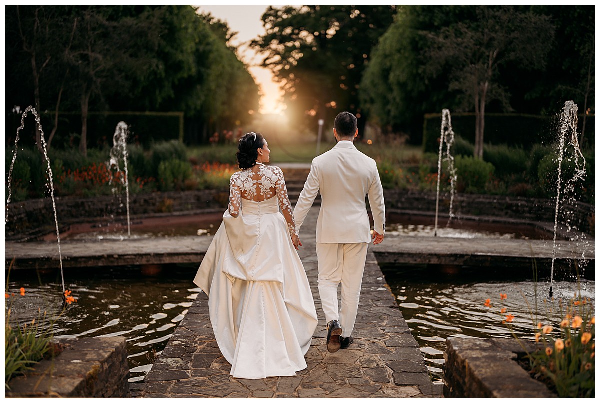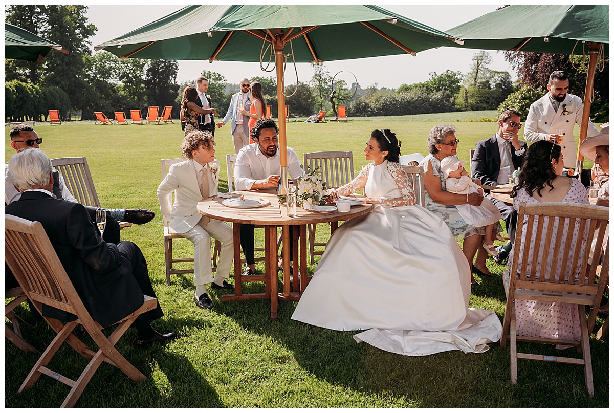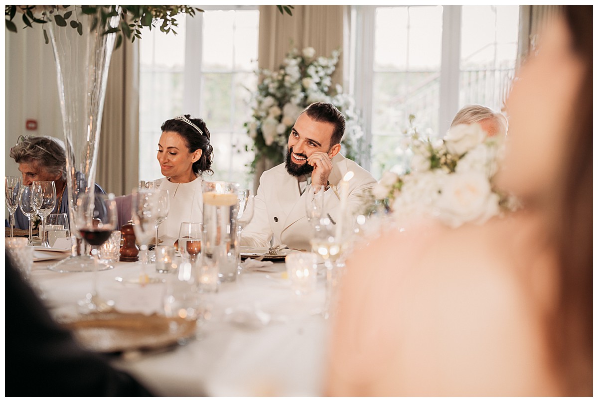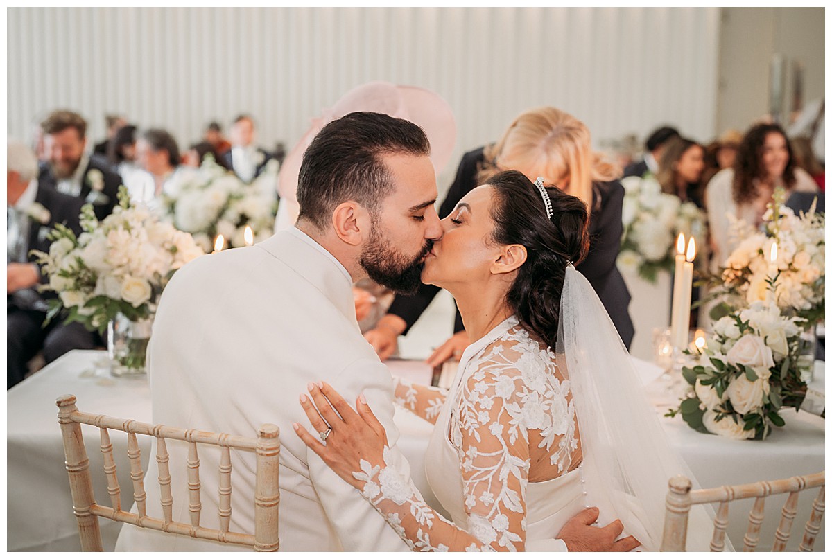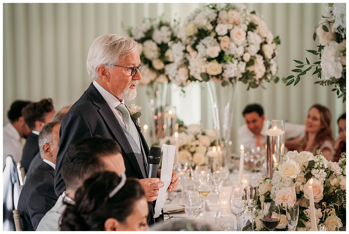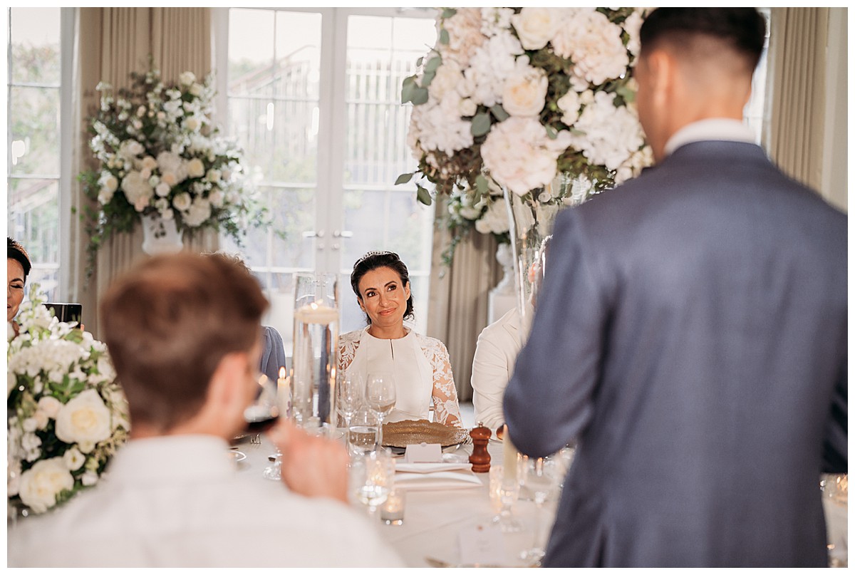 While the room was later turned around, the wedding party enjoyed the beautiful May day, over a drinks reception and garden games, and fabulous photos in the stunning gardens. Coming back inside, guests took their seats at a long banqueting tables dressed with statement tall vases bursting with textural summer blooms. The matching low floral domes from the wedding aisle were used to infill the space along the long table, and an abundance of candles and elegant gold charger plates, completed the carefully curated decor. Everything combined to create the most gorgeous atmosphere for their day and it was such a true pleasure and honour to be part of their wedding day. I hope you enjoy these beautiful photos, thanks to talented Zanela & Rad husband & wife photographer team from True Lens Art photography.
